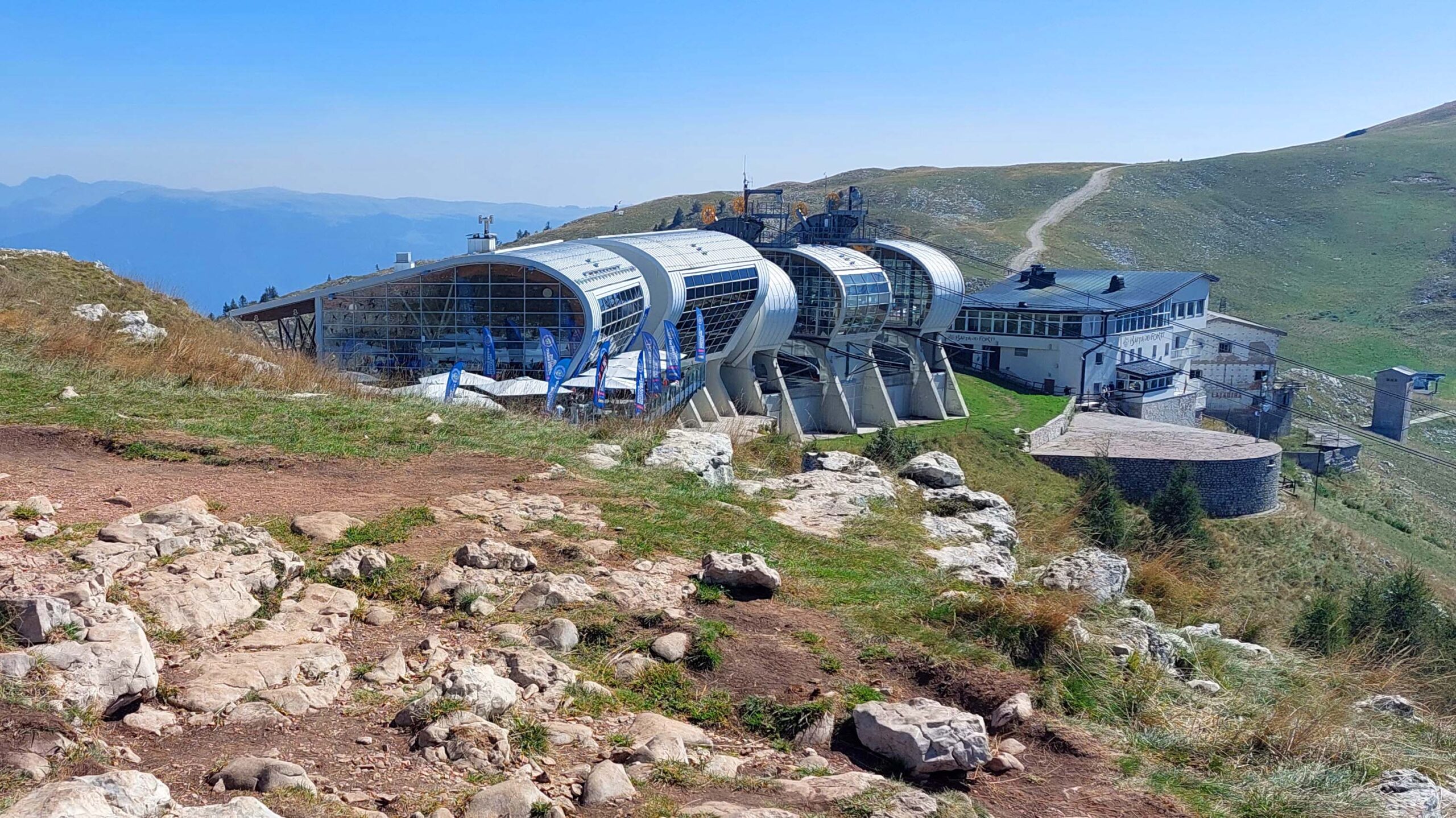 Die „Funivia Malcesine-Monte Baldo“ 🚡 ist nur 250 Meter von der Touri-Info entfernt. Sie bringt mich in 20 Minuten auf den grandiosen Monte Baldo. Und was für ein Wunder, ich stehe nur 14 Minuten für ein Ticket (🎫 fast 30 €) an. „Dann bekomme ich sicher noch die Bahn um