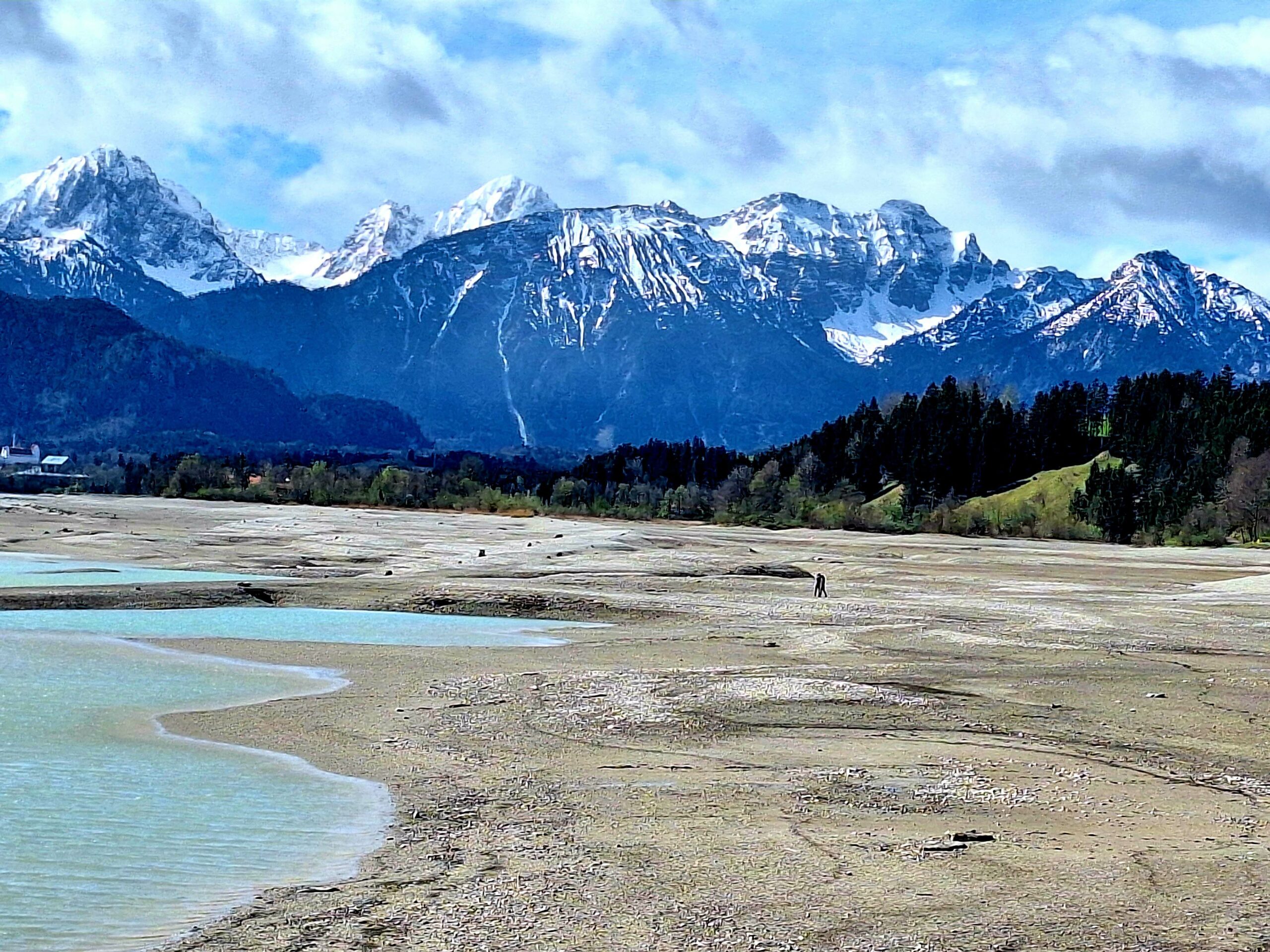 Auf der B17 fahre ich zuerst noch zum Forggensee – einem künstlich angelegten Stausee. Ich parke Fiete bei Rieden und laufe ein paar hundert Meter zum See. Da stehe ich nun und bin fassungslos. Vom Wasser im See, so wie ich ihn kenne, kaum eine Spur. Ja, was ist denn hier bloß passiert. Später lese ich, dass das Wasser jedes Jahr im Oktober abgelassen wird, um im Frühjahr das Schmelzwasser aus den Bergen aufzunehmen.