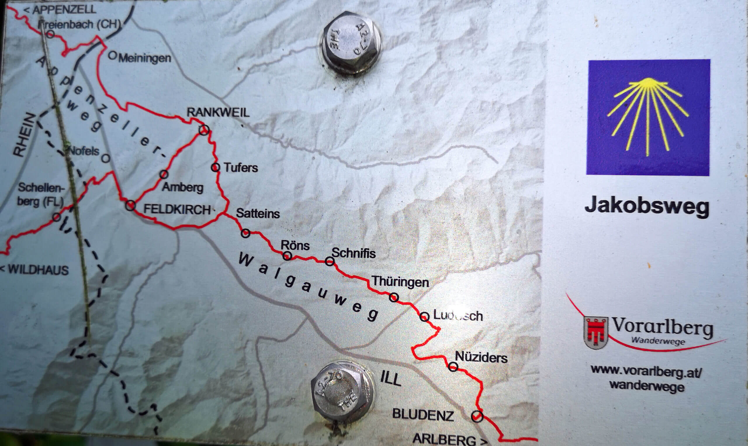 Auf dem Rückweg zum Bahnhof stoße ich mal wieder auf einen Jakobsweg. Durch Feldkirch führt der „Landeck-Einsiedelei-Weg“. Er ist genau 197 km lang.