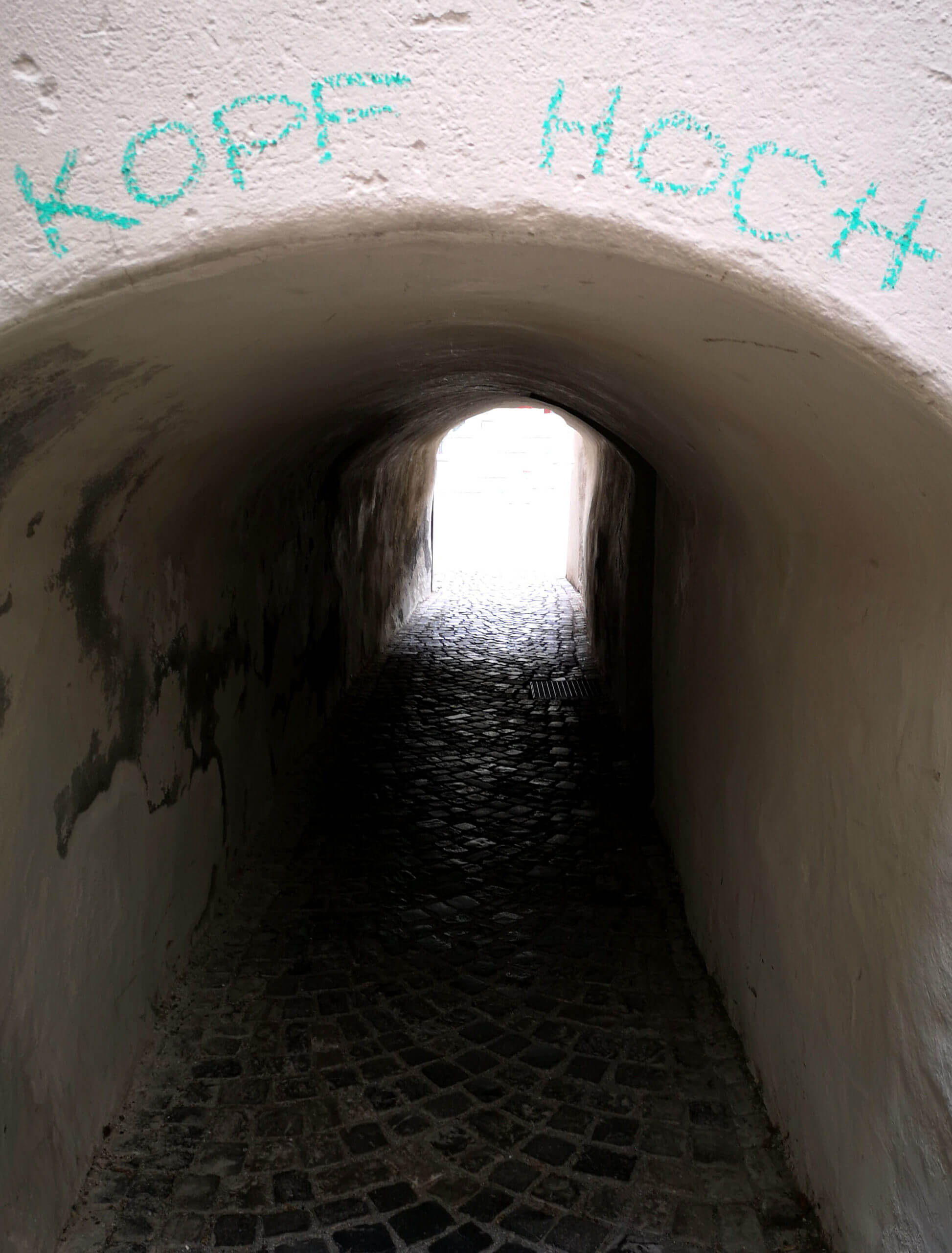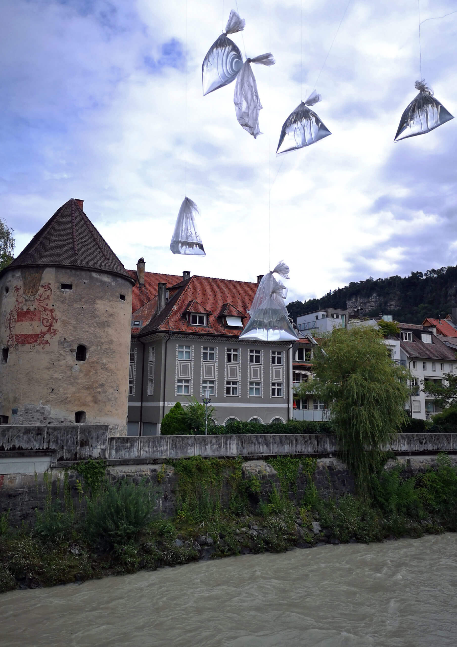 Die charmante Stadt ist wirklich ein bauliches Juwel. Ich komme am bemalten Rathaus vorbei, der alten Johanniterkirche am Ende der Marktgasse, am Kapuzinerkloster und der Villa Claudia, dem heutigen Standesamt von Feldkirchen. Am Ardetzenberg wird sogar Wein angebaut. Über die Ill führt ein neuer Holzsteg und ich entdecke ‚Kunscht‘ gegenüber des Wasserturms.