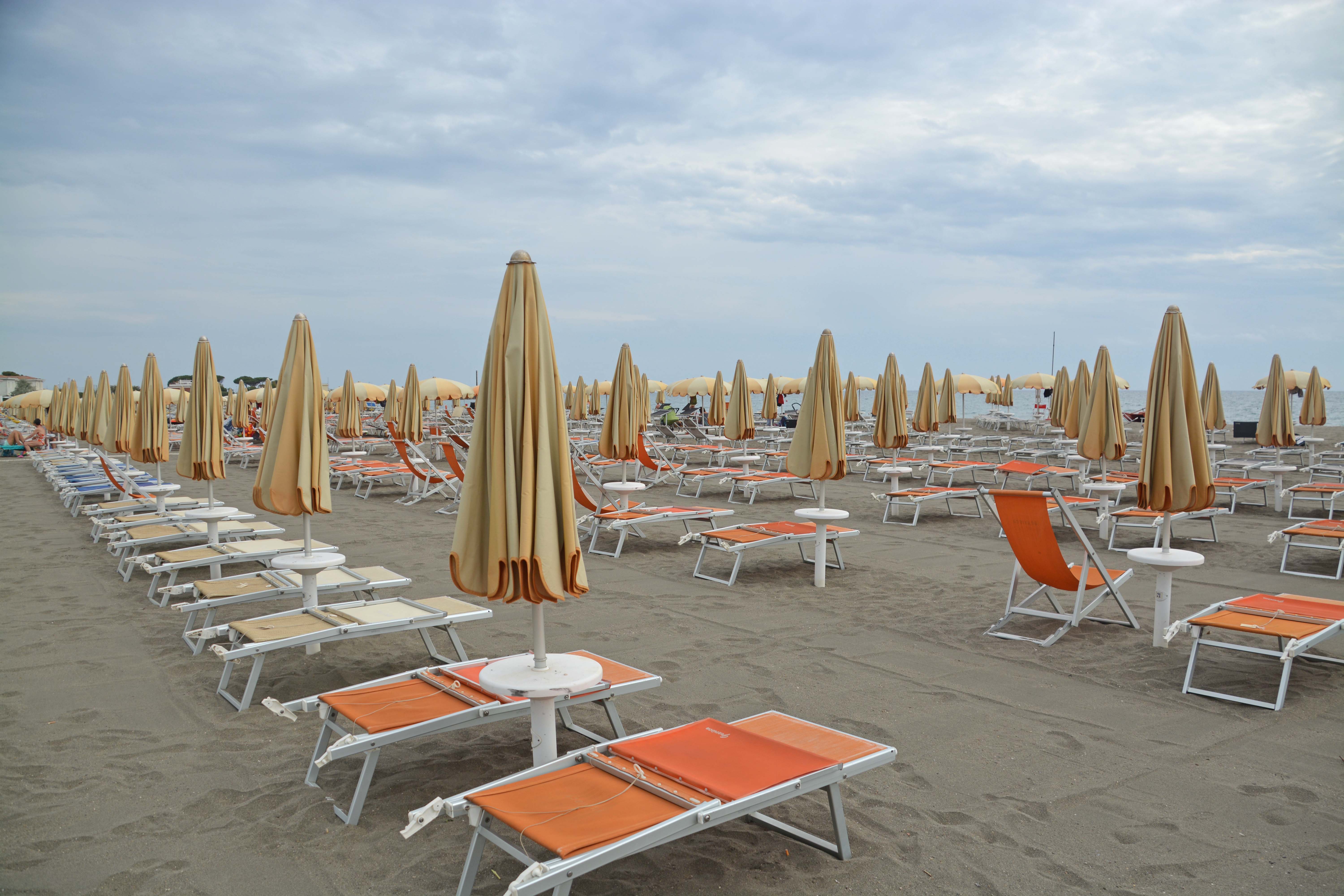 Wir befinden uns an mindestens einem 2km langen Bagnio-Strand, Liegestuhl an Liegestuhl, Sonnenschirm an Sonnenschirm, alles pikobello hergerichtet. Was fehlt, sind die Urlauber. Wir genießen caffè und Cappu in einer Strandbar und schlecken ein Eis zu total normalen Preisen.