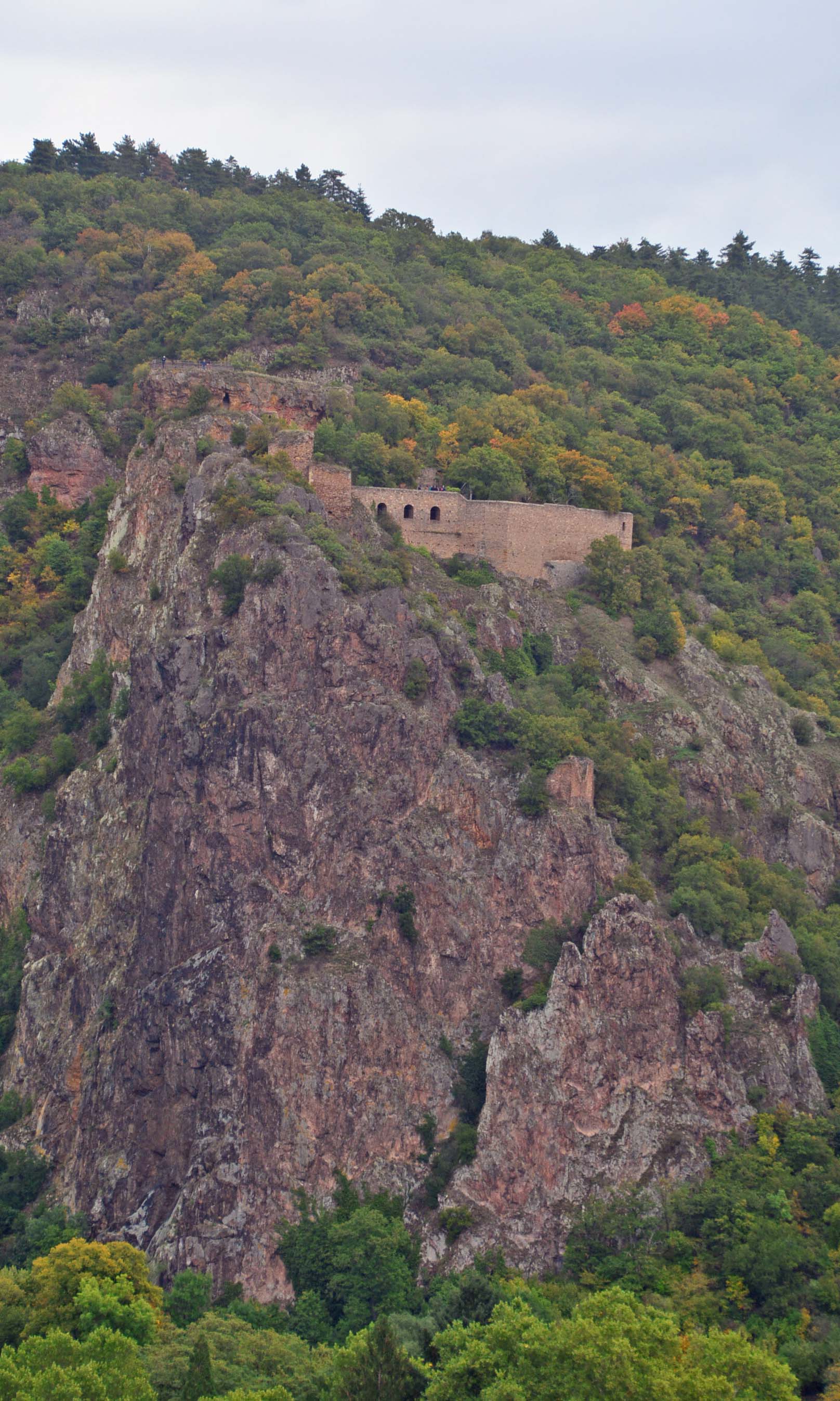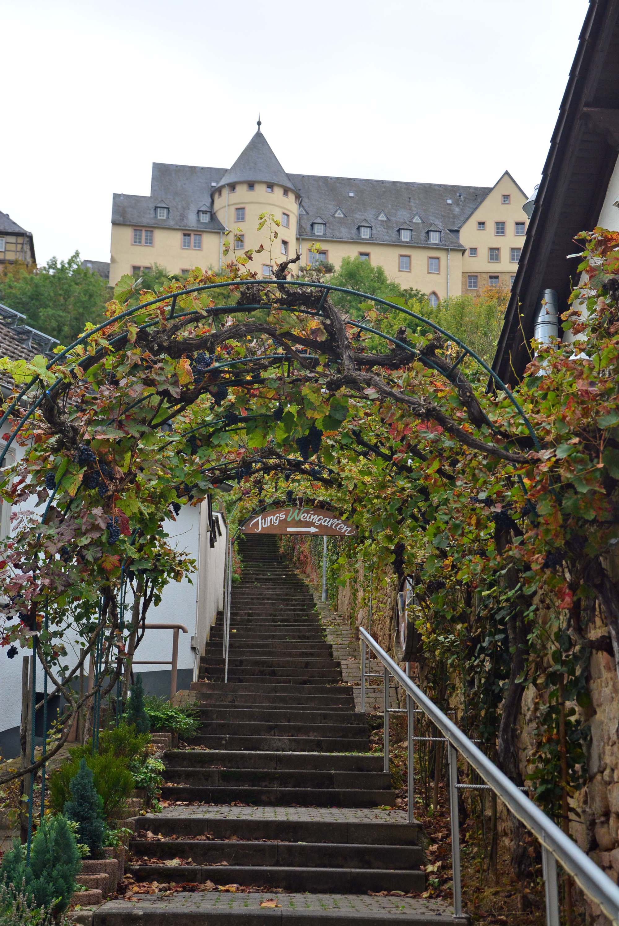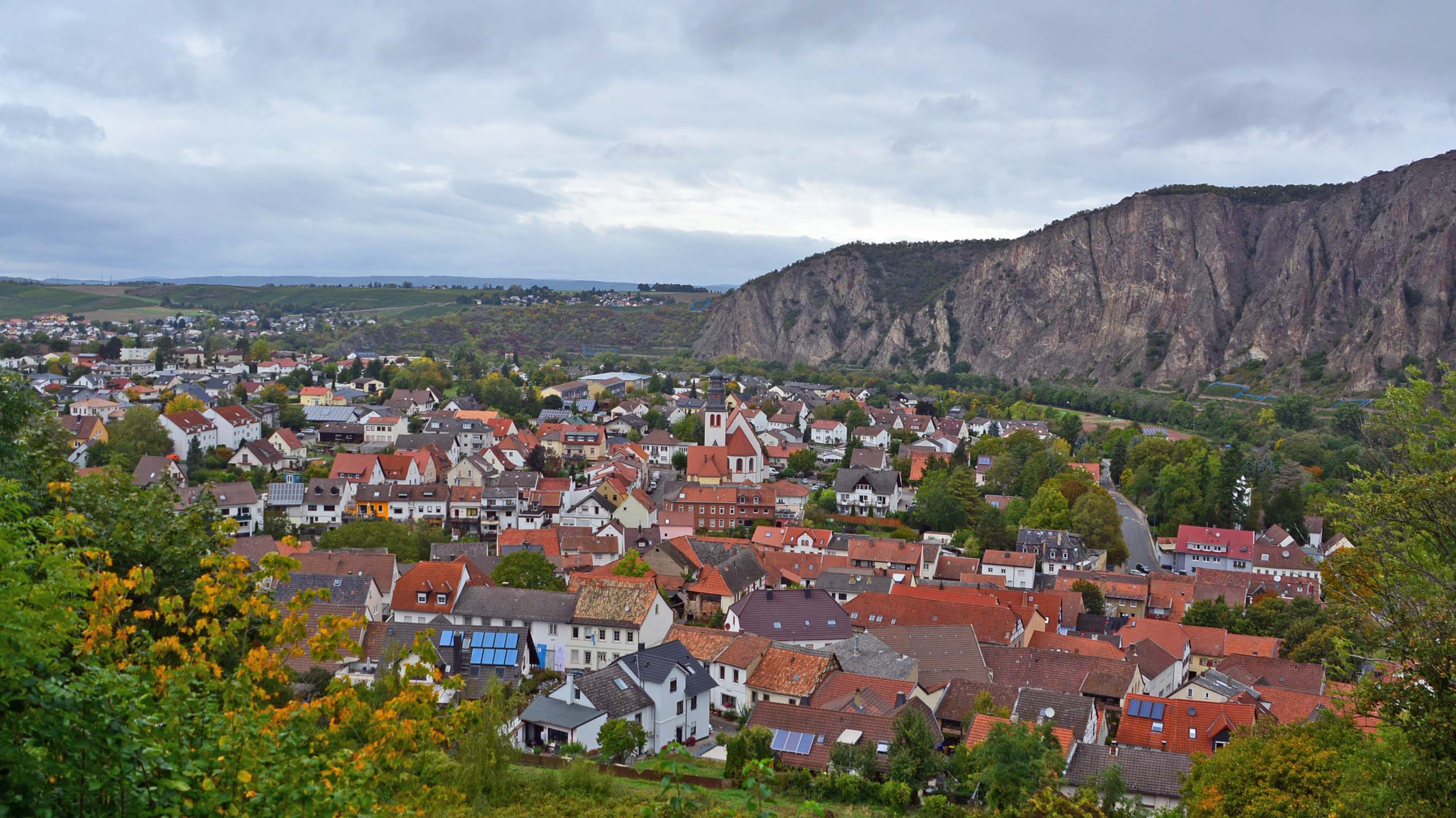 Wir frühstücken auf der Womo-Terrasse zusammen mit Grau-Reihern und Kormoranen bei Sonne und Wolken. Bis der Rest der Freunde eintreffen, vertreiben H. und ich uns die Wartezeit mit einem Spaziergang zur Ebernburg. Es geht durchs historische Zentrum von Bad Münster mit zahlreichen Weingütern und einer langen Treppe, die direkt zur Aussichtsplattform der Burg führt. Von hier bietet sich uns ein grandioser Blick über den Ort, die spektakulären Felsformationen und die Weinberge. Der Rotenfels hat seinen Namen von der rötlichen Südwestwand. Die Wandflucht ist 1200 m lang, 202 m hoch und gilt als höchste Felswand zwischen den Alpen und Skandinavien. Ein begehrtes Ziel von erfahrenen Kletterern. Die Burgruine Rheingrafenstein liegt versteckt auf einer 136 m hohen Porphyr-Felsformation. Durch Weinberge und einen Park laufen wir vorbei an einer alten Weinpresse und zurück zum Womo.