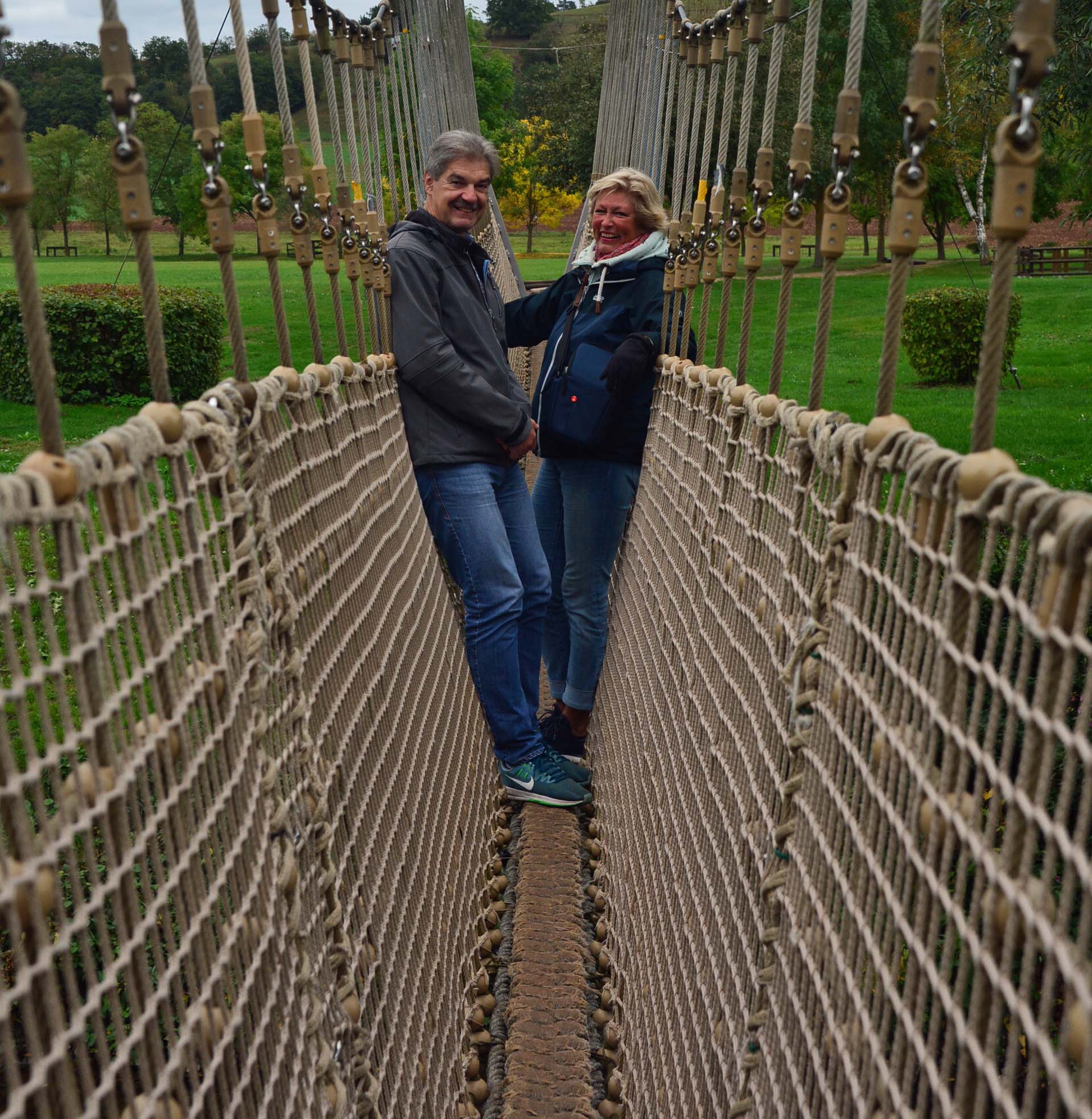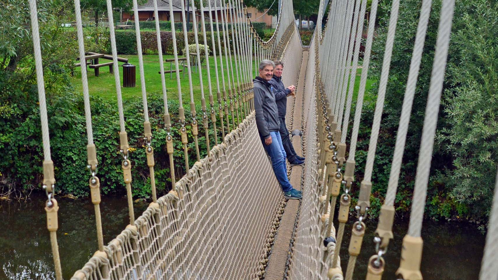 Unsere Autofahrer treffen wir in einer mega tollen Konditorei. Nachdem wir Torten und Suppe geschlemmt und viel gequatscht haben, schauen die Radler sich Bad Sobernheim an. Die Autofahrer entscheiden sich für das Freilichtmuseum. Auf dem Radrückweg machen wir Halt am Barfußpfad, H. läuft barfuß und Thomas, Klaus und ich testen die 40 Meter lange Hängebrücke.