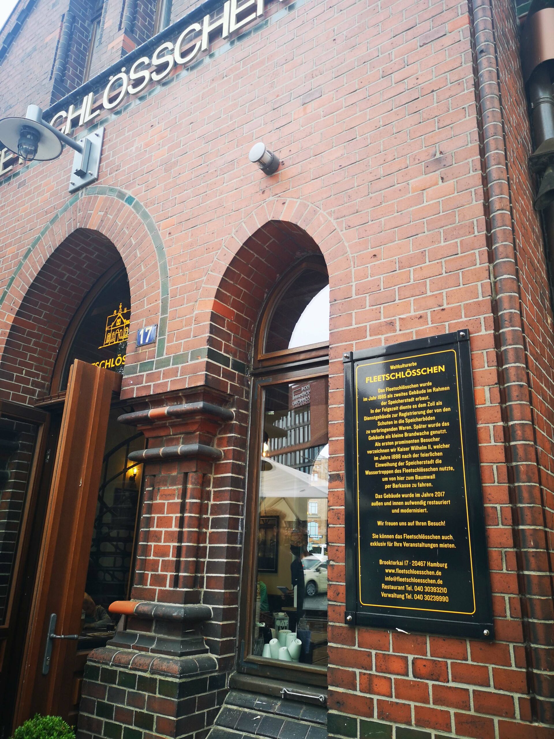 Ich habe noch Zeit und da die ‚Mö‘ unmittelbar in der Nähe des Rathauses liegt, stöbere ich ein weiteres Mal in den Geschäften. Und es zieht mich wieder in die Speicherstadt. Am Holländisch-Brook-Fleet steht eine ehemalige Zollwache, das kleine Fleetschlösschen. Es ist denkmalgeschützt und gehört zum Weltkulturerbe. Von einem ehemaligen Toilettenhäuschen entwickelte sich das historische Gebäude zur „Kaffeeklappe“, einem einfachen Lokal für Hafenarbeiter, bevor die Brandwache hier einzog. Zwischenzeitlich ist es ein Cafè und Bistro. Übrigens, schon Kaiser Wilhelm II war 1888 zur feierlichen Einweihung der Speicherstadt hier.