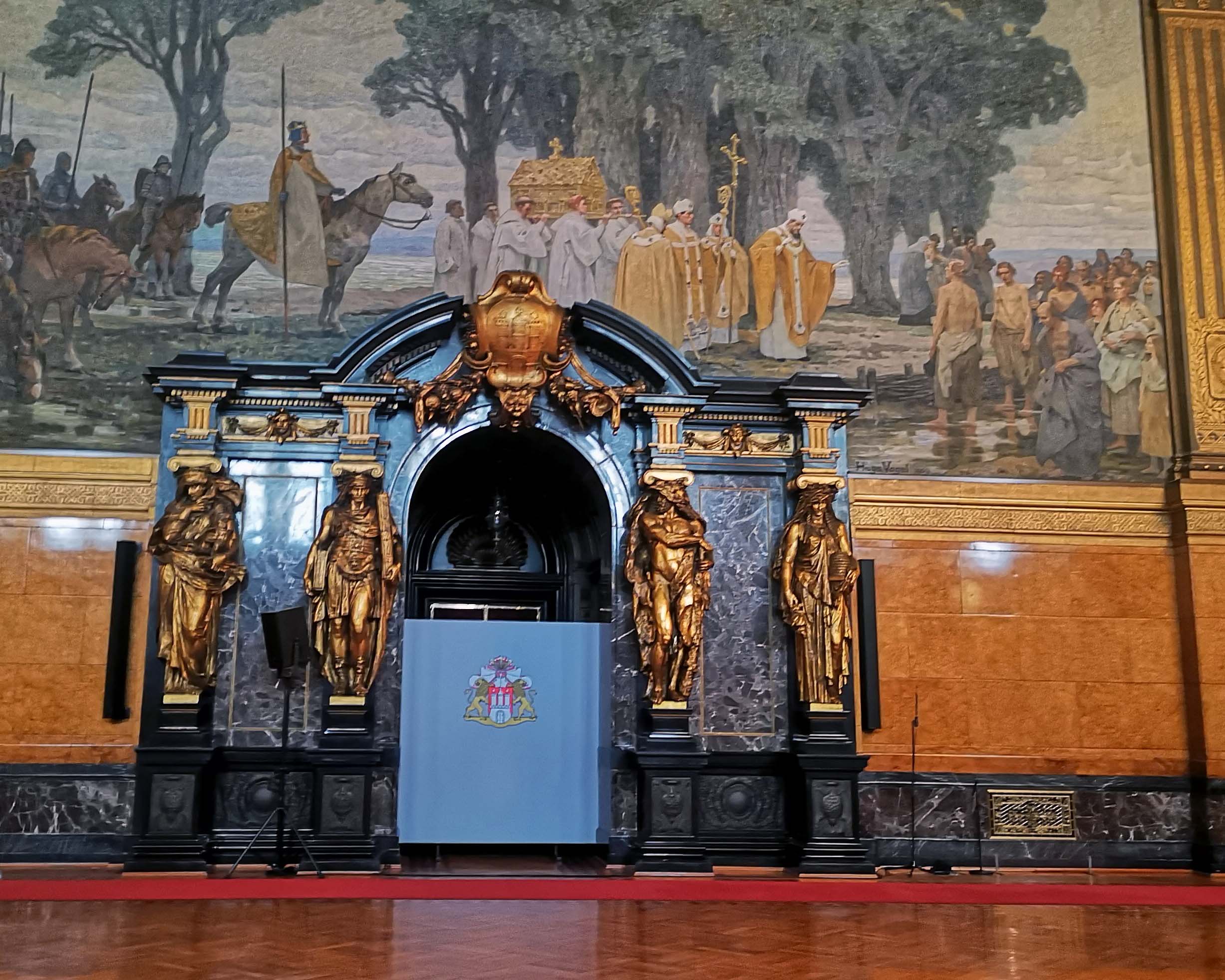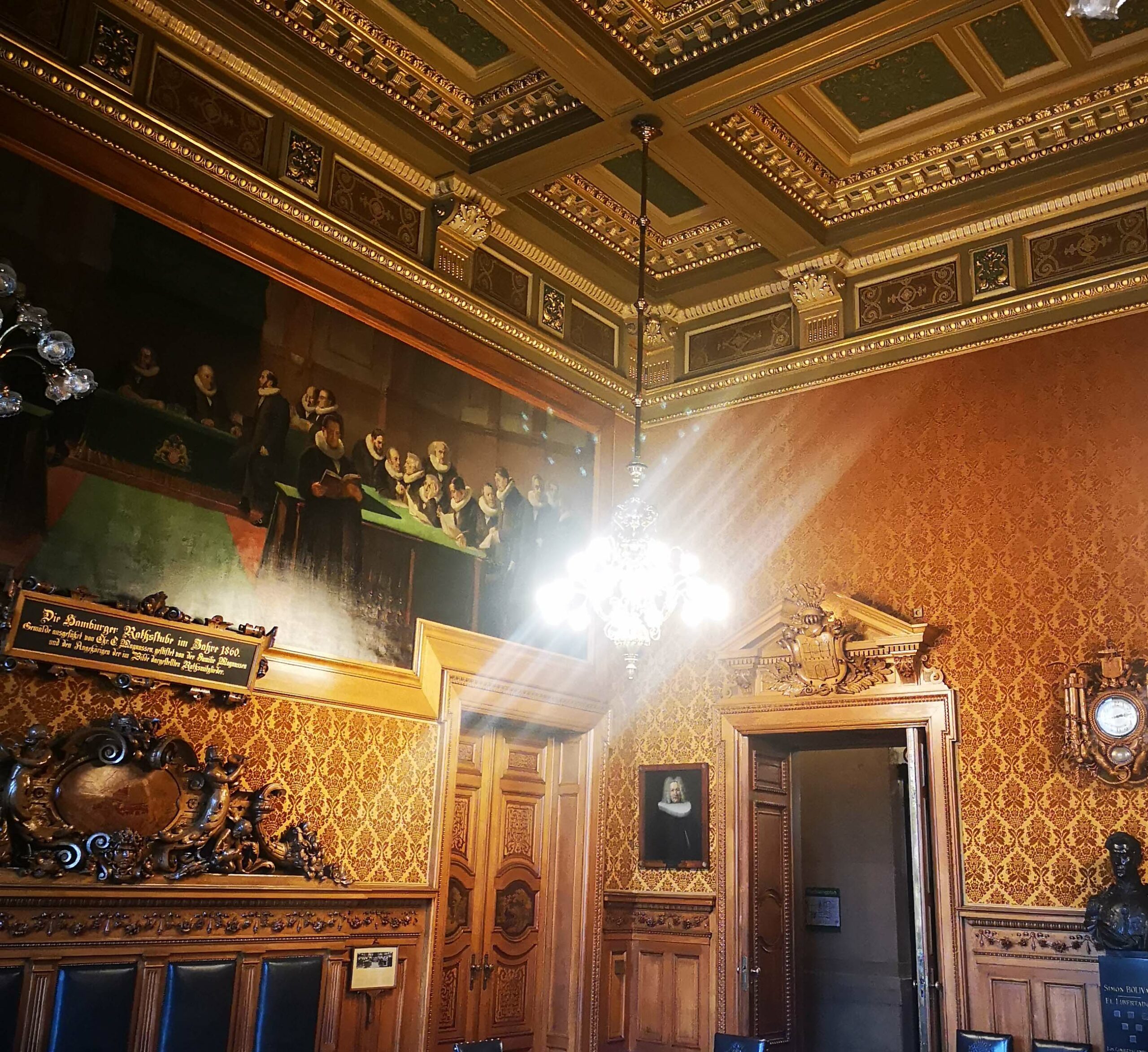 Wir besichtigen den eher schlichten Empfangssaal der Bürgerschaft, den Kaisersaal – benannt aufgrund des Besuchs von Kaiser Wilhelm II. zur Eröffnung des Nord-Ostsee-Kanals und den Bürgermeistersaal, wo sich Gäste in das Goldene Buch eintragen. Und nebenbei hören wir zahlreiche interessante Geschichten von unserem jungen Rathaus-Führer. Und jetzt wird’s imposant. Wir stehen im Großen Festsaal, den fünf gewaltige Gemälde, welche die Geschichte Hamburgs von 800 bis 1900 erzählen, schmücken. Die drei Lüster mit je 278 Lampen wiegen sage und schreibe je 1500 Kilo!