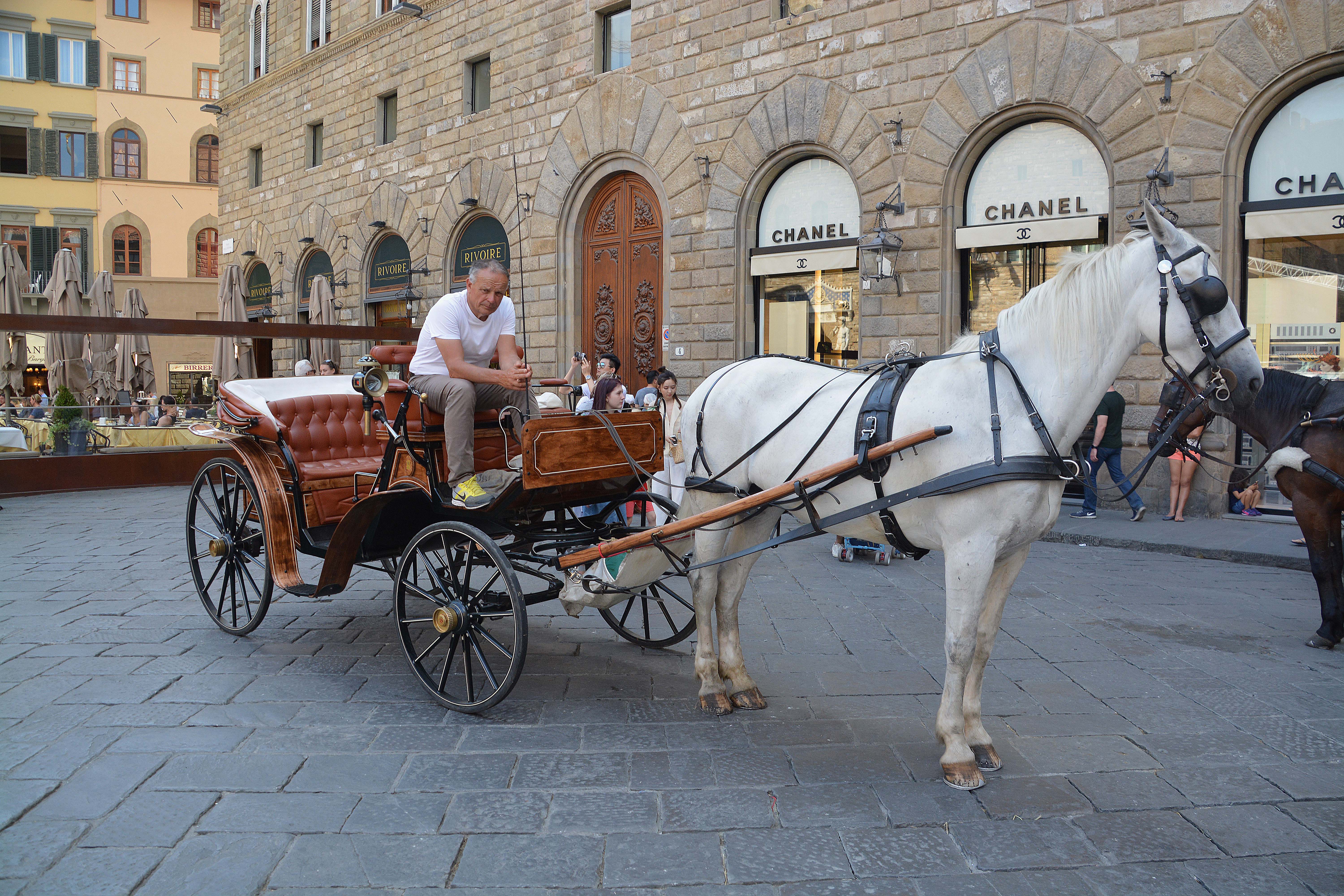 Auf der Via por S. Maria, einer angesagten Einkaufsstraße, suche ich nach einem Strohhut. Fehlanzeige. Dafür erreichen wir die Piazza d. Signoria mit dem Palazzo Vecchio. Viele, die sich unbedingt als Touri outen wollen, besteigen hier eine Pferdekutsche. Wir genehmigen uns statt dessen ein Bier, 1 ½ Liter Wasser, ein kleines Eis und beobachten die vorbeihetzenden Touri-Gruppen, wie sie sich gegenseitig mit ihren Selfie-Stangen und weit ausgestreckten Fotoarmen die Augen ausstechen.