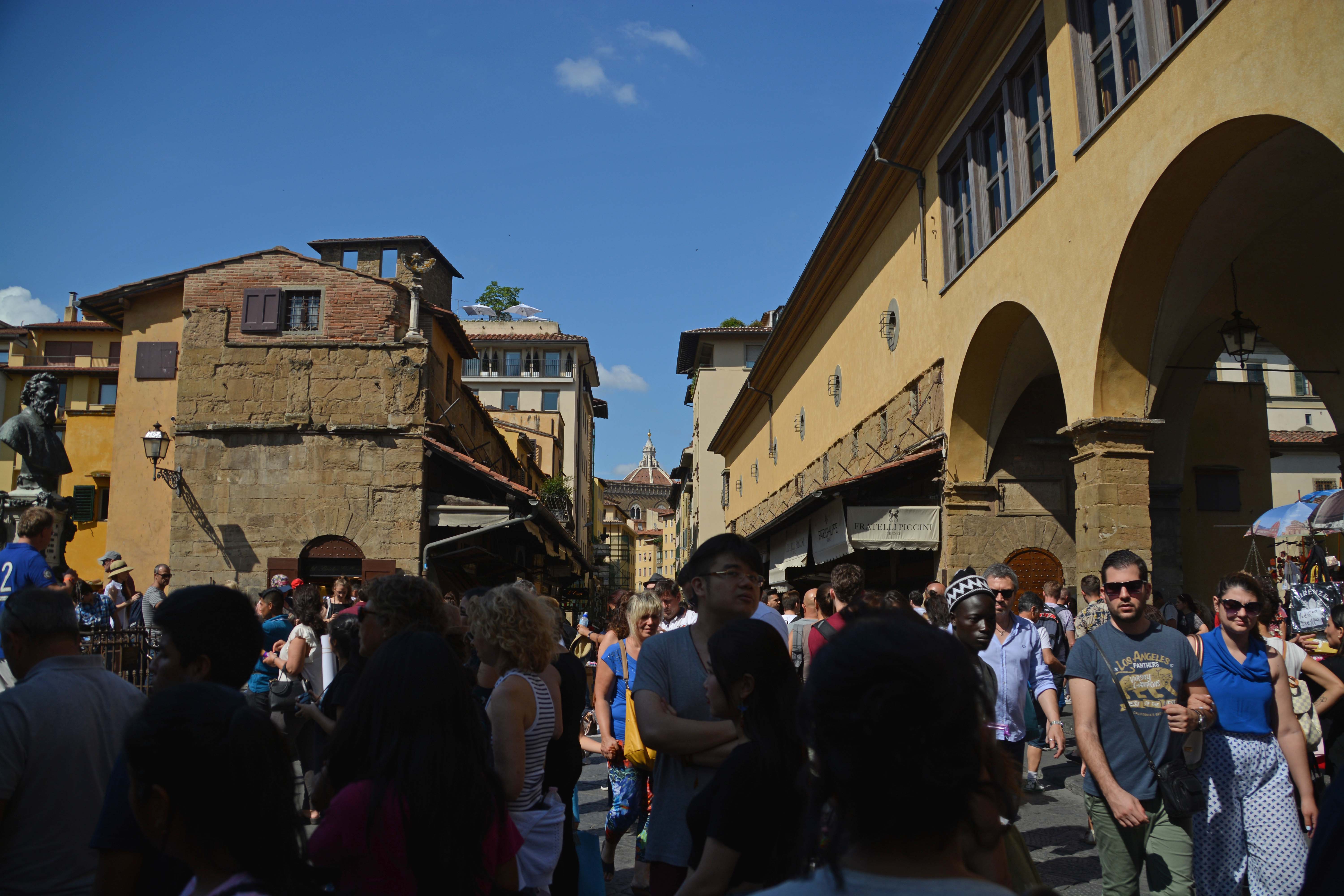 Mittlerweile hat es wieder schwülwarme 28 Grad und vieeeel Sonne. Wir laufen das Arnoufer entlang bis zur Ponte Vecchio. Hier reiht sich ein Touri an den anderen, eine Touri-Gruppe jagd die nächste, ein Kopf-an-Kopf-Rennen. Aber einmal drüber laufen wollen wir schon. Auf ein Eis für 6, 8 oder 10€ in dieser Premiumgegend haben wir keinen Bock, obwohl es schwer fällt.