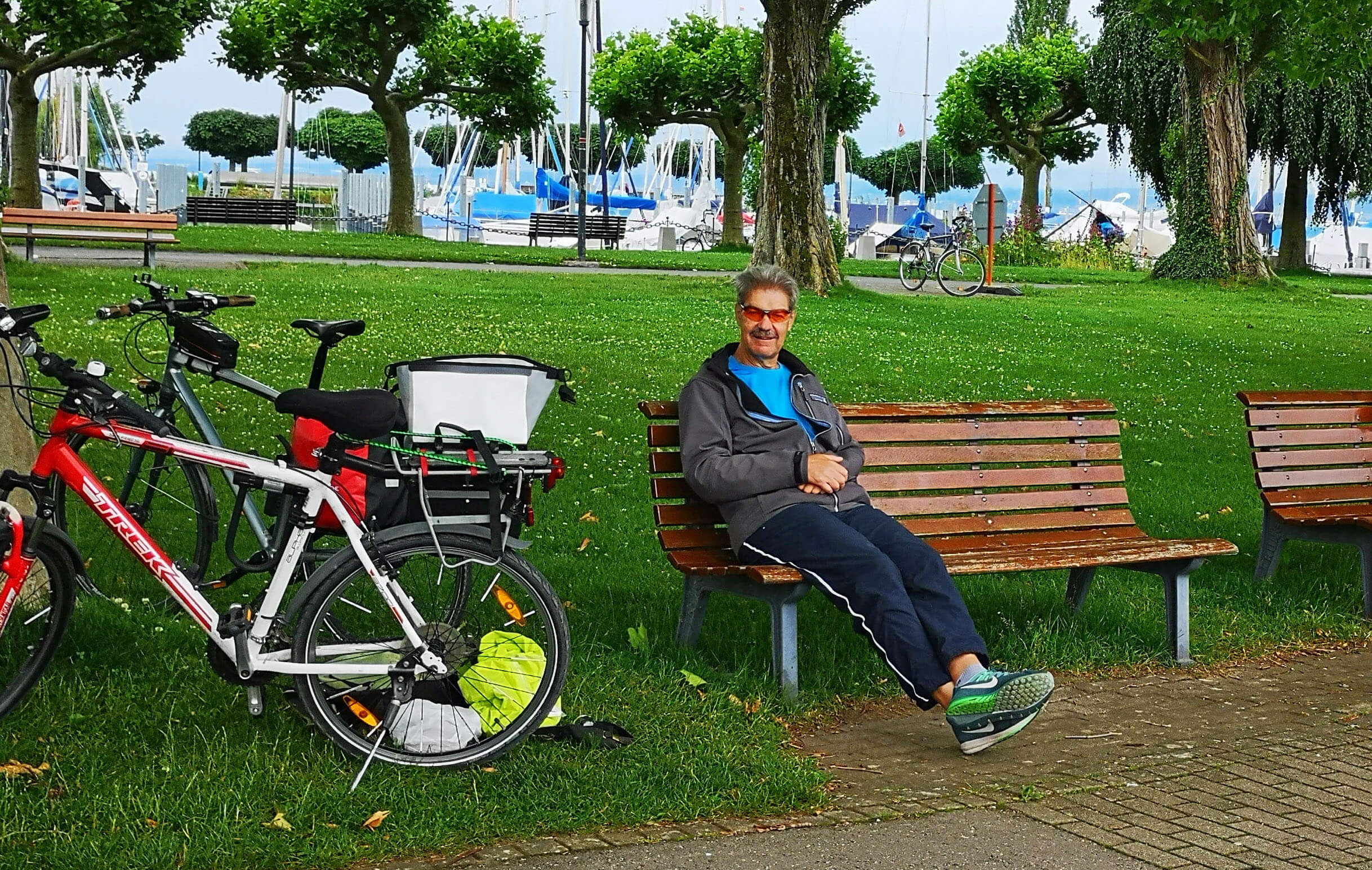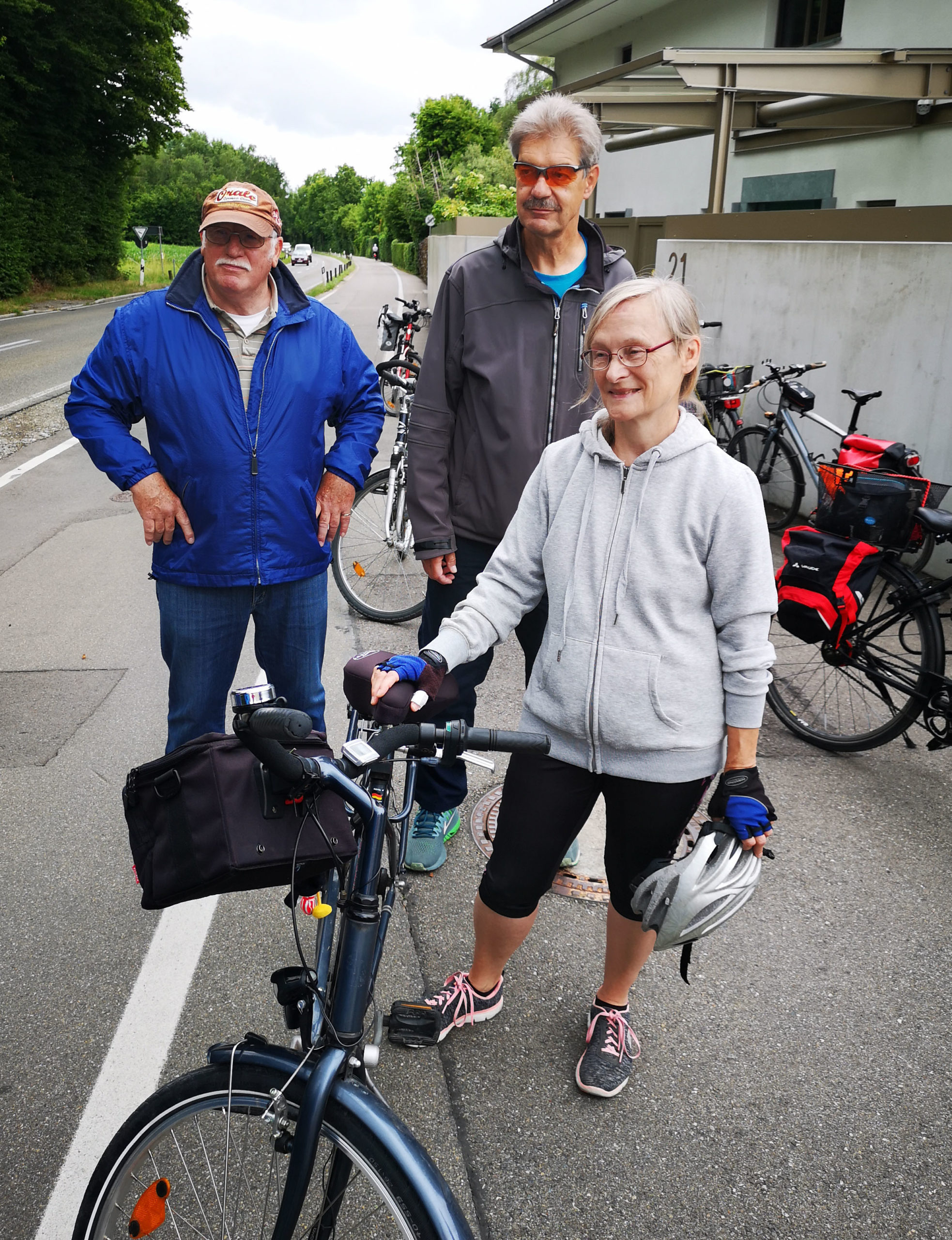 Der Bodenseeradweg führt konsequent am Ufer entlang und bietet immer wieder Ausblicke auf den heute sehr grauen See und die kreuzenden Fähren zwischen Konstanz-Staad und Meersburg. Kurz vor Daisendorf hören wir ein lautes ‚Anhalten bitte‘. Ein Rad aus der Gruppe verliert Luft.. Es ist ein Schlauchwechsel nötig. Die Gruppe nimmt’s mit Humor, vertreibt sich die Zeit mit plaudern und Klaus hilft, das Rad wieder fahrbereit zu machen. Zwanzig Minuten später sind wir erneut auf der Piste.