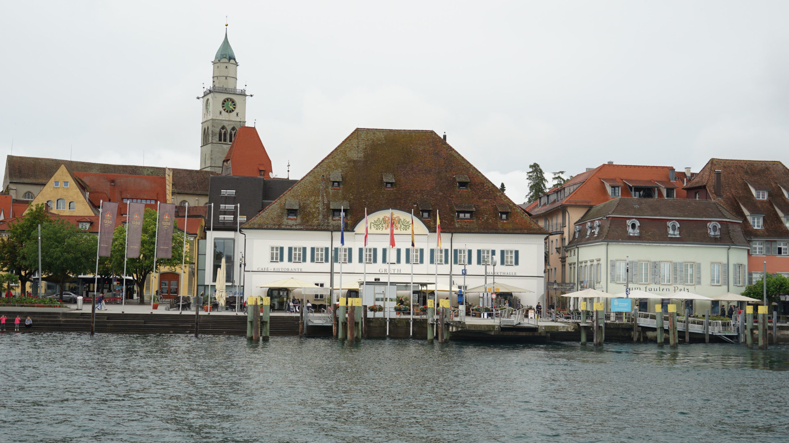 In Überlingen erinnere ich mich gerne an ein großes SEB-Event und an einen unserer legendären Frauen-Ausflüge, der schon gut zwei Jahrzehnte zurückliegt. Wir schlendern durch die Altstadt und teilen uns auf. Einige haben ein Picknick dabei und andere wollen etwas Warmes für den Bauch. Wir lassen uns auf dem Marktplatz vor dem Münster St. Nikolaus nieder. Es ist ungemütlich, kühl und mit den dunklen Wolken kommt Wind auf. Jetzt sieht es tatsächlich nach unwetterartigem Regen aus.