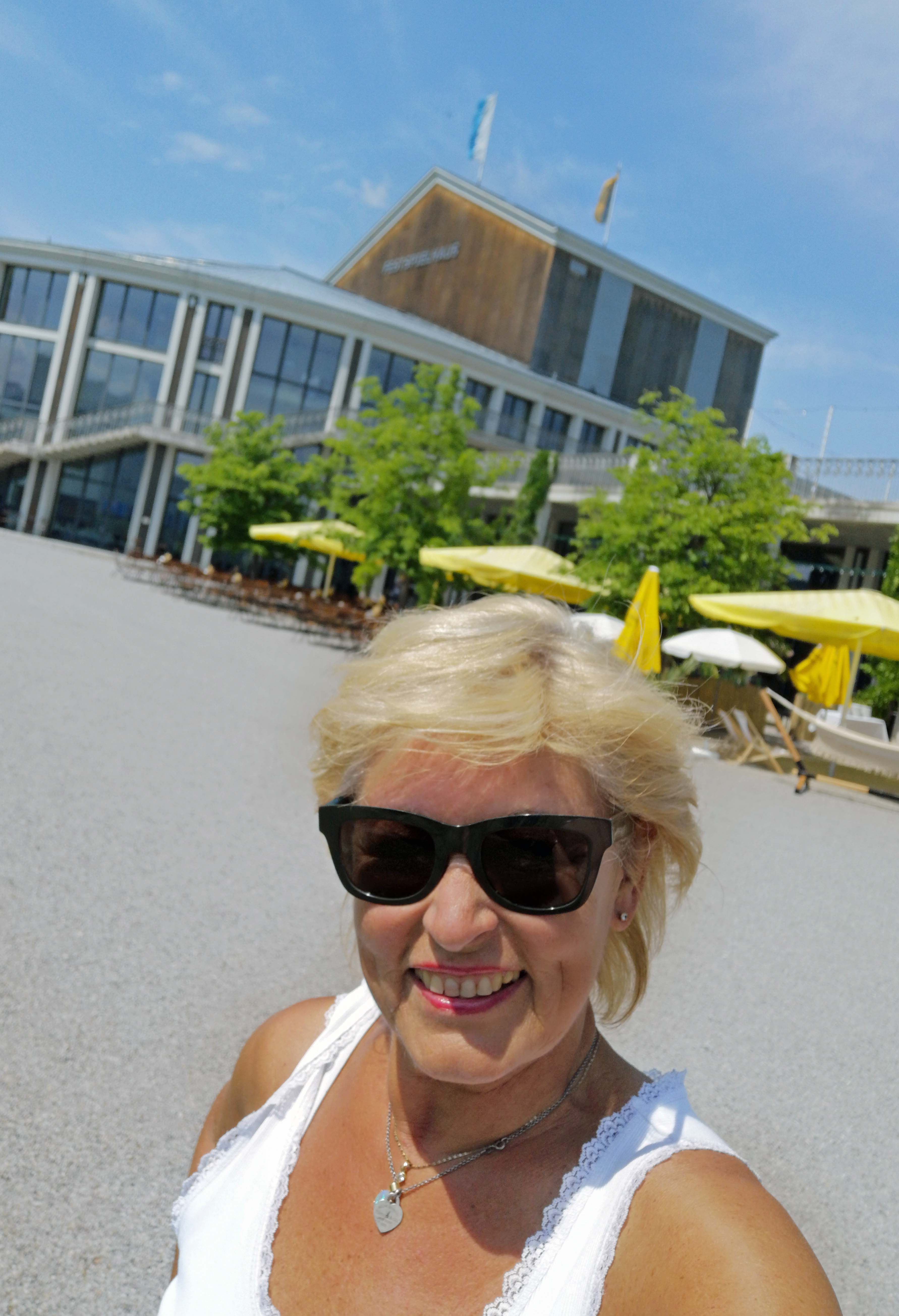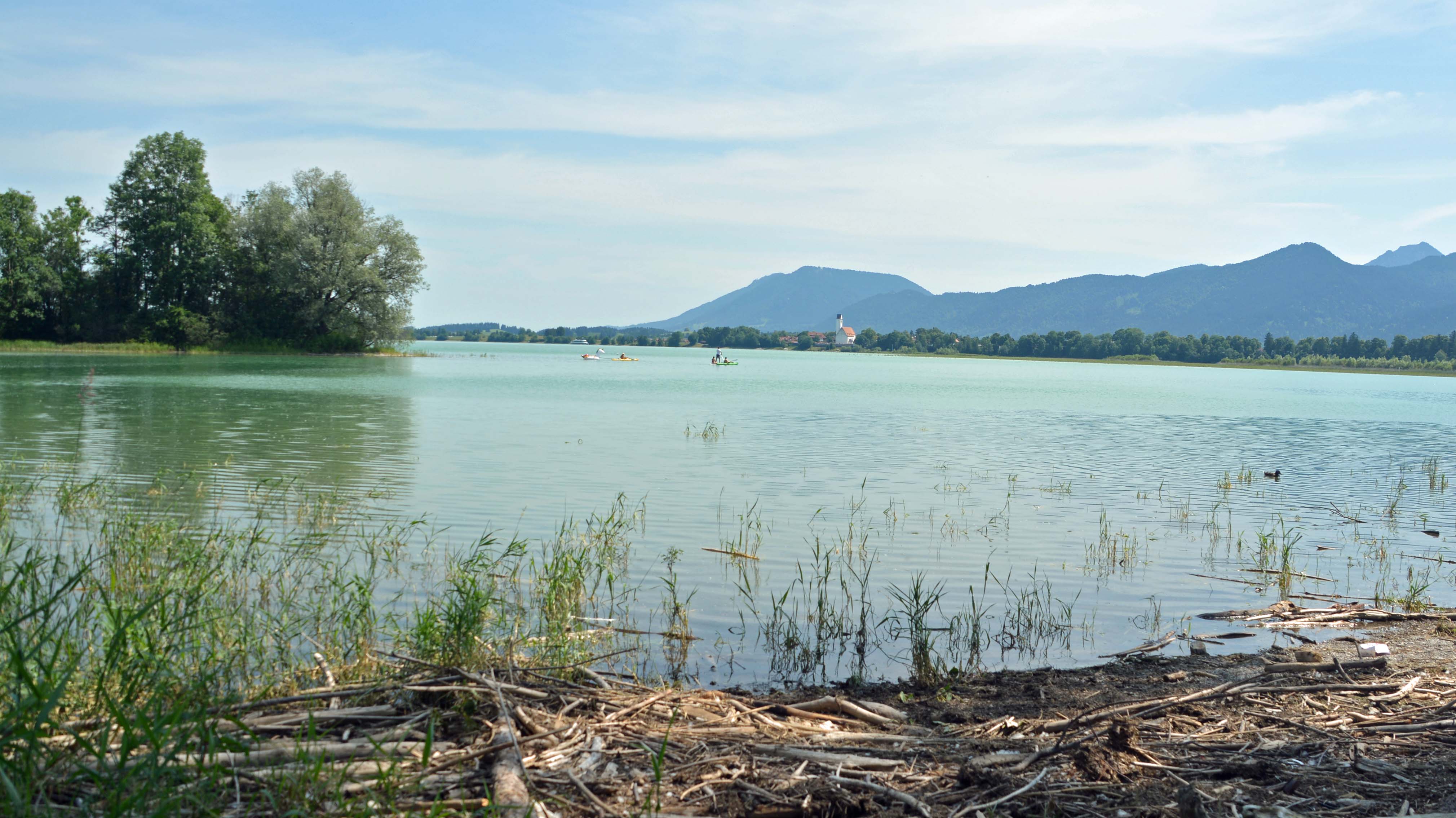 Dann geht’s auf dem Radweg neben dem Lech ca. zwei Kilometer Richtung Forggensee. Es ist Einiges los auf der Strecke, die E-Bikes rauschen nur so an mir vorbei, je oller, je doller! Der Stausee ist etwa 17 qkm groß, naturbelassen und strahlt eine unendliche Ruhe aus. Ich komme am Festspielhaus Füssens vorbei, das heute Kulisse für eine Hochzeit ist. Und schwupp fahre ich schon in die Altstadt Füssens zum Sightseeing und Shoppen.