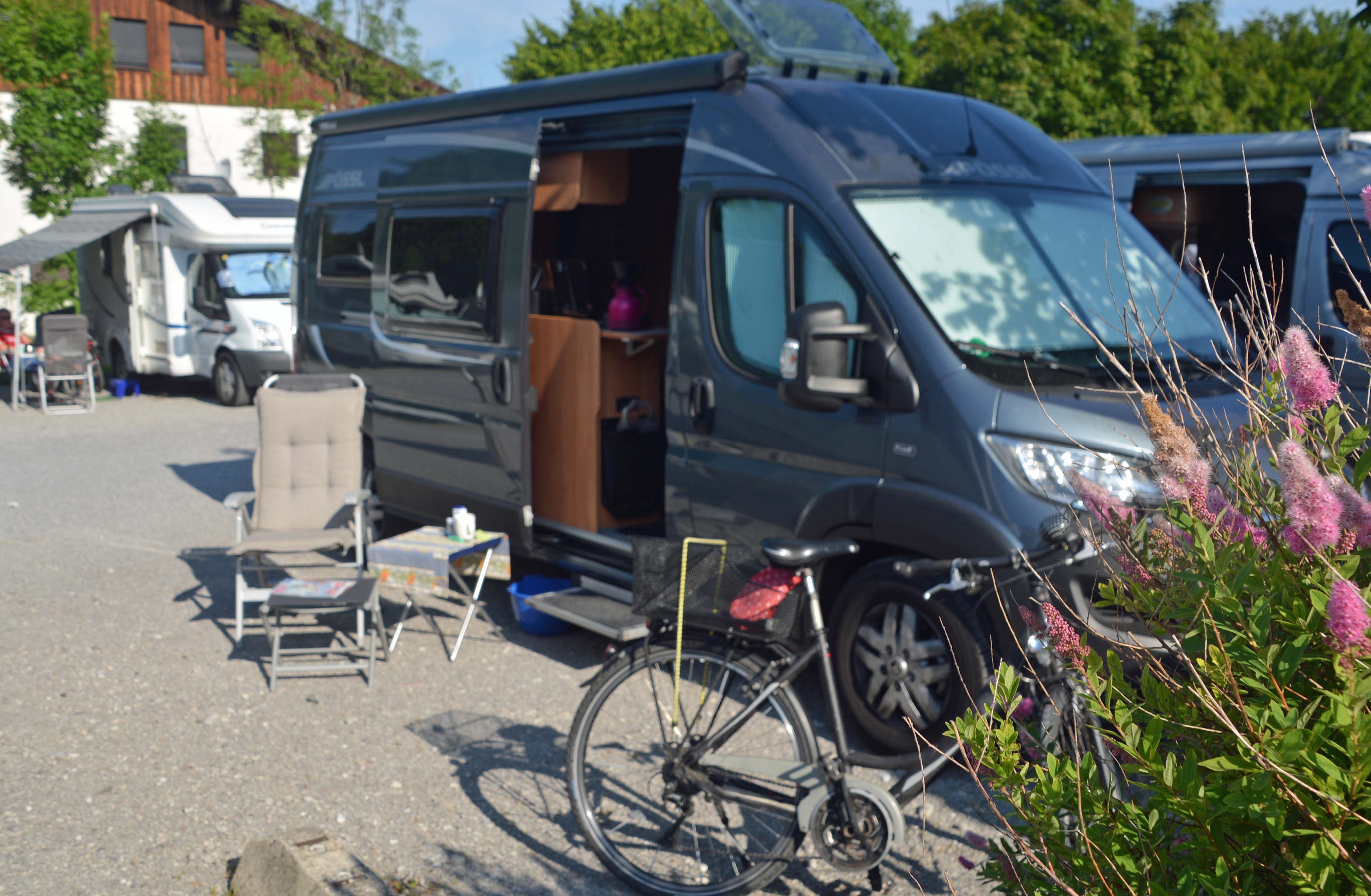 Eröffne meine Womo-Terrasse, schließe das Stromkabel an und fahre mit dem Radl zum Bäcker, lecker Brötchen kaufen. Dann beginnt das erste gemütliche Frühstück in diesem Urlaub vor den Allgäuer Voralpen! Herrliches Wetter, richtig warm und sehr gemütlich. Helfe meinem älteren Nachbarn, ins Internet zu kommen und bereite mich auf einen Fahrradausflug zum Forggensee und einen Shopping-Stadtbummel vor.
