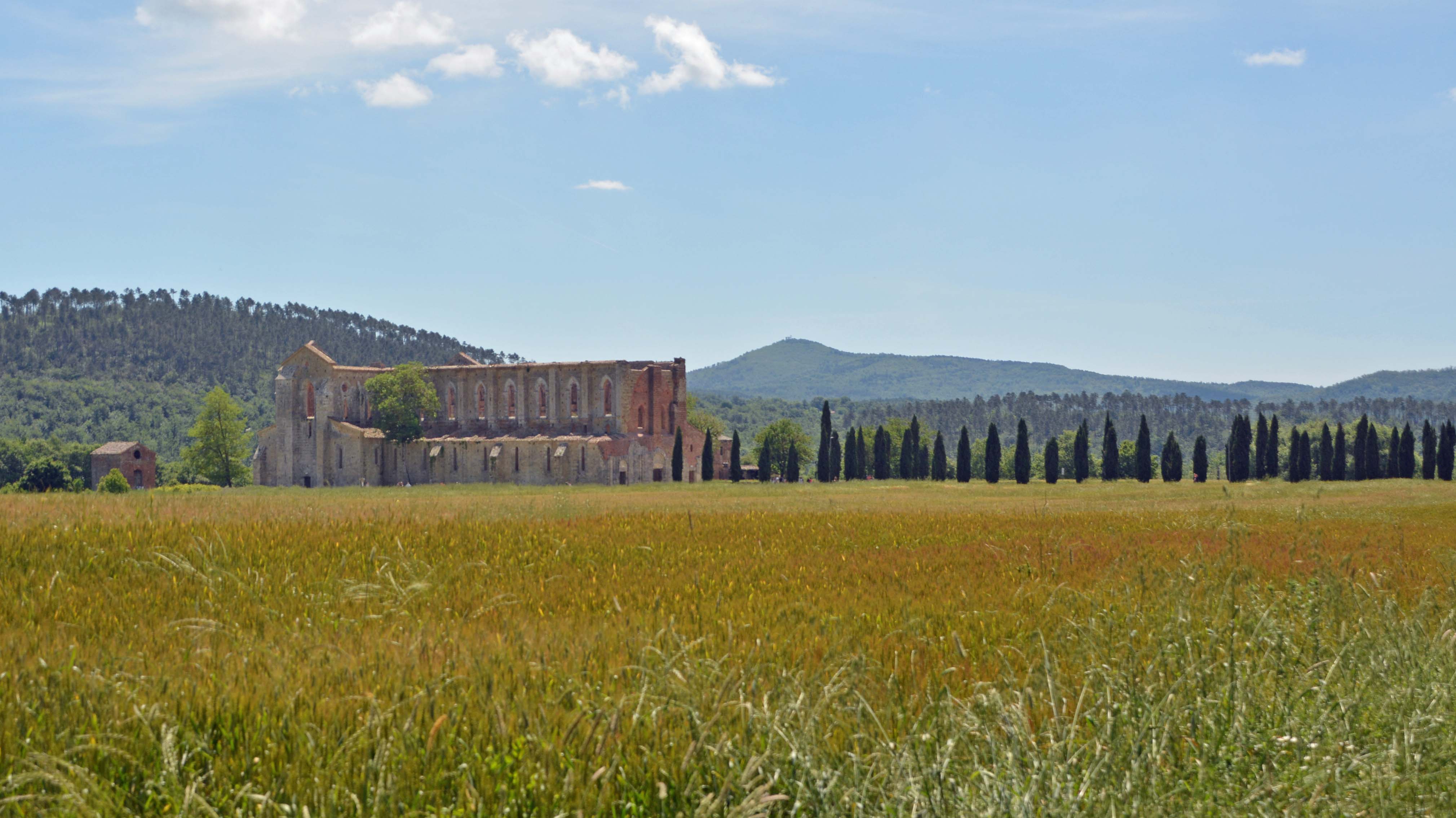 Wir starten mit dem reisefertigen Fiete um 11 Uhr zu unserem ersten Ziel, der Abbazia di San Galgano, einer der Hauptsehenswürdigkeiten der Toskana. Kaum sind wir unterwegs, entwickeln sich wieder Wolkenfelder, wie jeden Tag.