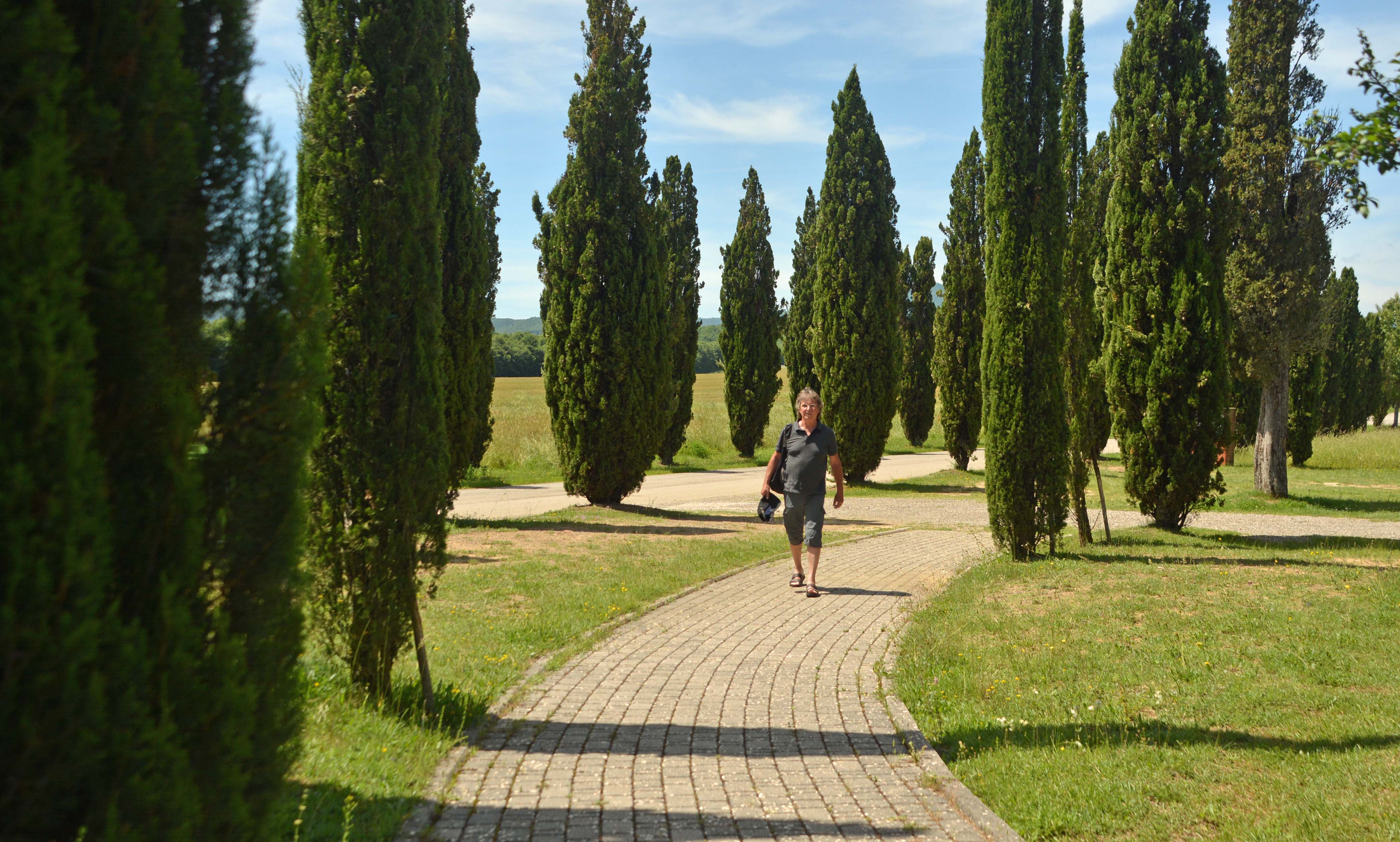 Natürlich geht es auf kurvenreichen Straßen durch die toskanischen Hügel und durch dichte Waldgebiete mit Bäumen, deren Stämme total mit Rankenpflanzen bewachsen sind. Samstag ist offensichtlich ein beliebter Tag, um mit dem Motorrad scharfkantig und elegant an der Mittellinie der Straße entlang zu düsen. Klaus rechnet in jeder Kurve mit einem dieser Verrückten.