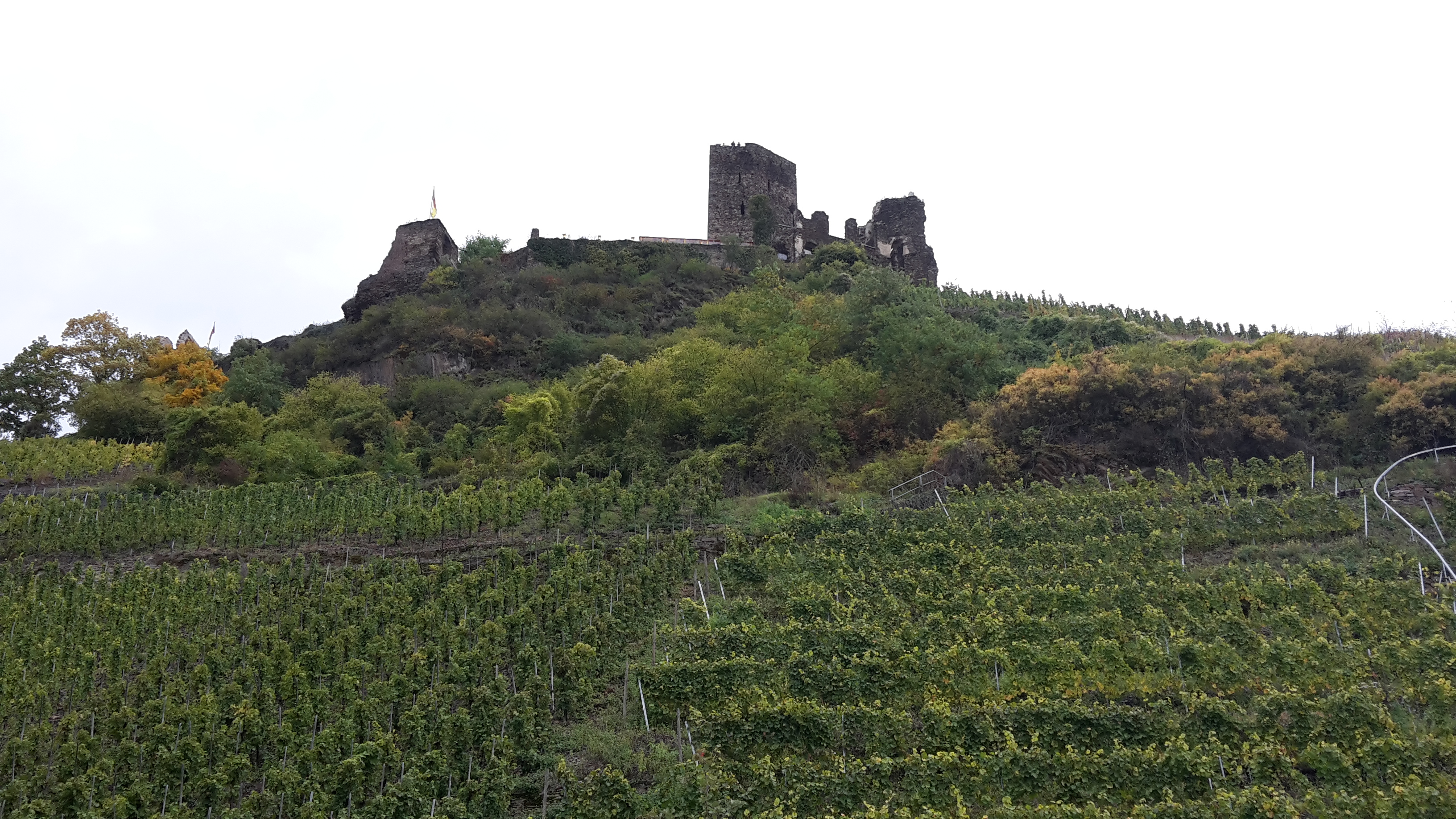 Wir fahren mit drei PKWs in‘s 25 Kilometer entfernte mittelalterliche Beilstein. Die leidenschaftlichen Biker Jo und Thomas strampeln lieber mit dem Rad. Die anderen ‚Neun Kleinen Negerlein‘ laufen durch die engen Gassen und Winkel Beilsteins hinauf zur Burgruine Metternich. Als Gruppe sparen wir bare Kohle beim Eintritt. Nach dem Aufstieg genießen wir bei bedecktem Himmel schöne Ausblicke auf die Mosel, die Beilsteiner Altstadt und freuen uns auf eine erste blaue Stelle am Himmel. Während wir süffigen Federweißen schlabbern, melden die Radsportler ihre Ankunft.