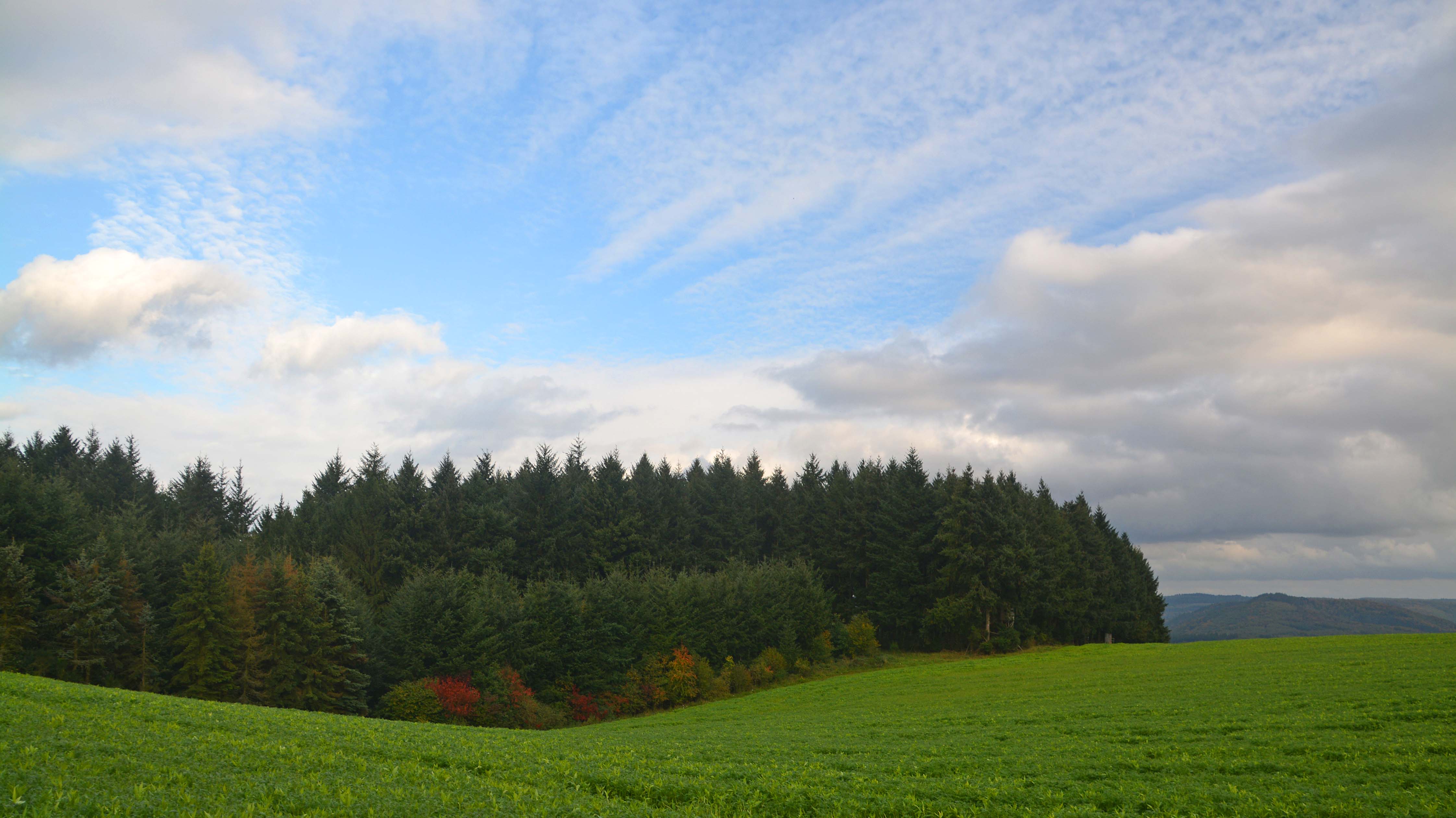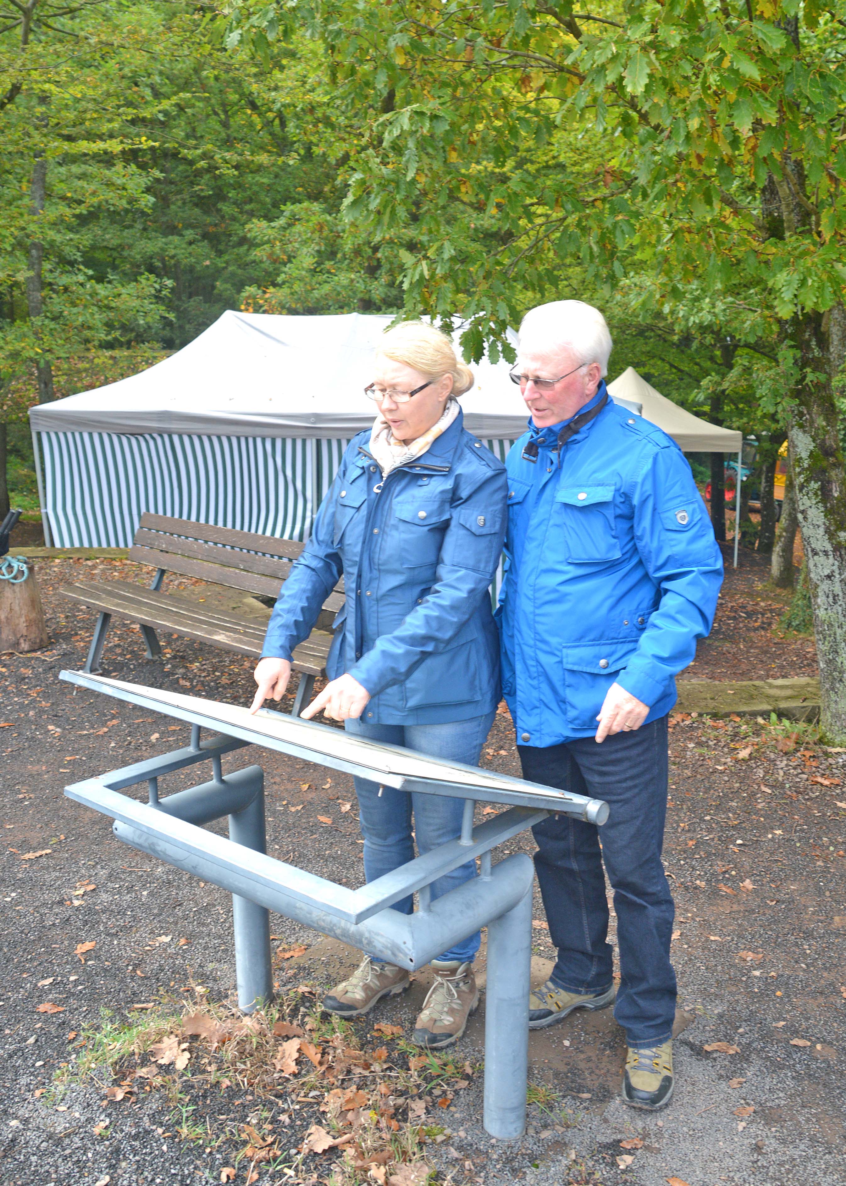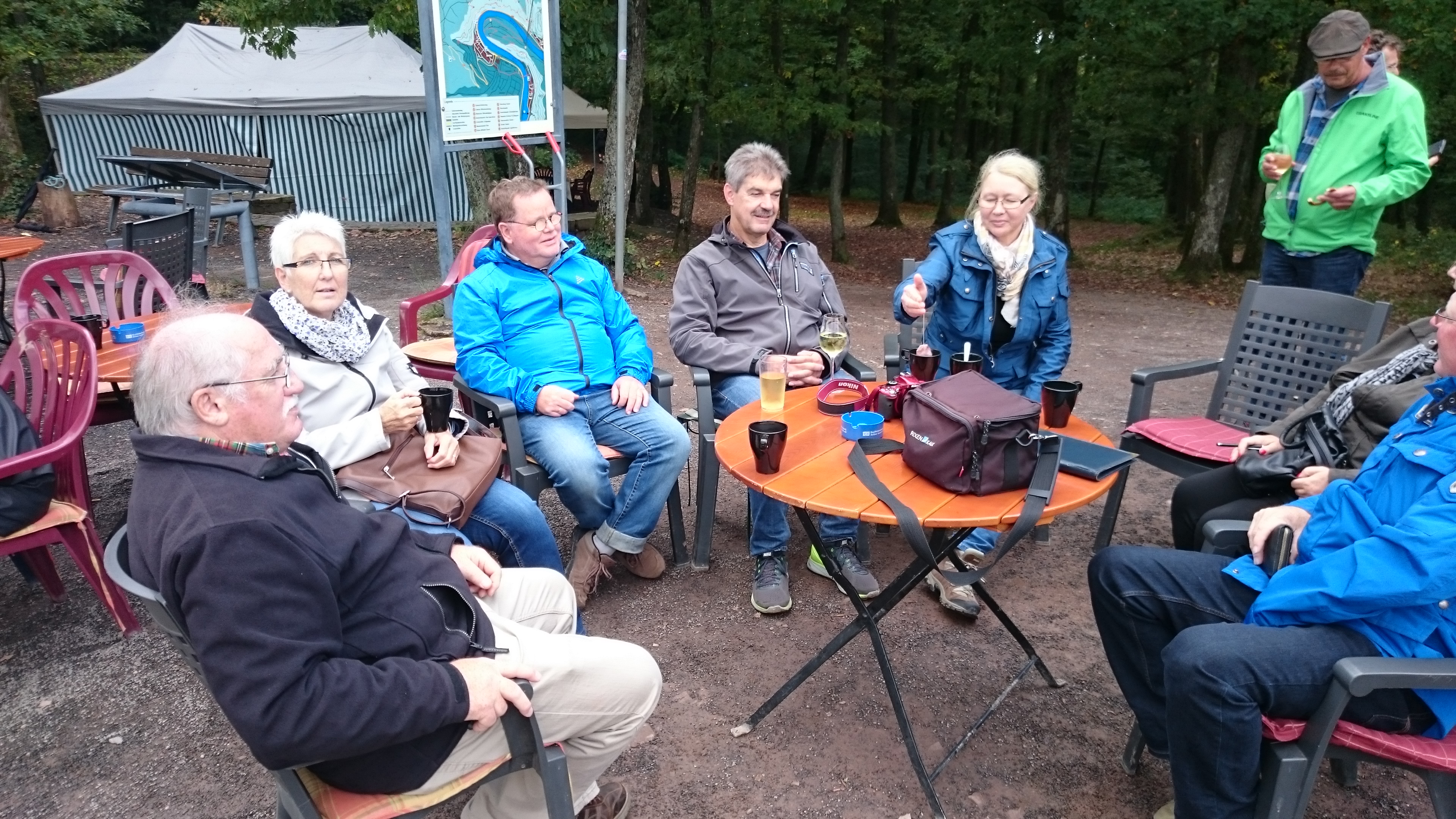 Wir schrauben uns einige Serpentinen hoch, holpern eine für Autos verbotene Strecke entlang und werden nach 500 Metern Fußweg am Calmonter Gipfelkreuz mit einem grandiosen Panoramablick auf die Mosel-Kulturlandschaft, die Ruine des Klosters Stuben und Sonnenstrahlen belohnt. Schon der reiselustige Goethe hat hier von einem – wie er es nannte – ‚Natur-Amphitheater‘ geschwärmt. In der Wein-Schenke versorgen wir uns mit Getränken, selbst gebackenem Kuchen und ratschen. Dann geht’s zurück zu den Autos durch den herbstlichen Wald.