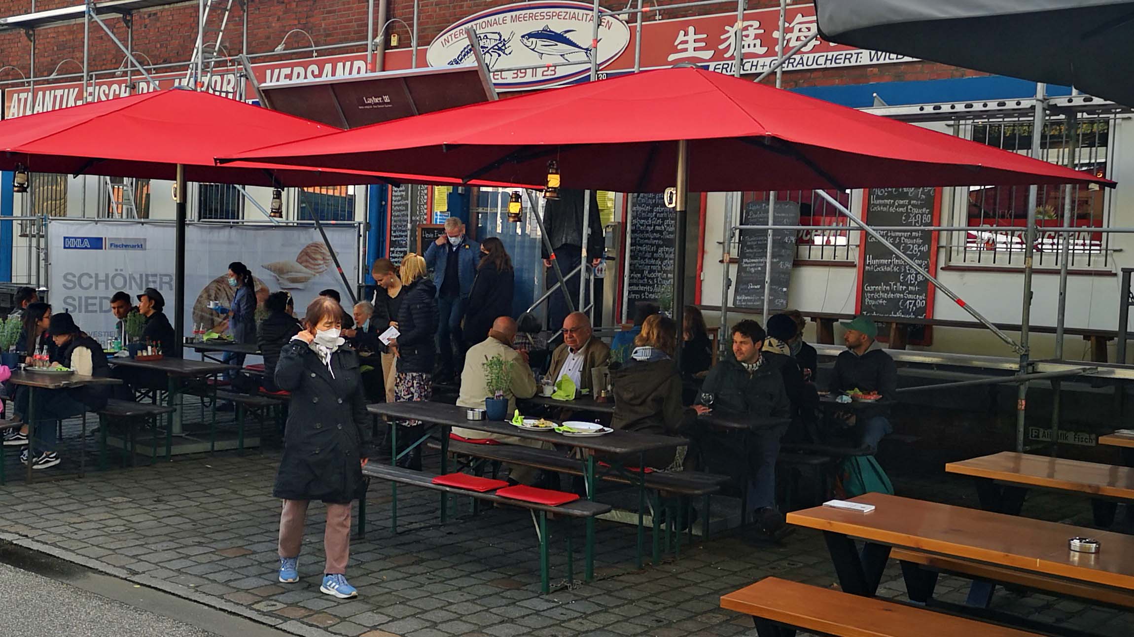 Jetzt kommt ein Highlight des Tages. Ich laufe schnurstracks zu den Zeilenbauten in die Große Elbestraße. Hier servieren zahlreiche Fischhändler ihre Delikatessen direkt vor Ort, das bedeutet Fisch essen direkt an der Quelle. Mein Lieblingslokal – und für meine Begriffe bestes Fischlokal Hamburgs – ist das BistrOcean. Ein echtes Insider-Lokal, ein Geheimtipp ohne Pomp mit eigener Austernzucht in Irland und mit dem Charme einer hochwertigen Fischbude. Wobei es sich eher noch um eine umdekorierte Lagerhalle handelt! Vorne wird bei einfacher Einrichtung gegessen und hinten wird der Fisch für den Transport in die weite Welt vorbereitet. Das Essen ist unschlagbar gut und hat eine sagenhafte Qualität. Leider hat auch hier das Flair durch Corona gelitten. Es ist längst nicht mehr so gemütlich wie vor der Pandemie, als man Arm neben Arm saß und jeder einmal bei dem anderen von seinem Fischteller probieren durfte.