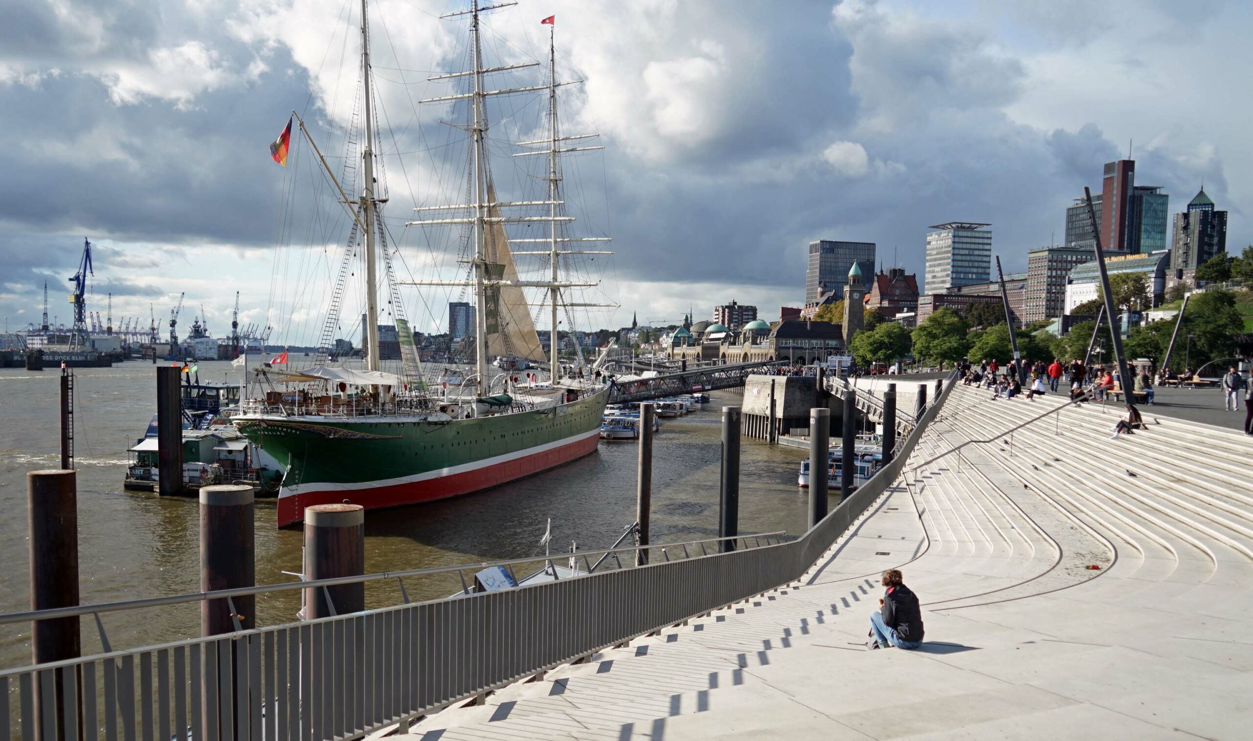 Frisch gestärkt laufe ich Richtung Fischmarkt, vorbei an einem der drei Hamburger Kreuzfahrtterminals, dem Cruise Center Altona, und befinde mich kurze Zeit später vor der ältesten Seemannskneipe Hamburgs, dem „Schellfischposten“, bekannt durch die TVshow ‚Ina’s Nacht‘. Die klitzekleine Kneipe mit den Gummistiefeln für Gäste im Keller (Flut!!!) liegt gleich neben der Köhlbrandtreppe. Die imposante zum Hafen führende Treppe wurde 1887 eingeweiht und von den Hafenarbeitern auf dem Weg zur Arbeit genutzt. Von ihr hat man einen guten Blick auf den Holzhafen, das älteste Hafenbecken, das 1722 angelegt wurde.