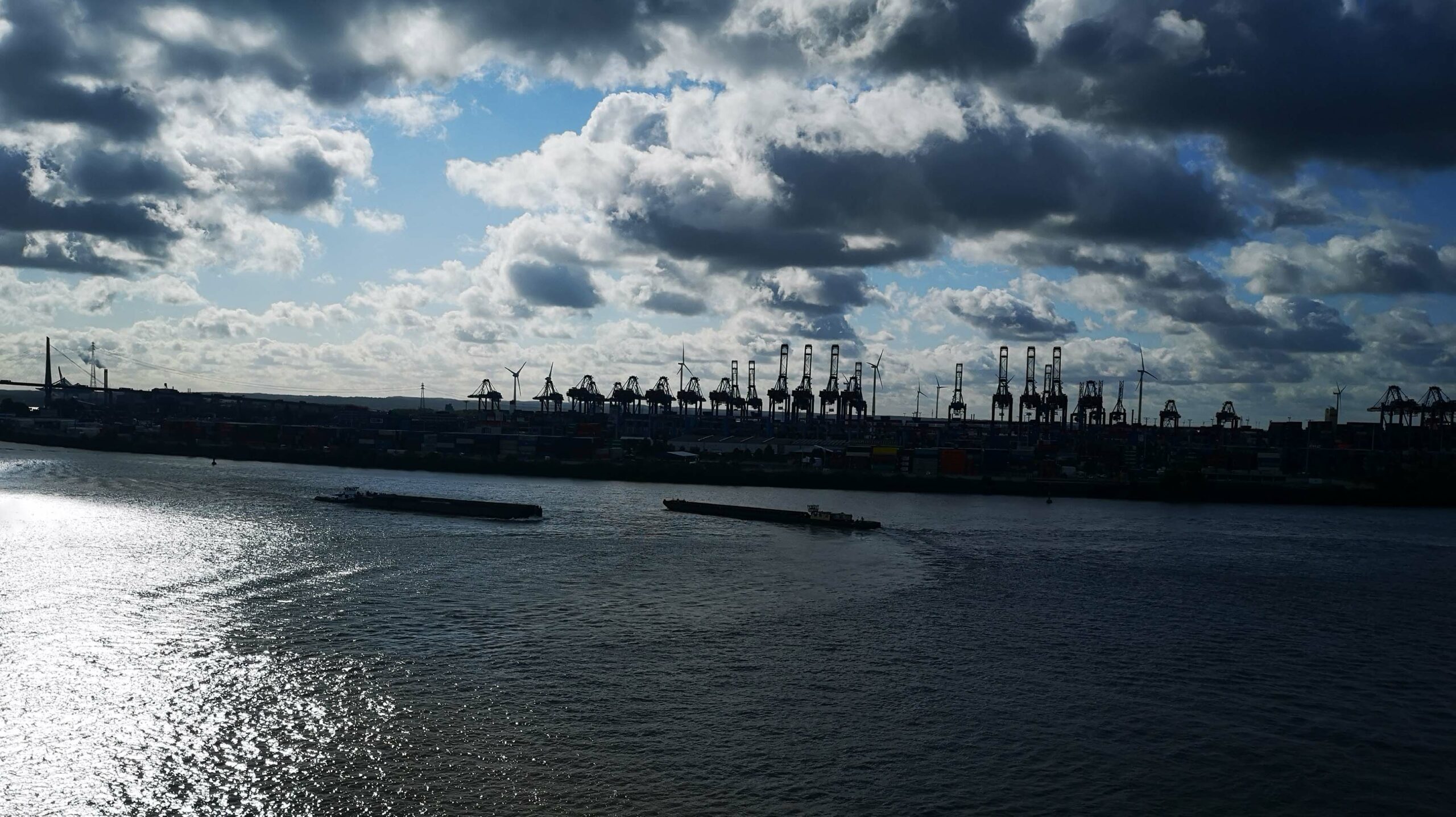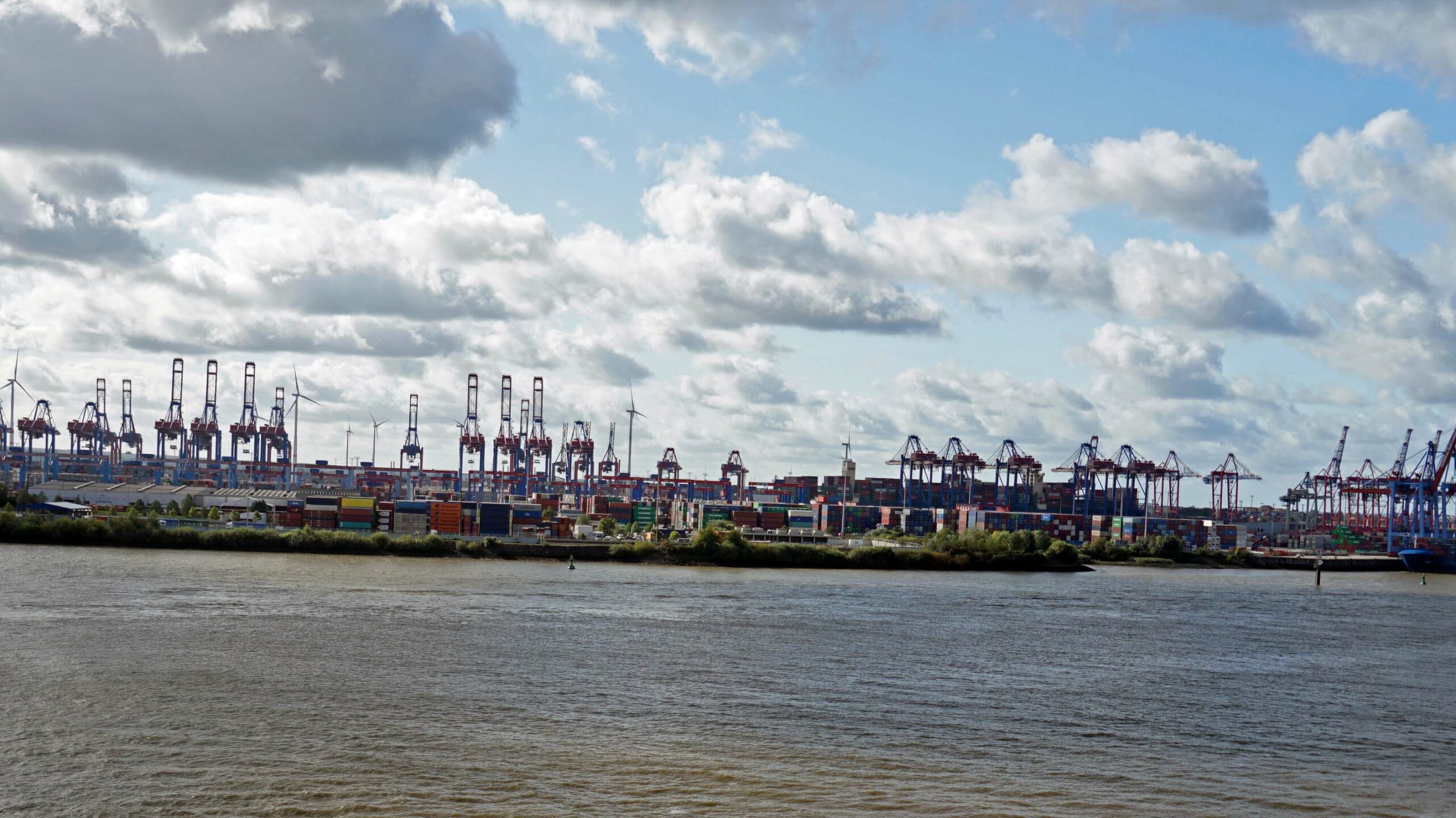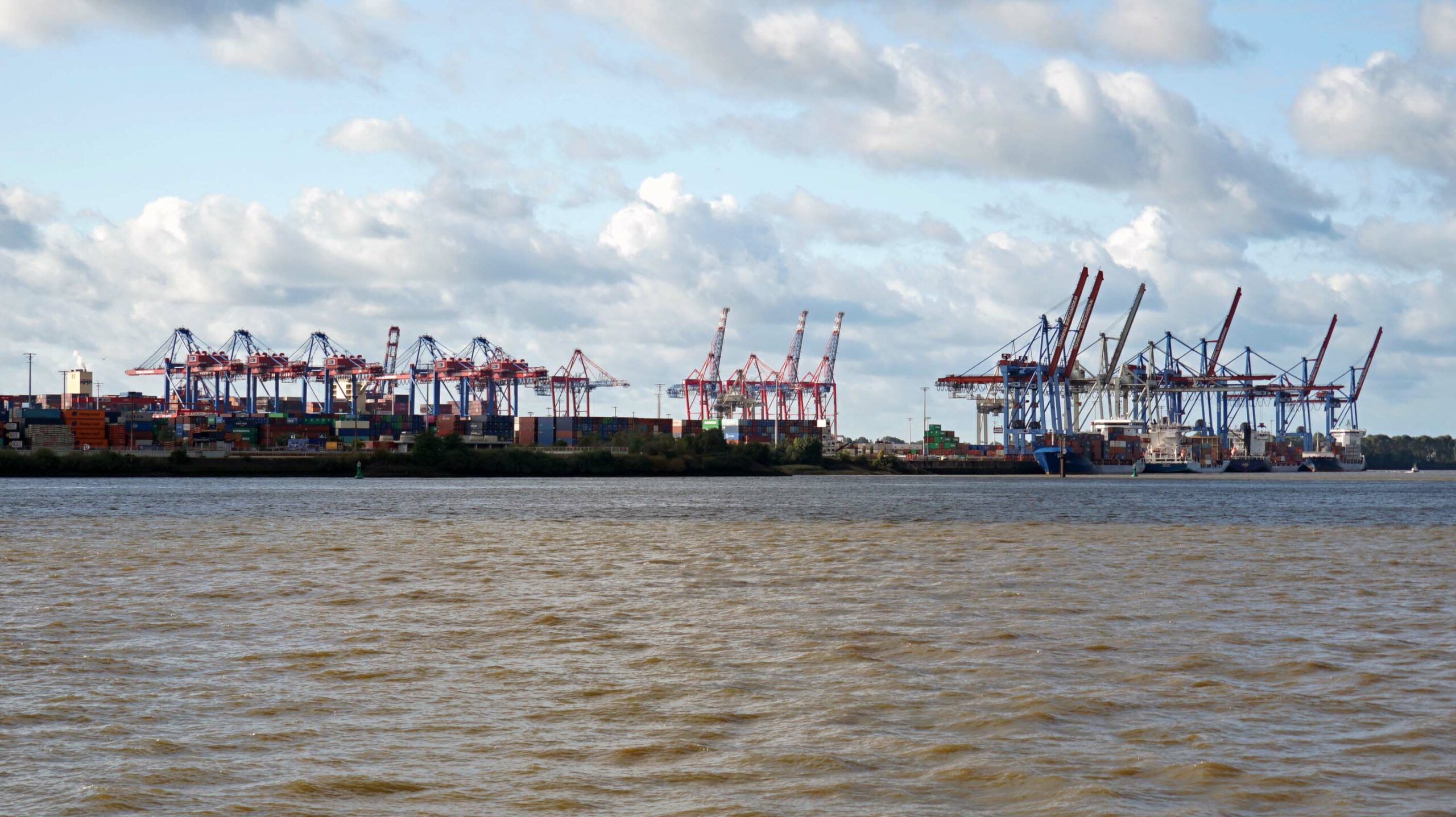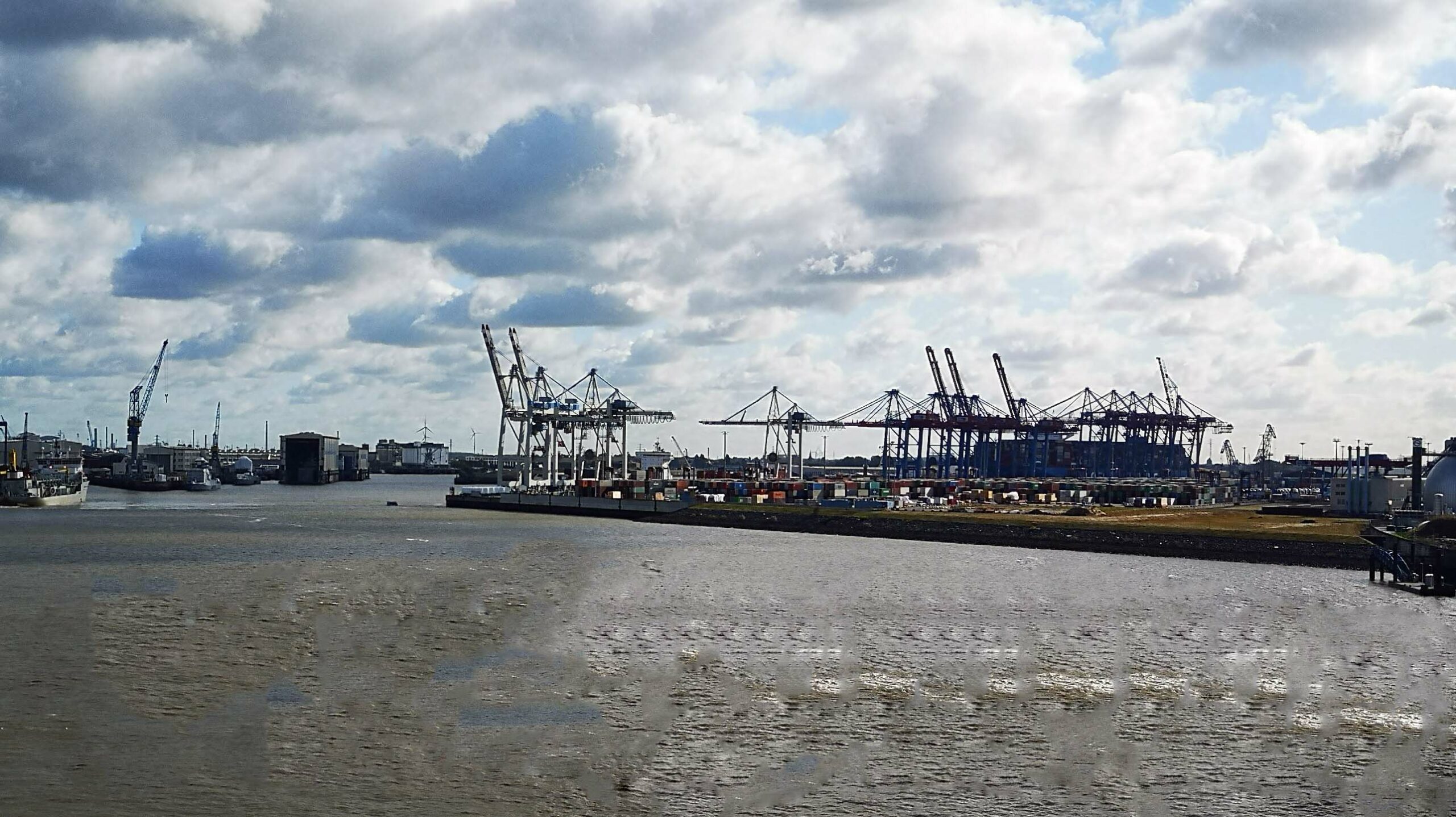 Auf der 62er Fähre Richtung Finkenwerder lasse ich mir den Elbewind um die Nase wehen, genieße den Blick auf den Fischmarkt und steige an der Haltestelle Dockland aus. Hier besteige ich das markante Bürogebäude Dockland, 29 Meter hoch mit 136 Außenstufen. Es sieht aus wie ein Schiffsbug und liegt direkt an der Elbe in der Nähe des ehemaligen England-Fähranlegers. Auf der öffentlichen Aussichtsplattform habe ich einen grandiosen Blick auf die Dreh-Krane (nein, kein Schreibfehler, nicht mit Ä sondern nur mit A!) wo die Container geladen und gelöscht werden. Ein tolles Panorama.