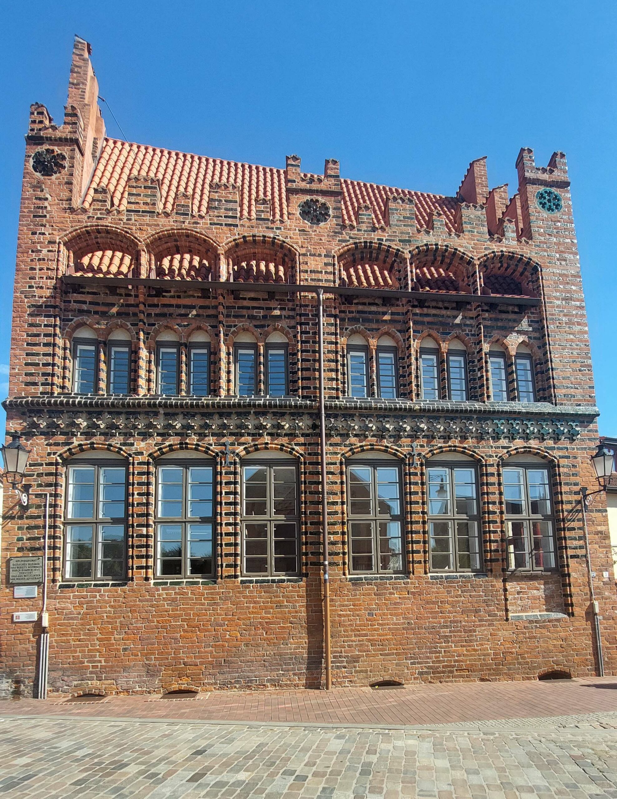 DAS Fotomotiv schlechthin ist ein kleines altes Fachwerkhaus aus dem 17.JH., was die Wismarer (ich gendere NICHT!) „Rotes Haus“ nennen. Der Originalname ist „Das Gewölbe“ und für mich eine der schönsten Sehenswürdigkeiten der Stadt. Früher war es ein Wohnhaus, dann ein Weinkontor und heute ein klitzekleines Hotel.