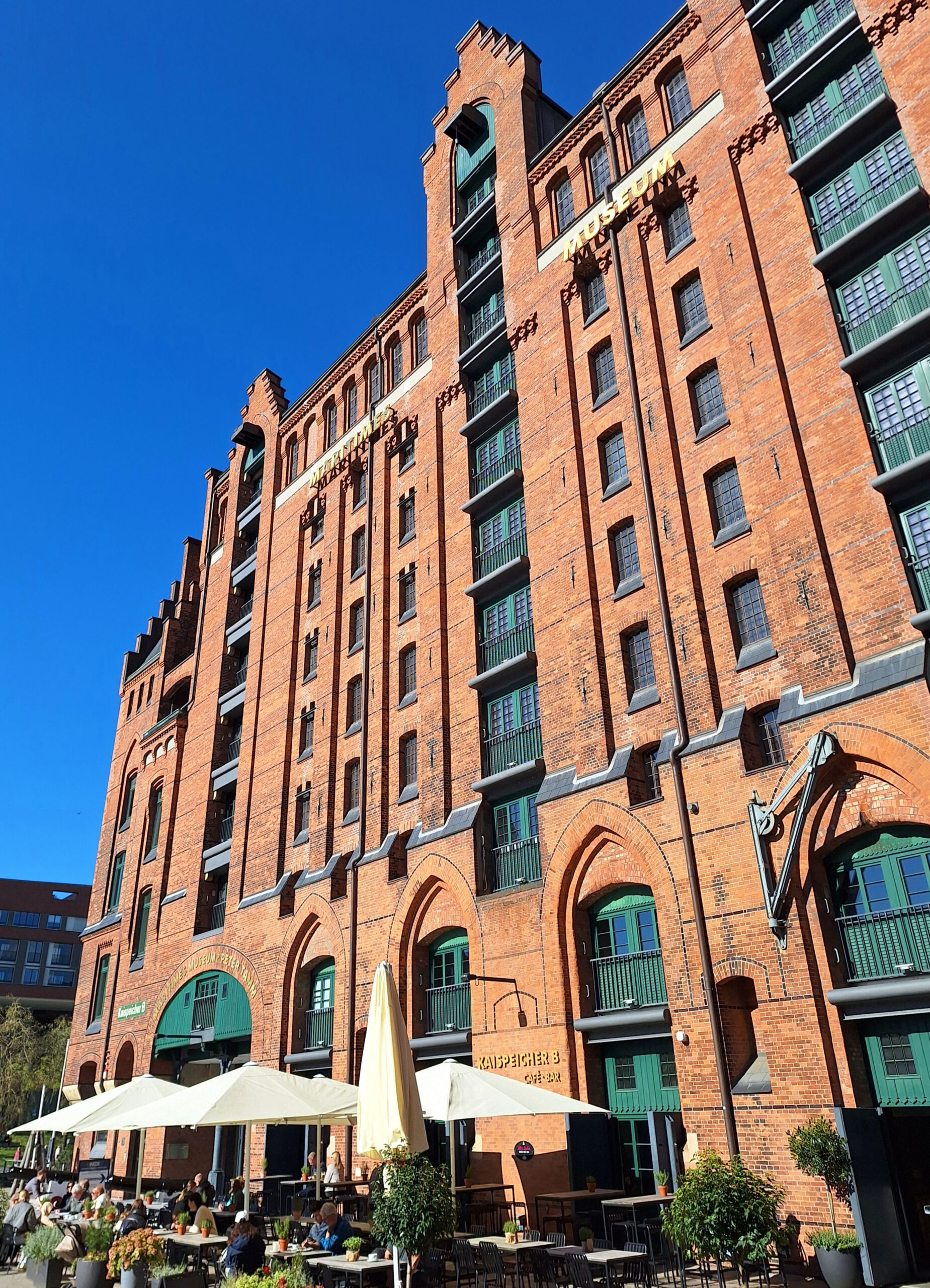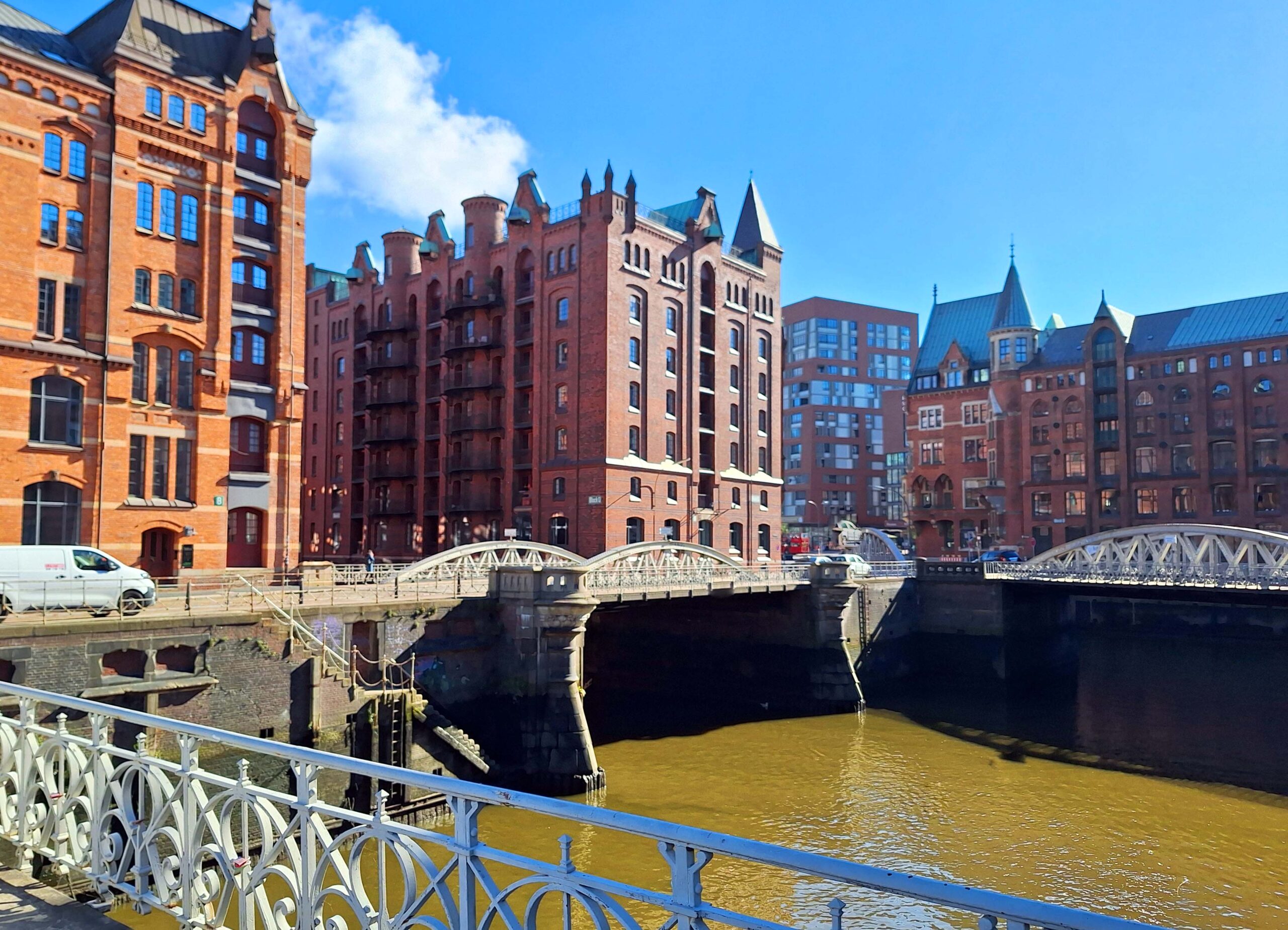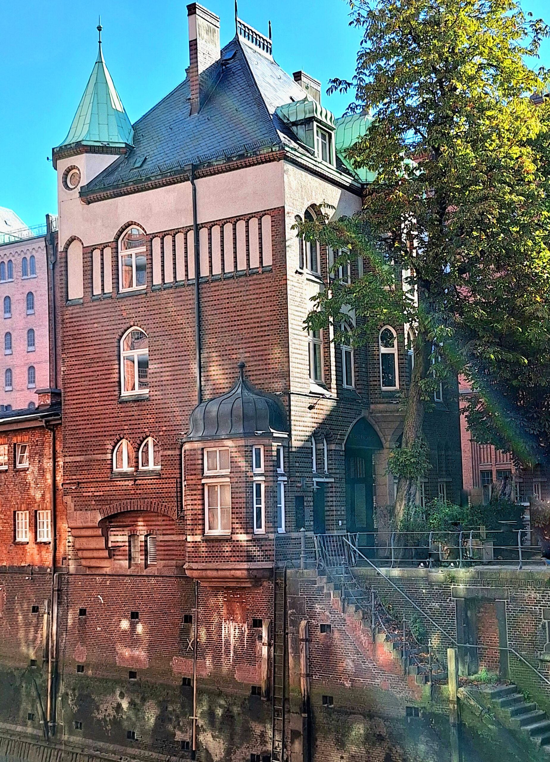 Ich schlendere jetzt durch den ältesten Teil der HafenCity, heute mal bei Ebbe. Die Niederbaumbrücke führt zum Sandtorkai, die Jungfernbrücke zu einer der fünf Hauptkirchen, Sankt Katharinen, über den Zollkanal. Hinter dem Sandtorkai befindet sich das Kehrwiederfleet. Mein Ziel ist zunächst der Traditionsschiffhafen 🛥️ zwischen Sandtor- und Kaiserkai, wo mehrere historische Schiffe ankern. Von hier habe ich einen ungewöhnlichen Blick auf die Elphi. Ich entdecke das historische Fleetschlösschen am Brooktorkai, ein ehemaliges Zollhaus. Hier wurden die ankommenden Waren ordnungsgemäß registriert. Heute ist es eine Kneipe und steht unter Denkmalschutz. Das malerisch zwischen der Wandrahmsfleet- und der Holländischbrookfleetbrücke gelegene 120 Jahre alte Wasserschloss 🏰 ist DAS beliebteste Fotomotiv der Speicherstadt. Früher war es Unterkunft und Werkstatt für Hafenarbeiter. Das romantische Häuschen betreibt heute den Handel mit Tee und ist zudem Gastronomie. Seit zehn Jahren gehört das Gebäude zum Weltkulturerbe. Der Holländische Brook und der Alte Wandrahm zählten einst zu den vornehmsten Straßen der Hansestadt.