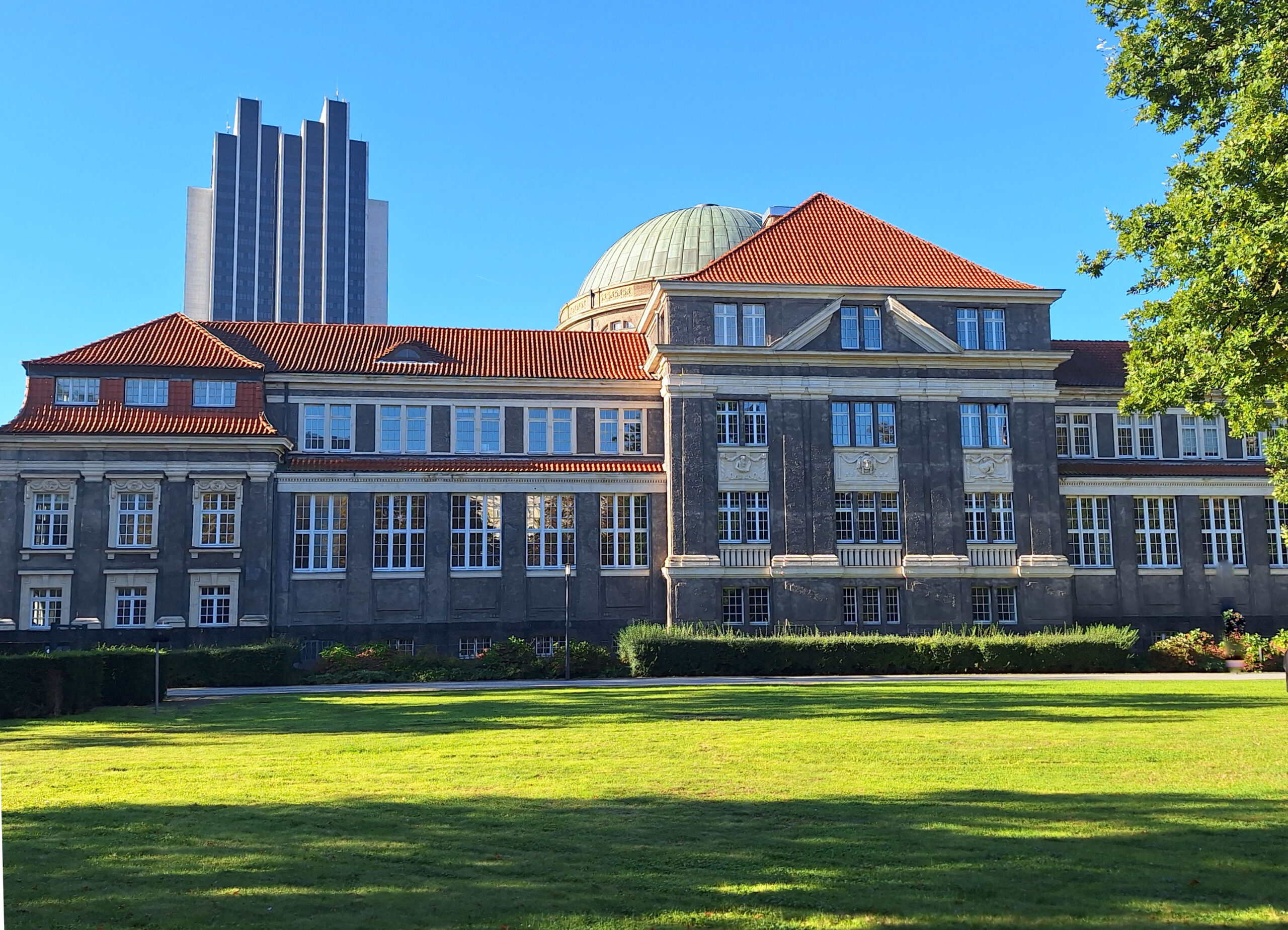 Ich starte früh bei wolkenlosem Himmel. Was habe ich doch für ein Glück mit dem Wetter! 😎 Ich gehe diesmal über das ehrwürdige Hamburger Uni-Gelände für Rechtswissenschaften zu den Öffis.
