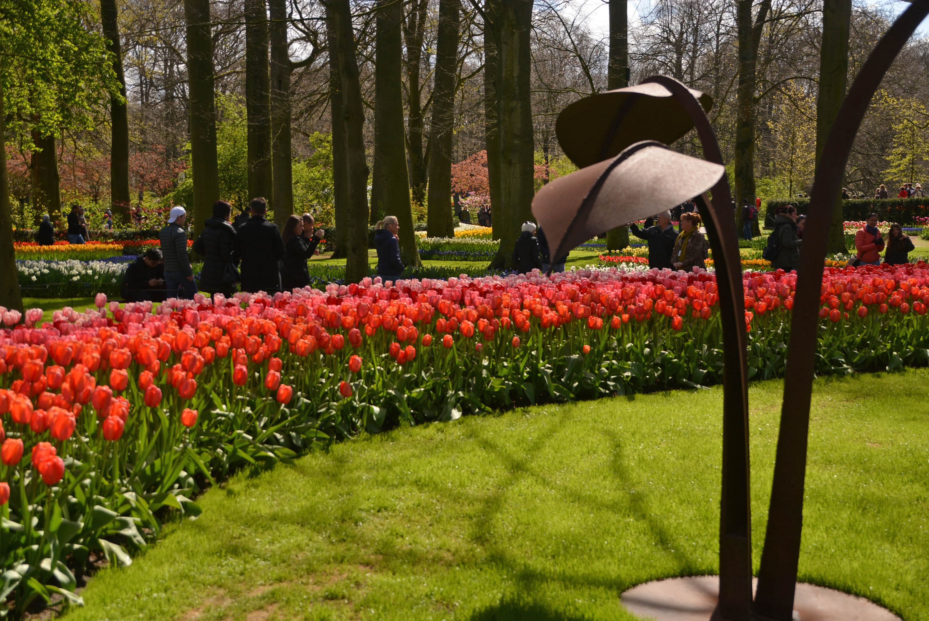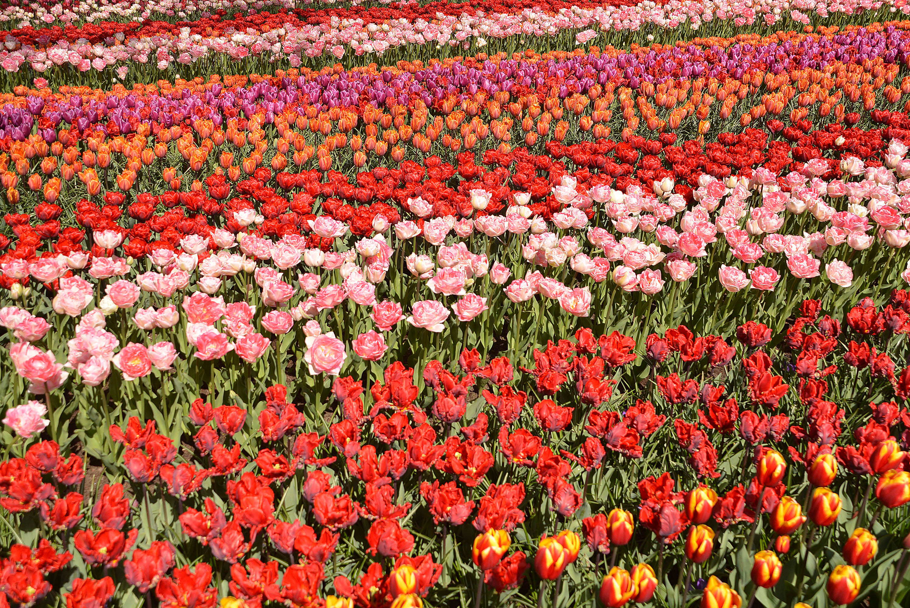 Nach 40 Kilometern Fahrt durch Weideland, Wassergräben und zuletzt durch ein berauschendes Farbenmeer von Blumenfeldern, erreichen wir um die Mittagszeit den ‚größten Blumenzwiebelgarten der Welt‘. Wir werden vorbildlich zum Parken eingewunken und sind gespannt, auf das, was uns erwartet. Die Eintrittskarten hatten wir im Internet bestellt, so dass wir ohne Wartezeit in die Parkanlage gelangen – mit hunderten, ja tausenden anderer Besucher aus aller Herren Länder.