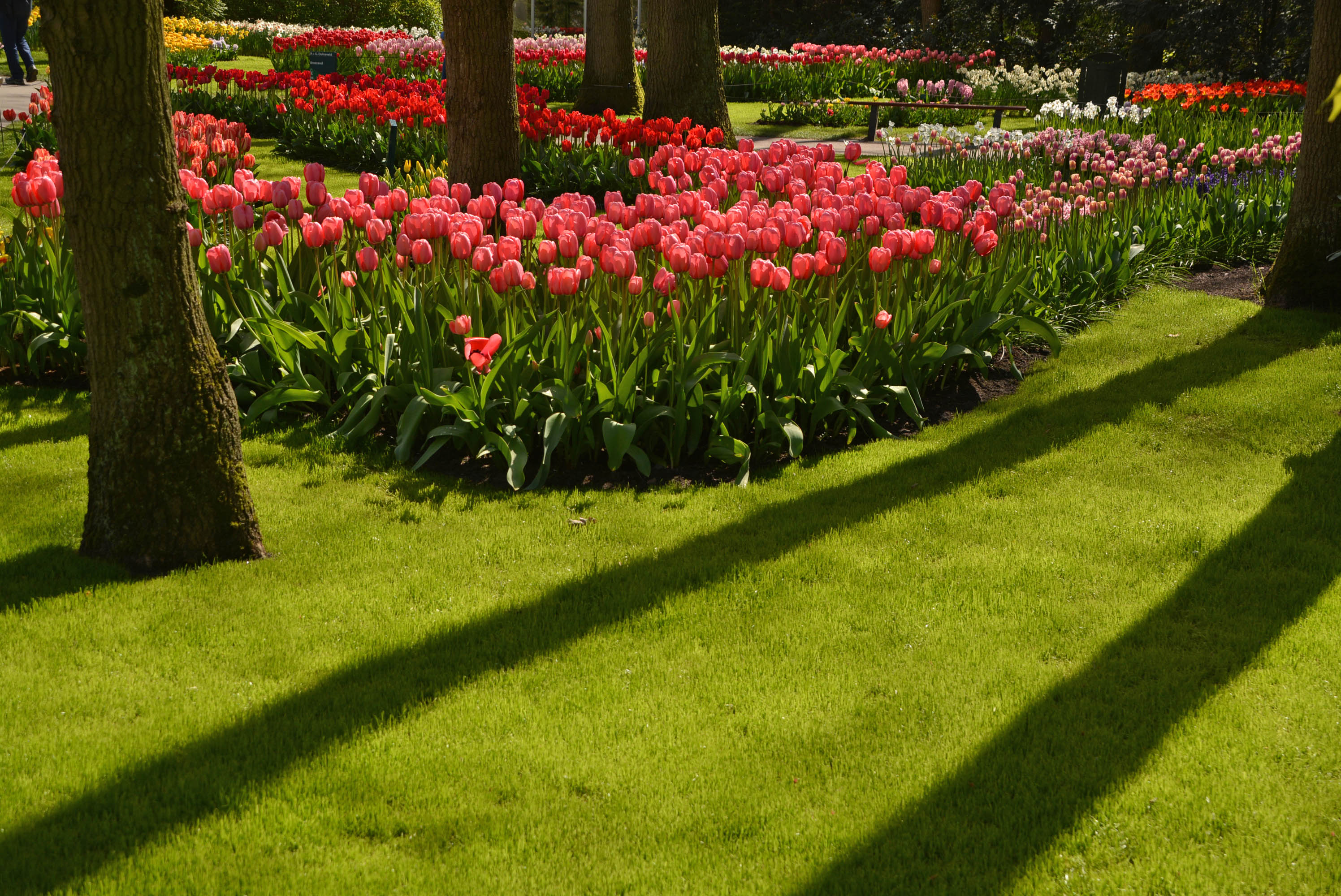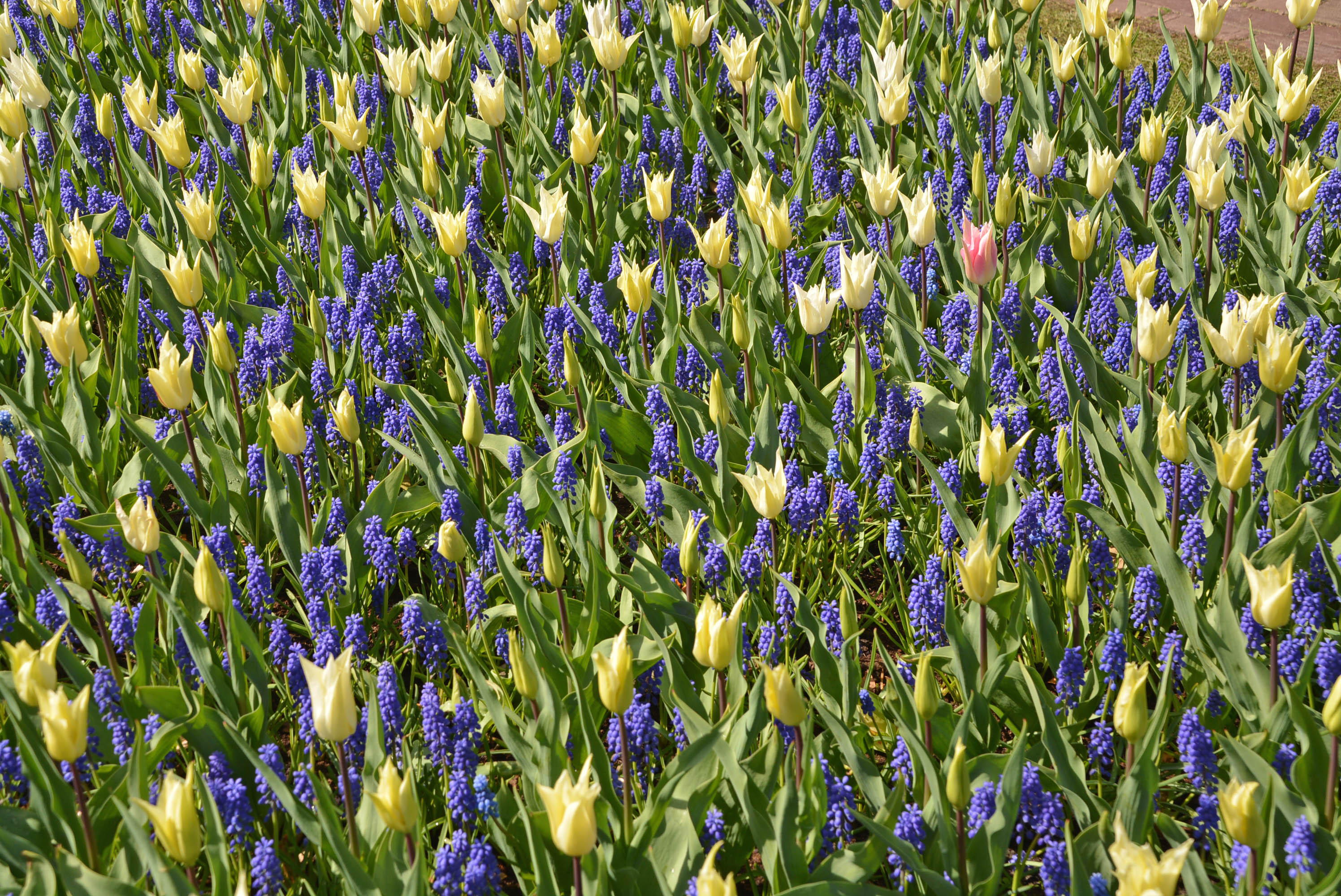 Kaum drin beginnt auch schon die Farbenpracht!  Wir sehen ein Meer von Tulpen, Narzissen, Traubenhyazinthen, Lilien und Kaiserkronen, die jedes Jahr in neuen Mustern per Hand gepflanzt werden. Pro Saison blühen hier sage und schreibe 4,5 Millionen Tulpen in hundert Varianten; sieben Millionen Blumenzwiebeln sind es insgesamt. Überall stehen, sitzen, liegen die Besucher in und neben den Tulpen, um aus allen möglichen Positionen die Blütenpracht zu fotografieren. Ich fotografiere mit was das Zeug hält.