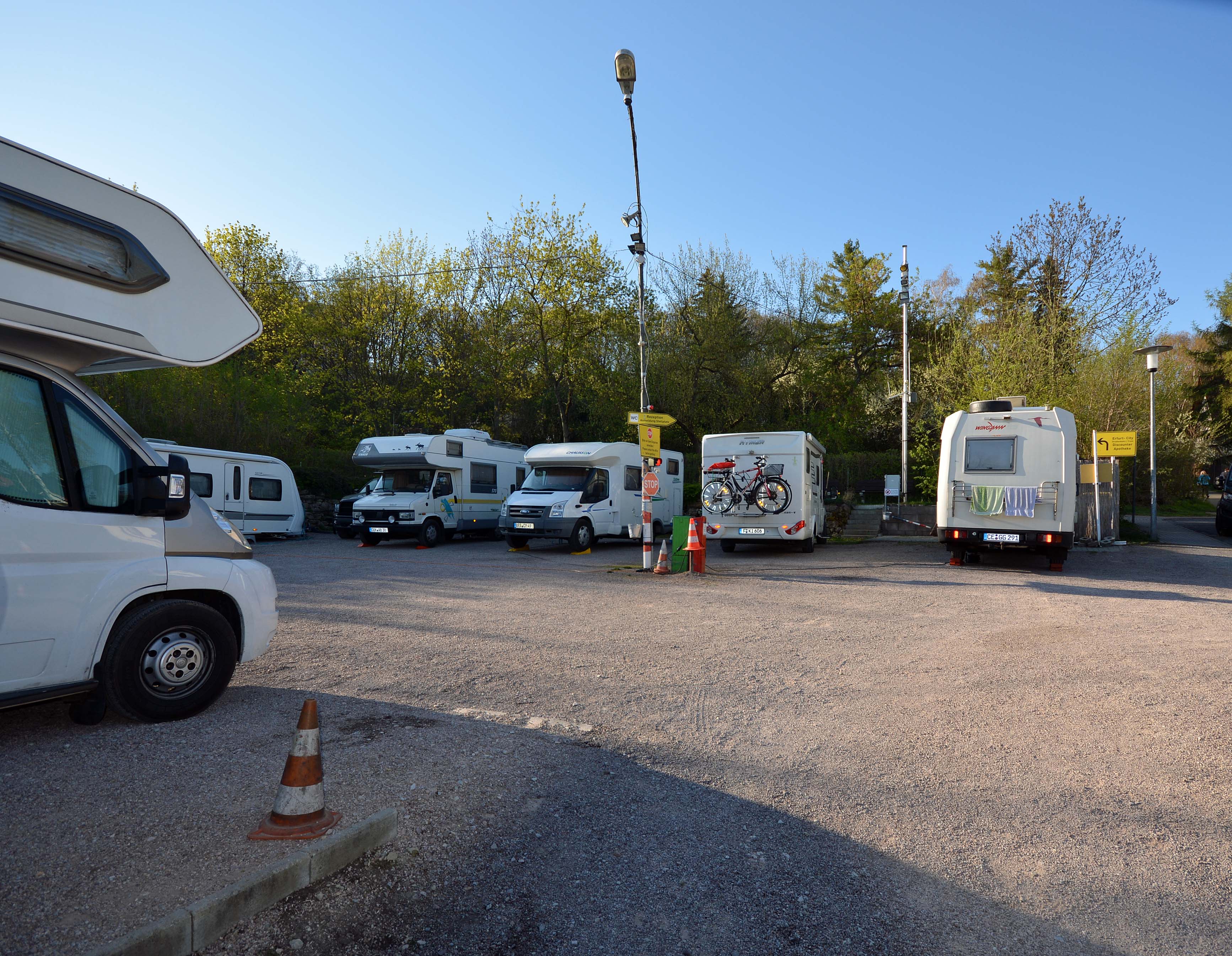 Nach kurzer Überlegung und einem WOMO-Stellplatz-Check beschließen wir, in der Landeshauptstadt Thüringens, in Erfurt, auf dem ‚Wohnmobilpark Trautmann‘ zu übernachten. Wir ergattern den letzten Platz auf dem Platz. Der ist zwar reserviert, aber offensichtlich ist auch dieses Wohnmobil irgendwo stecken geblieben. Wir genießen nicht nur unser Glück, sondern auch leckeres Essen und den Sieg der Frankfurter Eintracht in der Europa-League.