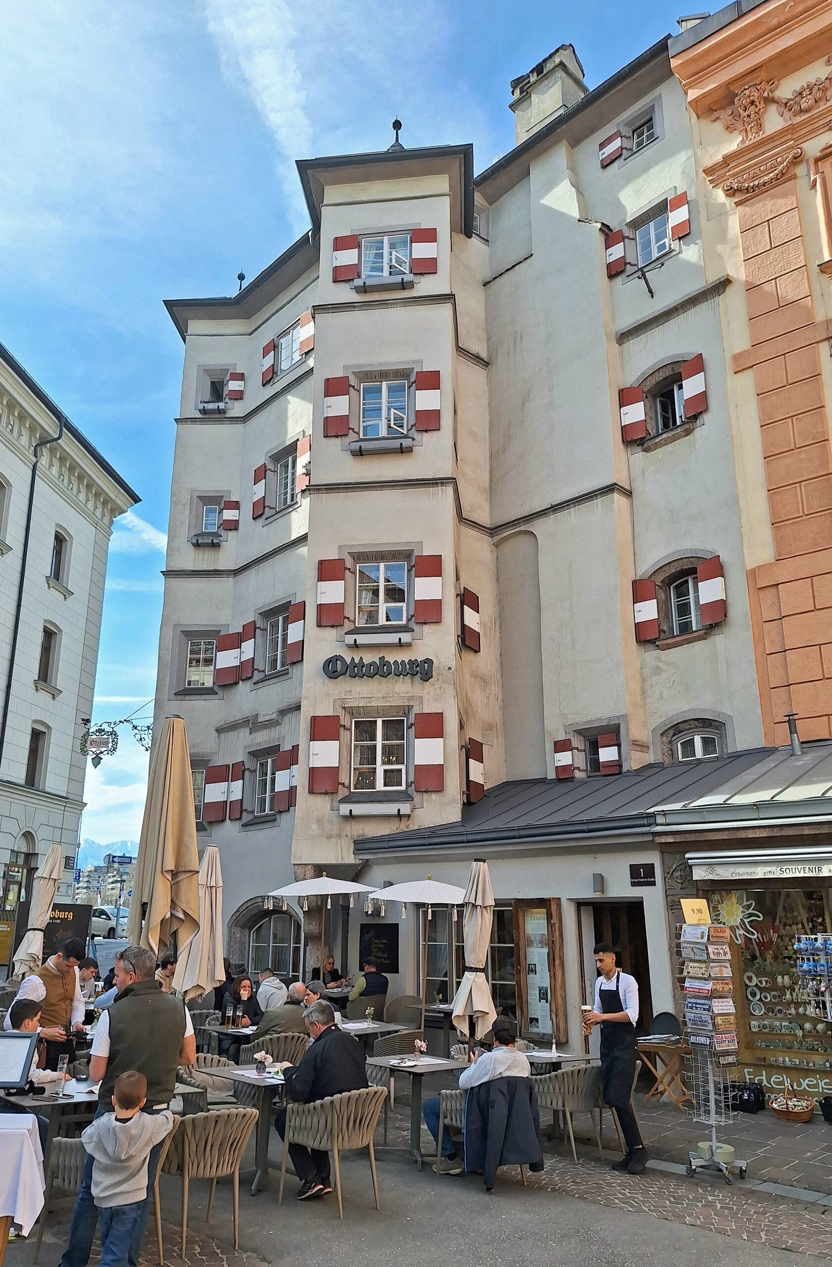 Und schon geht es an der Ottoburg hinein in die Altstadt. Das wehrhafte Gebäude am Inn mit seinen wuchtigen Erkern ist eines der ältesten Gemäuer der Stadt. Und schon bin ich mitten drin, wo gerade ein österlicher Künstlermarkt am Goldenen Dachl seine Waren anbietet.