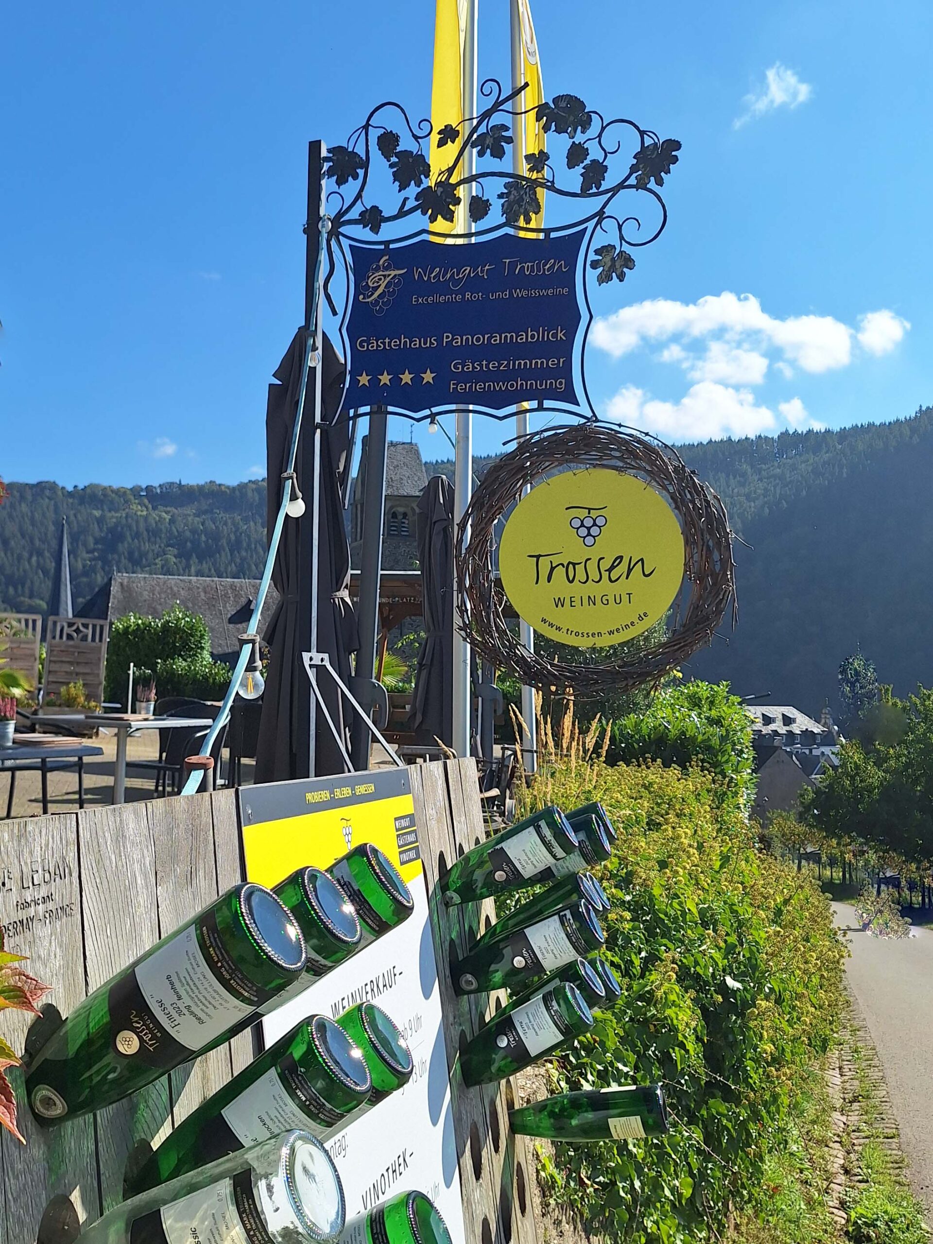 Ich schlendere eine Zeit lang an der Moselpromenade entlang, und möchte die XXL-Baumelbank finden. Ich kehre für einen Riesling in die Weinstube Trossen ein. Danach wechsle ich auf die gegenüberliegende Moselseite.