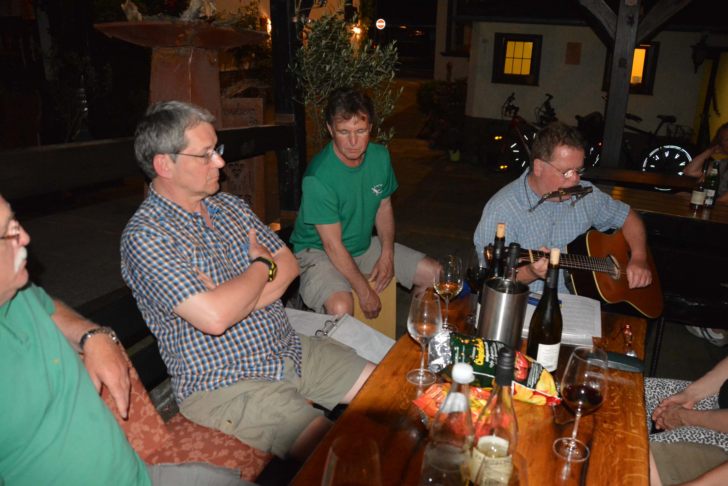 Zurück in Dernau speisen wir erneut in der Straußenwirtschaft Pauly, schauen das Pokalendspiel zwischen Dortmund und Eintracht Frankfurt, und feiern trotz knapper Niederlage der Frankfurter bis Mitternacht mit Vino vom Chef des Hauses. Jo streichelt die Klampfe, Ute singt und Klaus trommelt auf der Cachon.