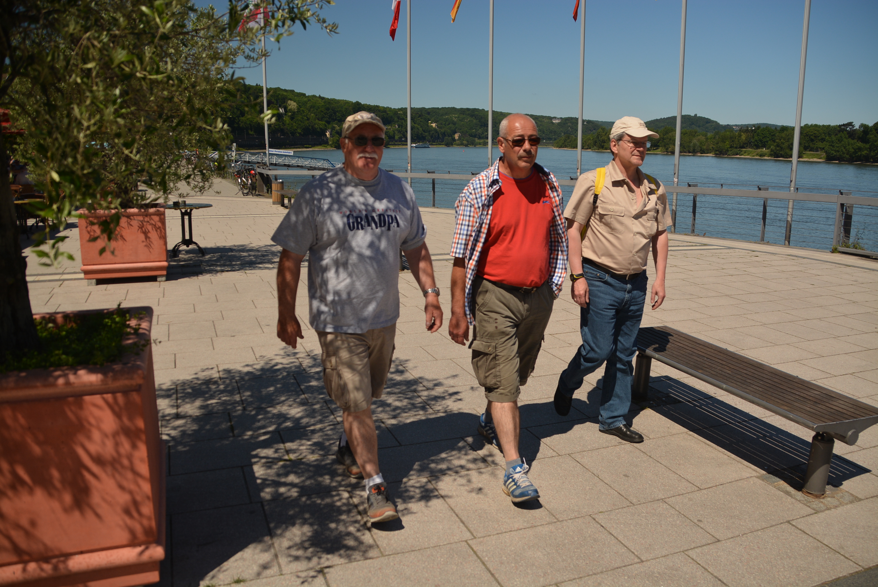 Zwischenstopps sind kaum möglich, da die Aufenthaltsdauer an Land zu kurz ist. Deshalb stellen wir einen Weltrekord im Rumsitzen auf. Nach mehr als vier Stunden Rundfahrt, tropischen Temperaturen und Hungerlöchern im Bauch erreichen wir wieder Remagen. Klaus und ich sind ein bisschen neidisch auf die beiden Radfahrer. Nach dieser Sitzorgie drängt es uns nach Bewegung. Aber….Hätte, hätte, Fahrradkette!!!