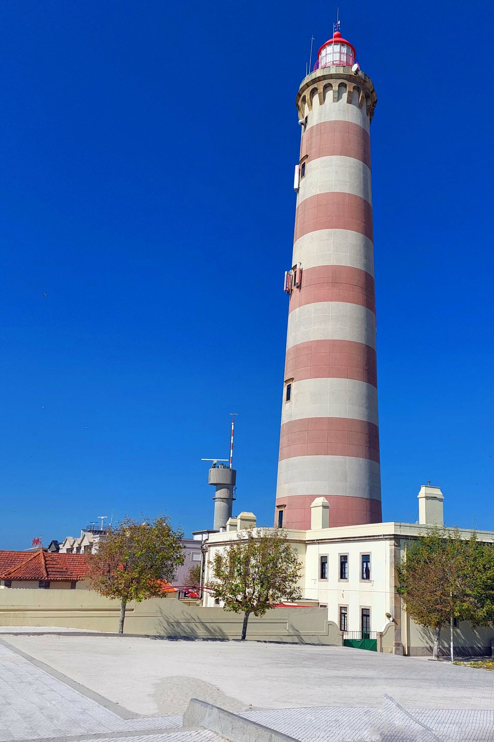 Das Ziel, was ich mir dann aus dem reichhaltigen Programm ausgesucht habe, ist der Praia da Barra. Malerische Holzstege verlaufen entlang des Dünenareals. Es ist stahlblauer Himmel, ziemlich kühl und starker Wind. Eine Jacke habe ich nicht dabei, Trotzdem entschließe ich mich, die 271 Stufen des aus dem 19. Jahrhundert stammenden Leuchtturms Farol de Aveiro hinaufzuklettern. Er ist von den 48 aktiven Leuchttürmen der höchste Portugals und einer der größten in Europa. Der Besuch ist kostenlos.