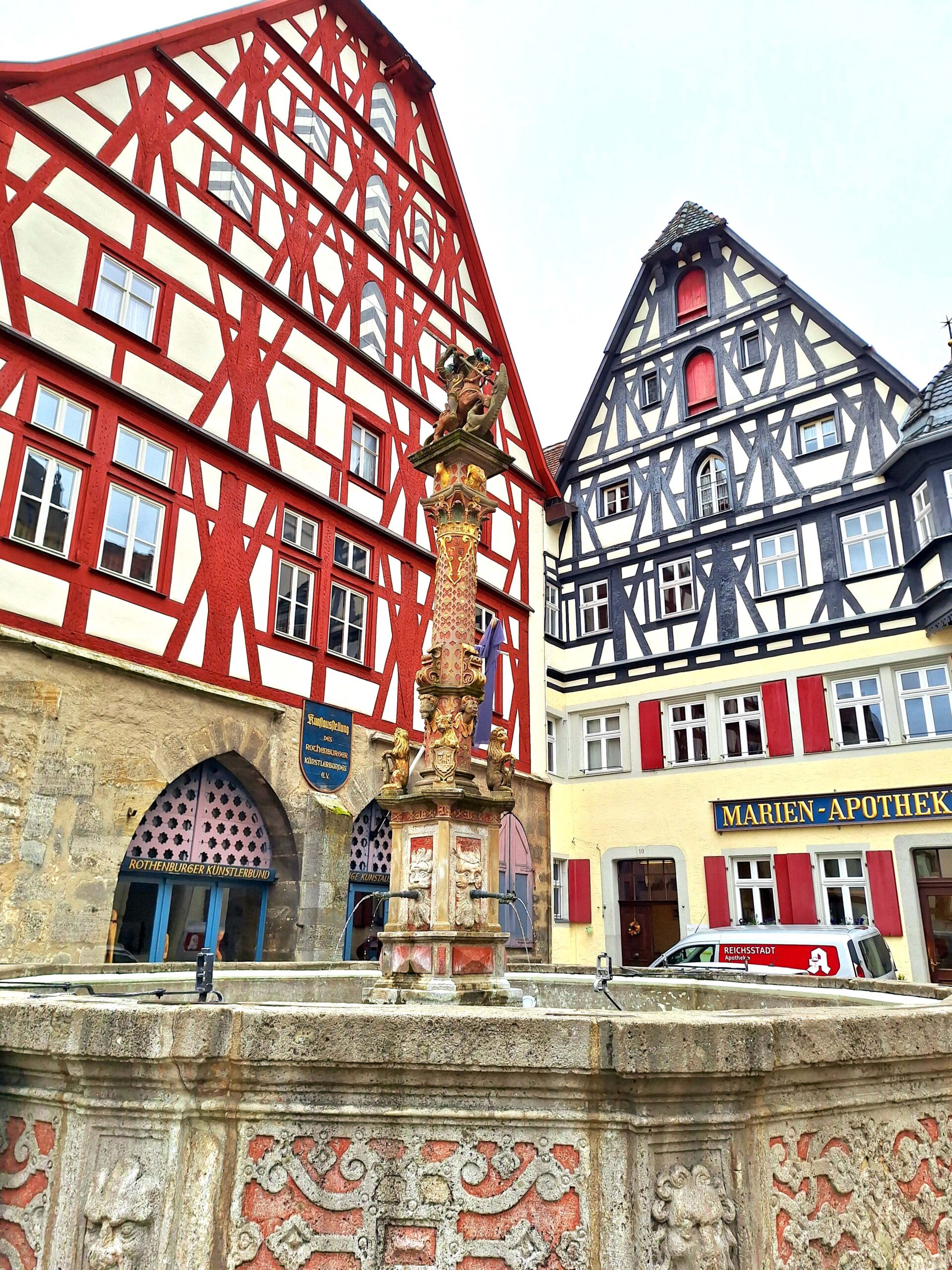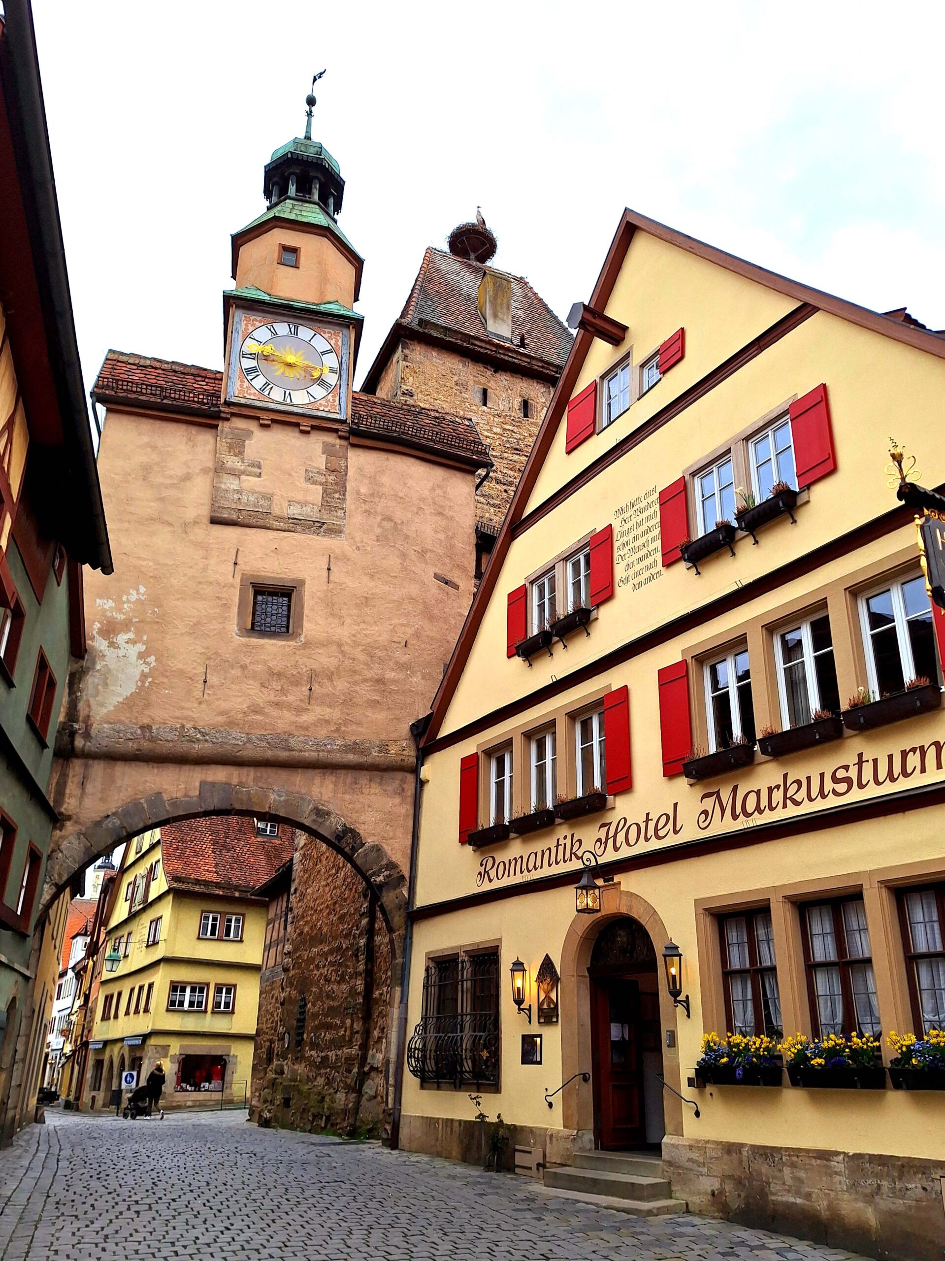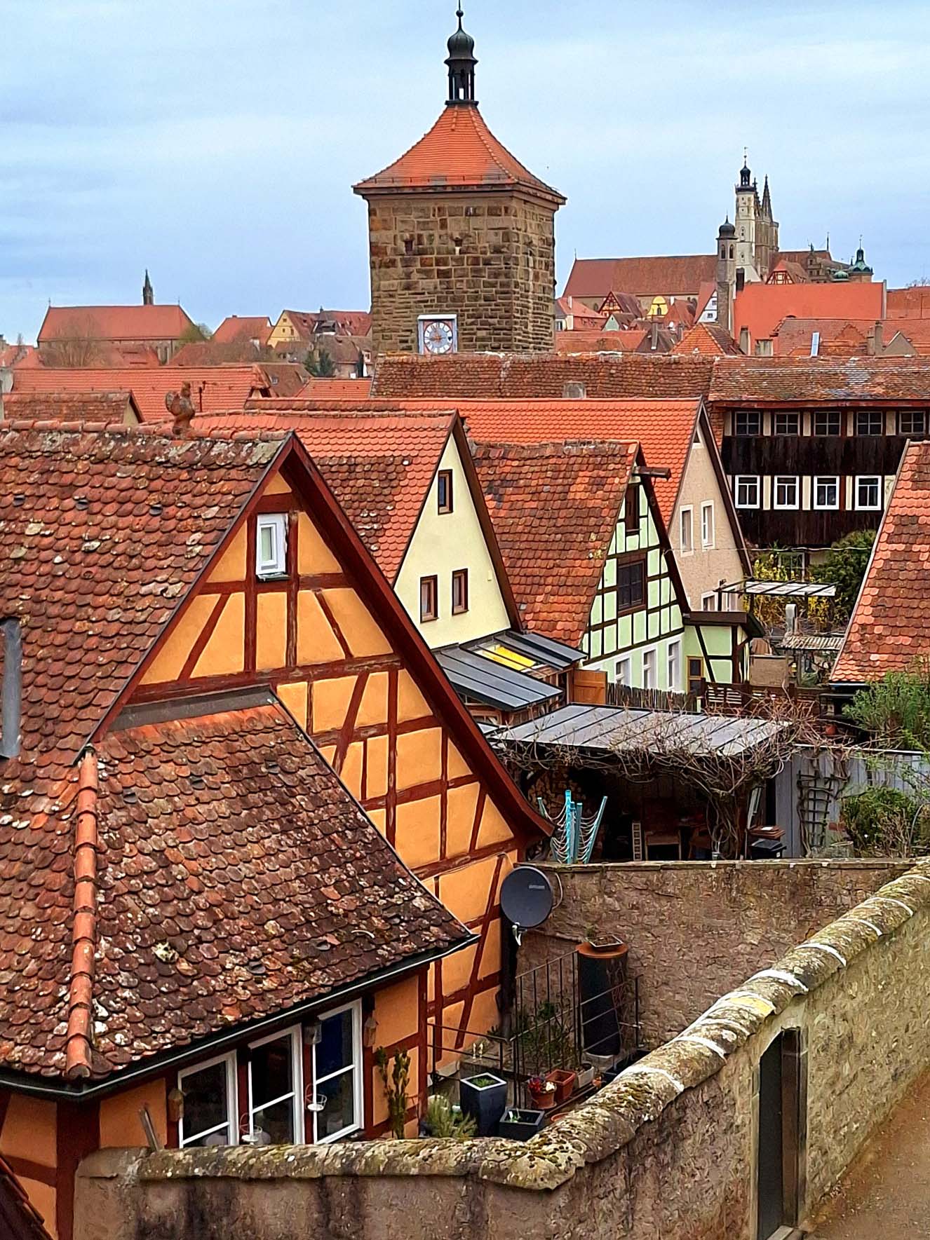 Es ist bedeckt, regnet aber nicht. ☁️ Es geht nochmal kurz ins mittelalterliche Rothenburg. Ich bin eine von 2 Mio. Touristen, die das Städtchen jährlich überrennen. 🙈