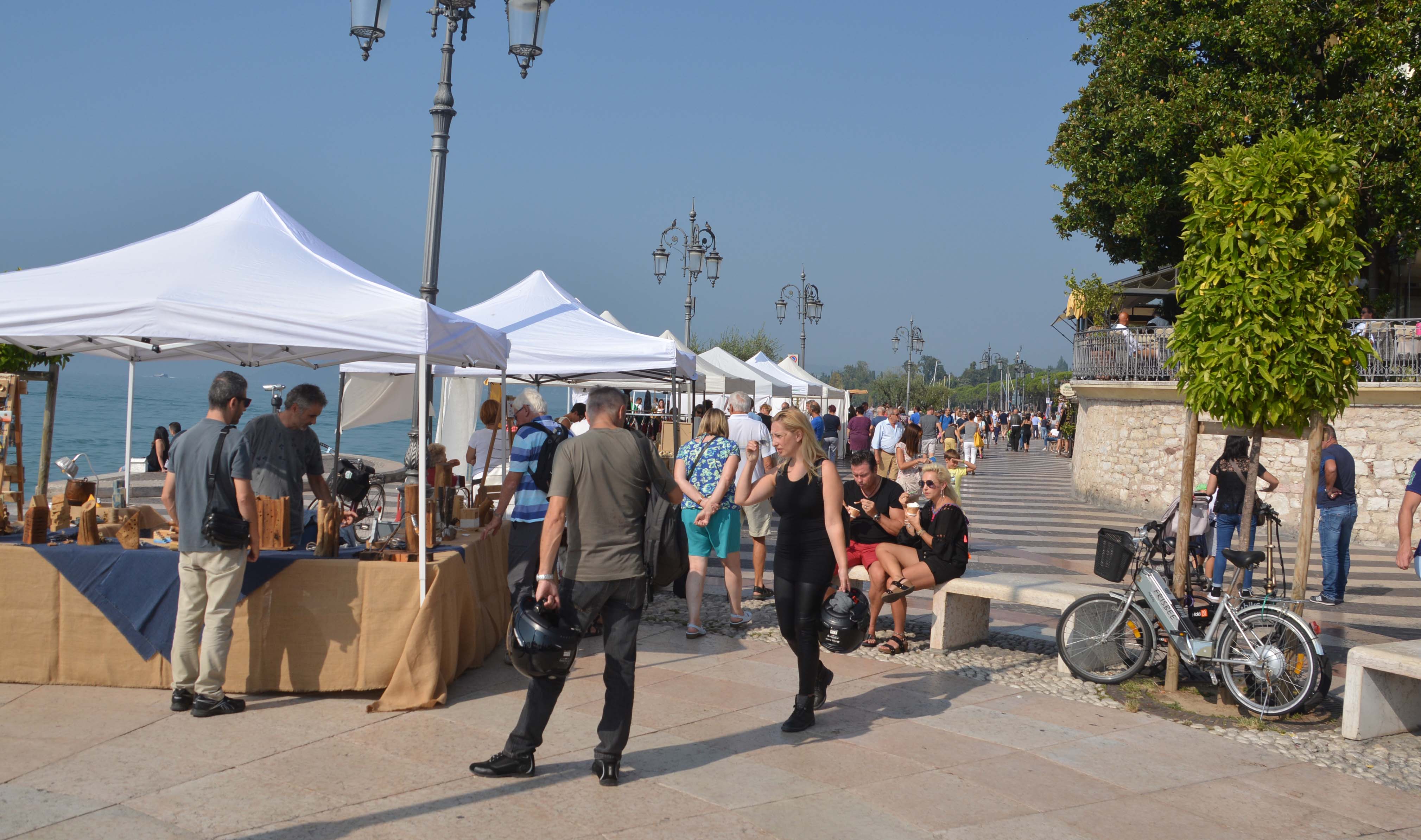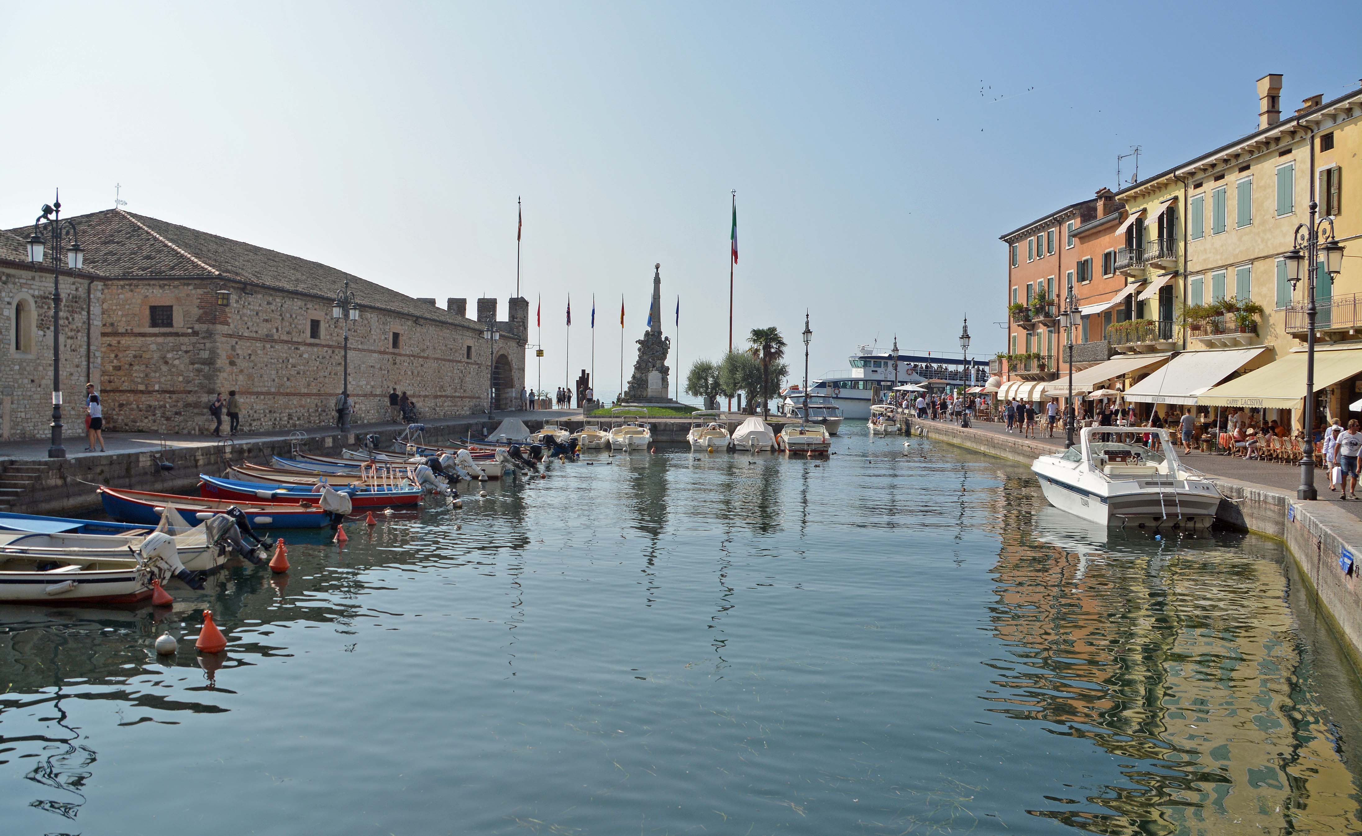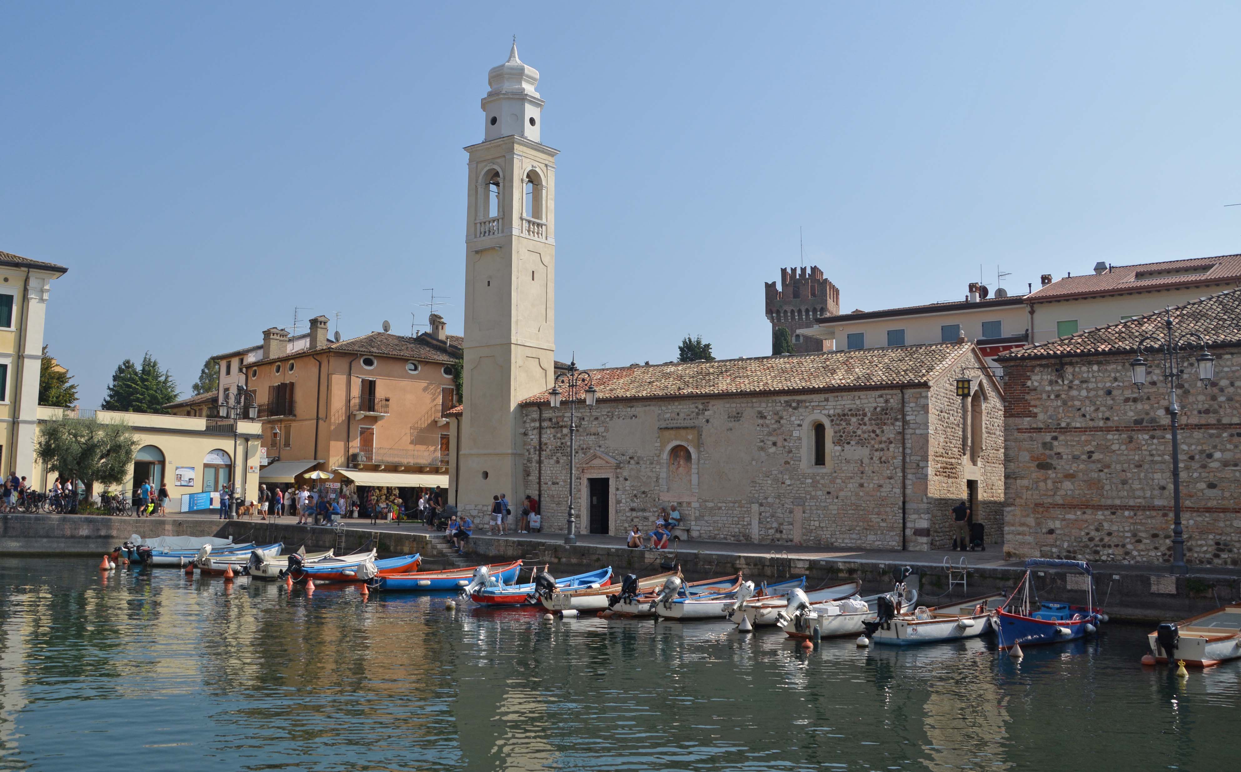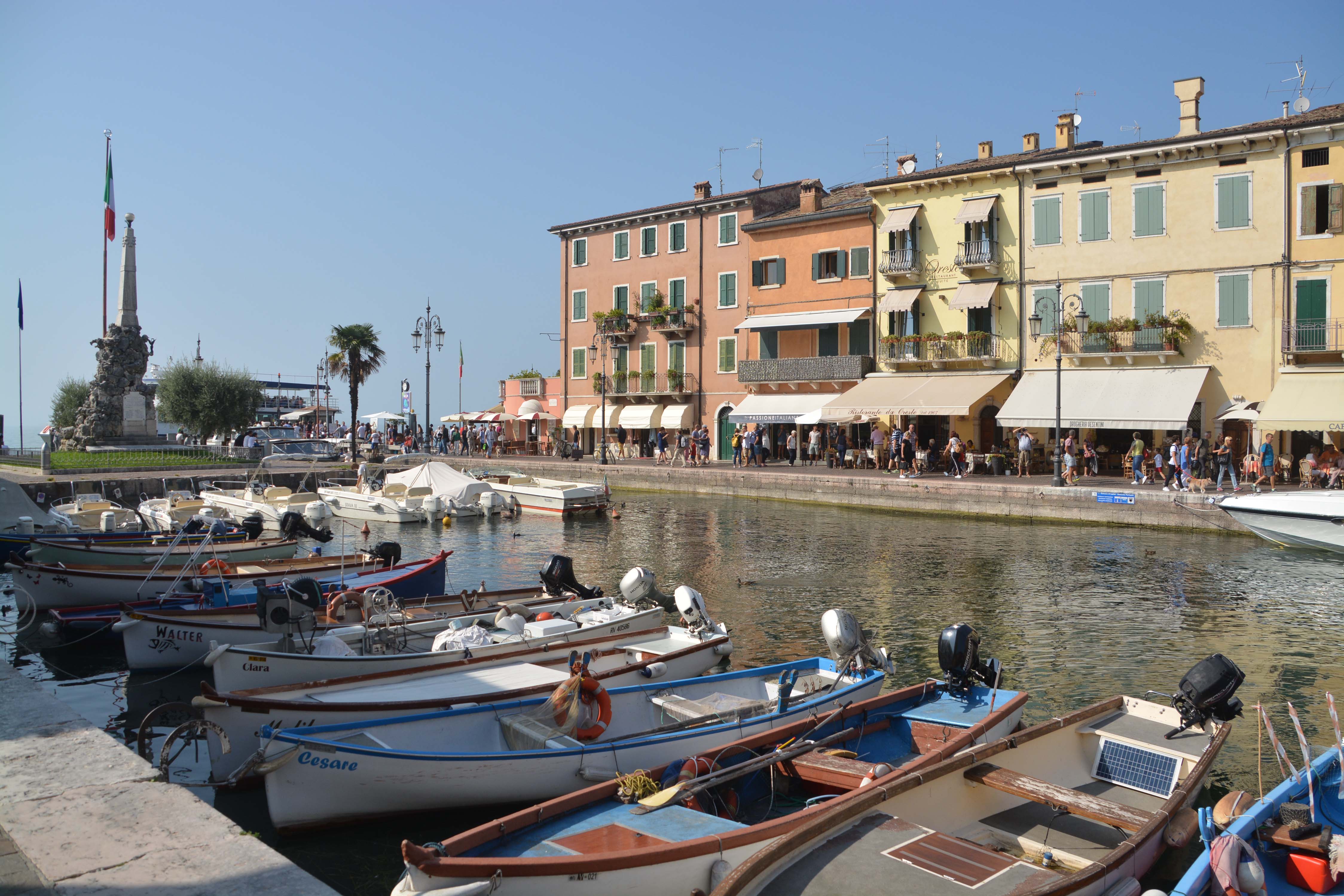 Weiter geht’s bei jetzt sonnigem Wetter bis kurz vor Lazise. Hier finden wir eine nette Bar, direkt an der Flaniermeile Richtung Altstadt. Natürlich schlürfe ich einen Aperol Sprizz und Klaus sein obligatorisches Bier. Wir essen noch eine Kleinigkeit und stürzen uns in den sonntäglichen Trubel der mittelalterlichen Stadt Lazise.