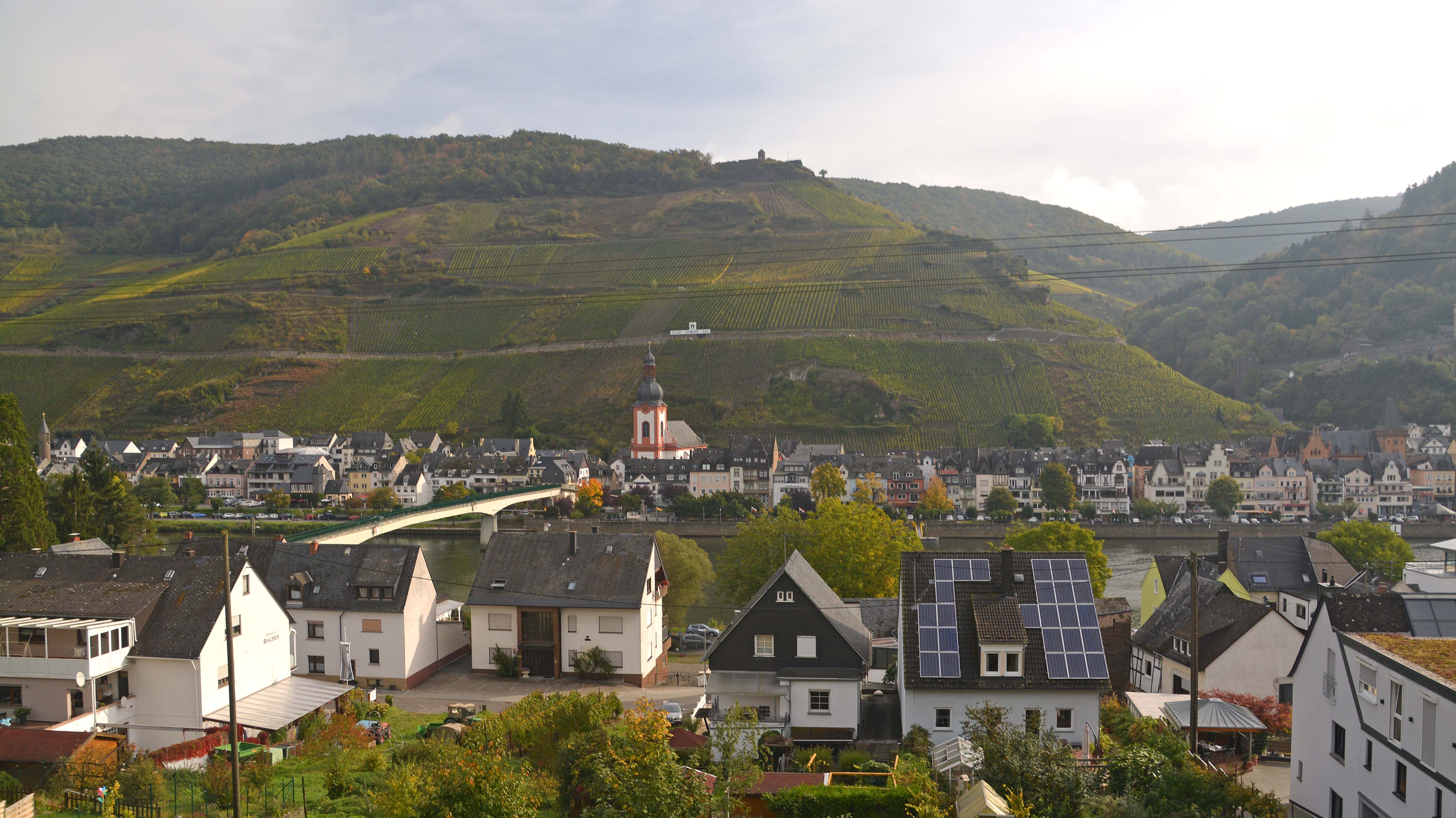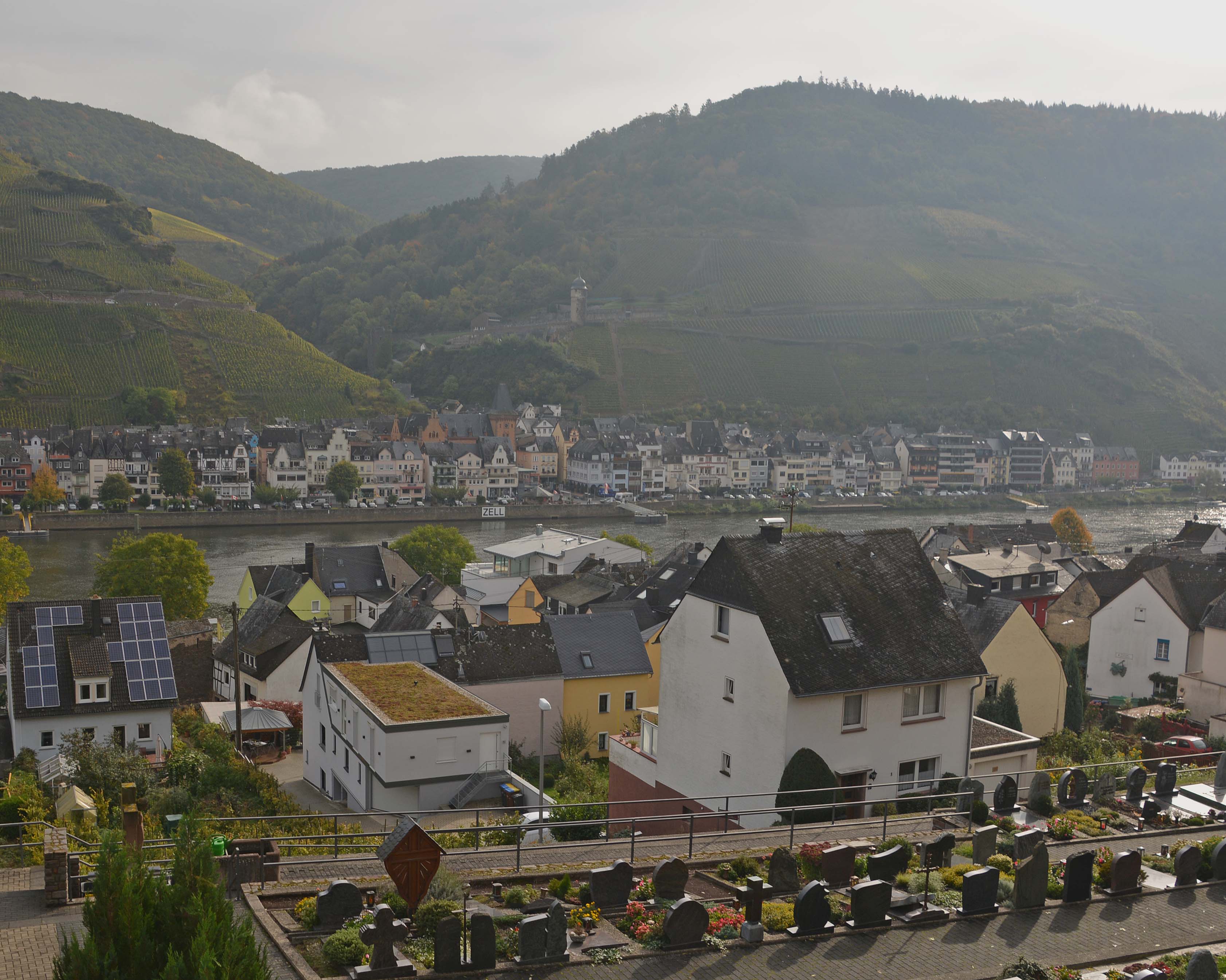 Ich fahre spontan nach St. Aldegund zur ‚Weinmanufaktur Walter Oster‘. Hier kaufe ich Trester, Weinbergspfirsichlikör und eine Flasche Federweißen für heute Abend. Erst dann starte ich durch nach Frankfurt. Noch ein Blick auf Zell einige Sekunden verweilen und ab durch den Hunsrück auf die Autobahn. Es ist ¼ nach Elf.