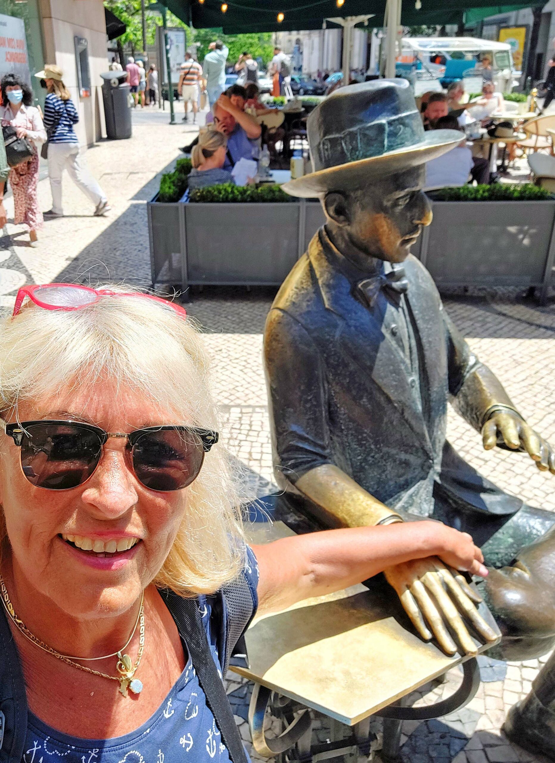 Und weil ich im Auf-und-Ab-Training bin, nehme ich den Fußweg. Ich treffe direkt auf das berühmte Literatur-Café A Brasileira aus der Belle Epoque, eines der ältesten Lissabons. Es war Treffpunkt zahlreicher portugiesischer Schriftsteller. Einer von ihnen, Fernando Pessoa, sitzt immer noch draußen auf einer Bank und ist jederzeit bereit für ein Selfie.