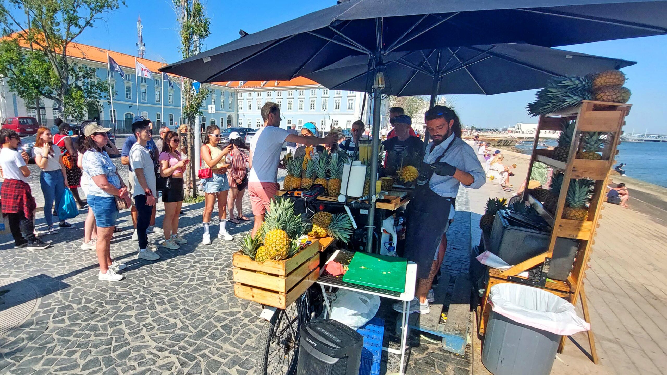 Ich wende mich zunächst dem beliebtesten Wahrzeichen der Stadt zu, dem Torre de Belém aus dem 16. Jahrhundert. Er wird vom Tejo umspült. Ich stehe da und stelle mir vor, wie die Seefahrer hier verabschiedet und wieder begrüßt wurden. Danach lasse ich mich am Ufer des Tejo treiben .Mittlerweile ist es 30 Grad und ich hänge bereits an der vierten Flasche Wasser. An den vielen Pina Colada –Ständen wird das Getränk in einer frischen Ananas serviert. Sehr dekorativ!