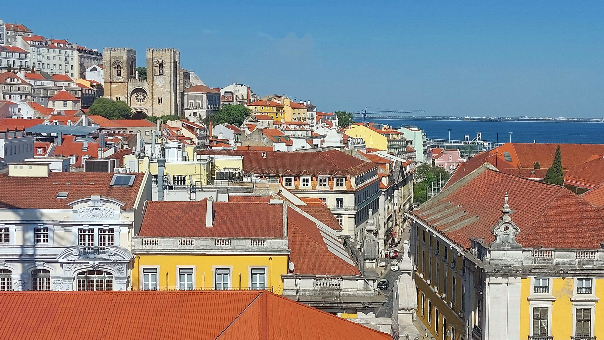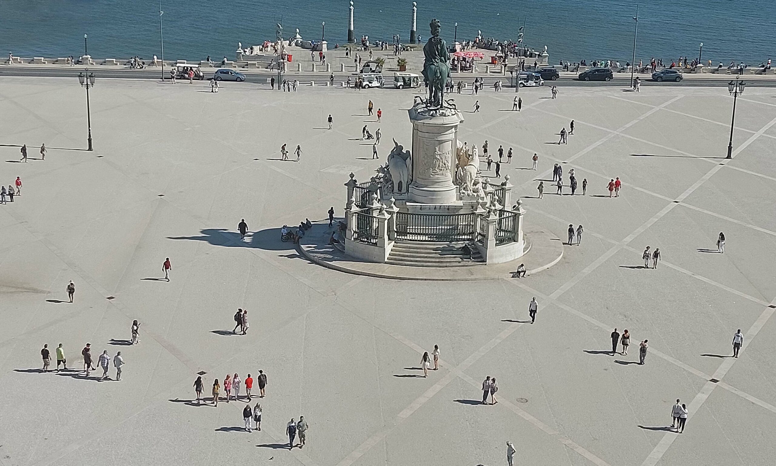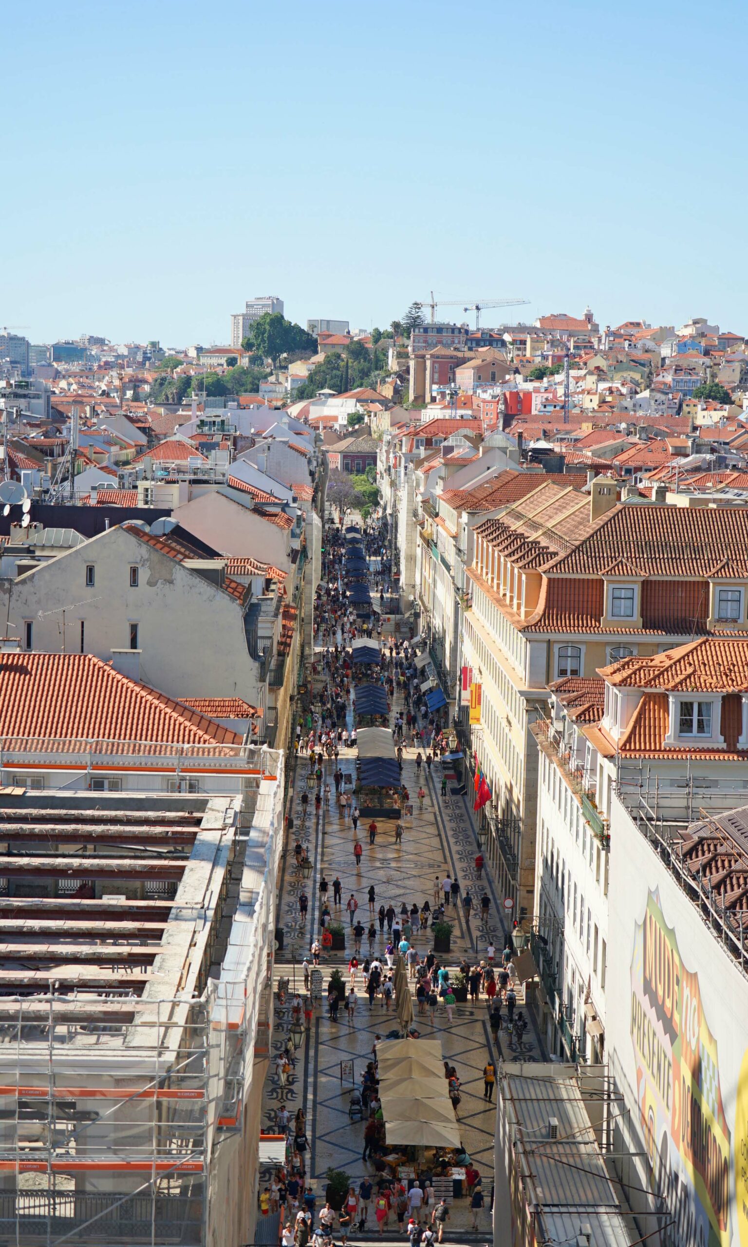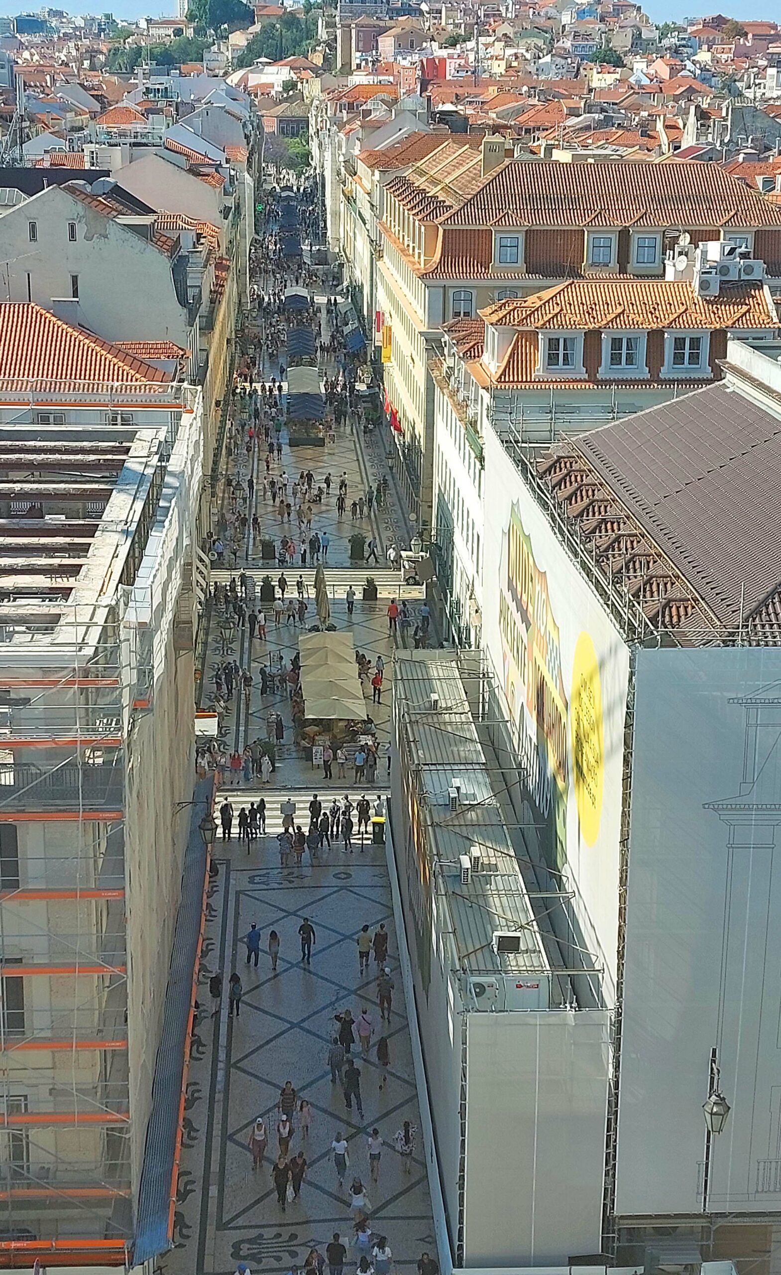Ich steige noch auf den Triumphbogen und genieße einen fantastischen Blick auf die Rua Augusta. Und den Stadtteil Baixa. Von hier oben ist das schwarz-weiß gemusterte Straßenpflaster aus handgehauenen Steinwürfeln gut zu erkennen.