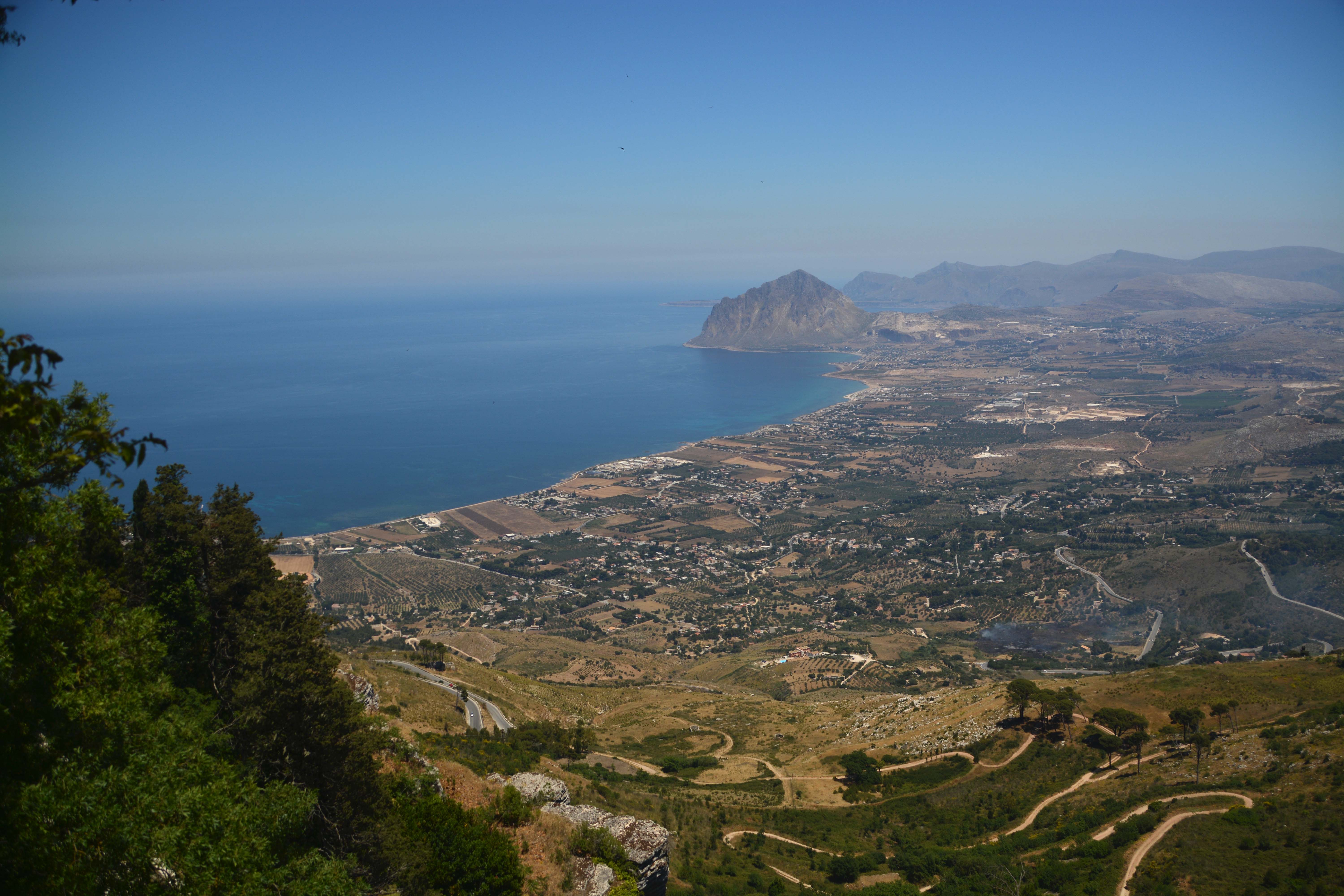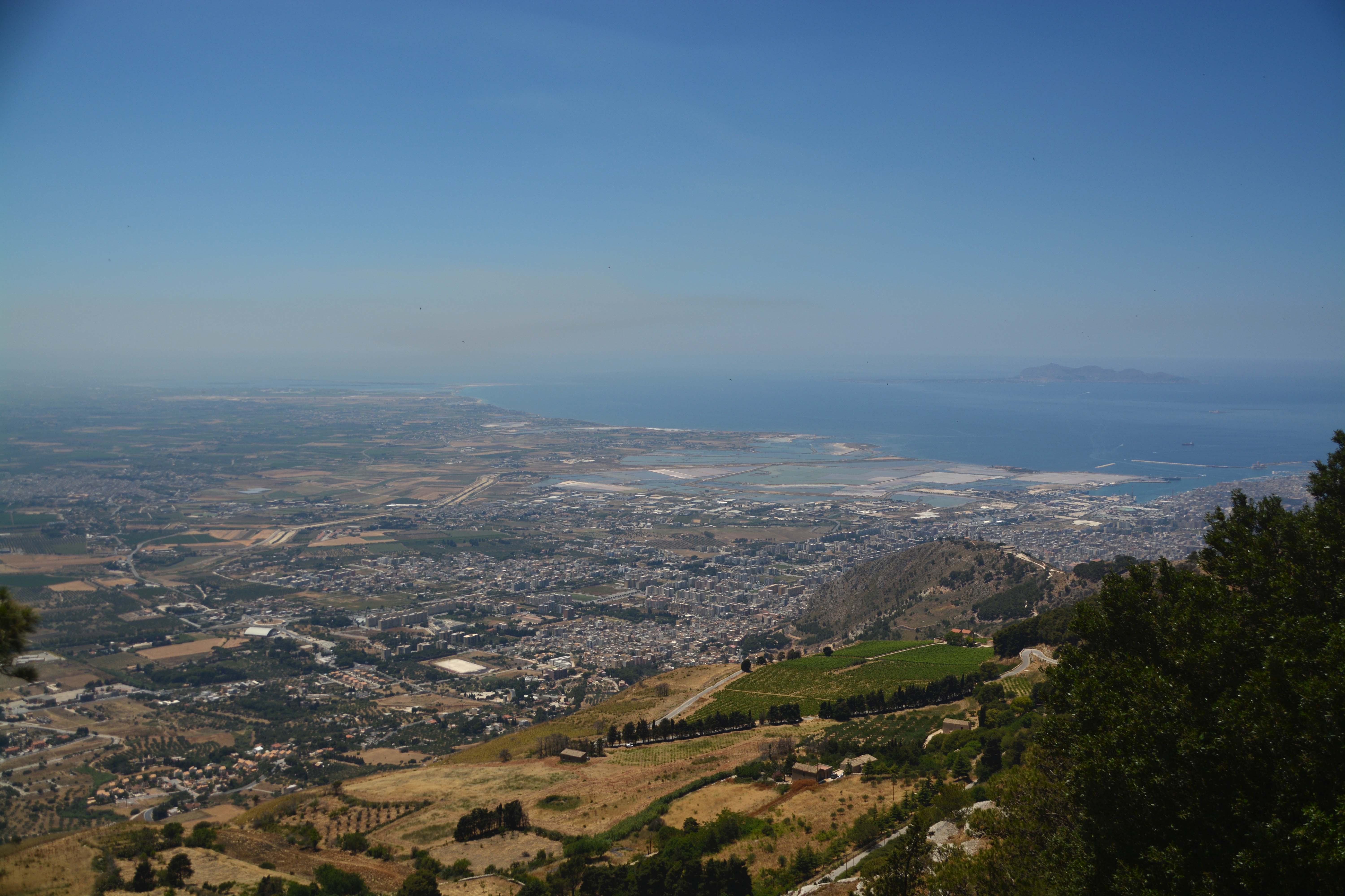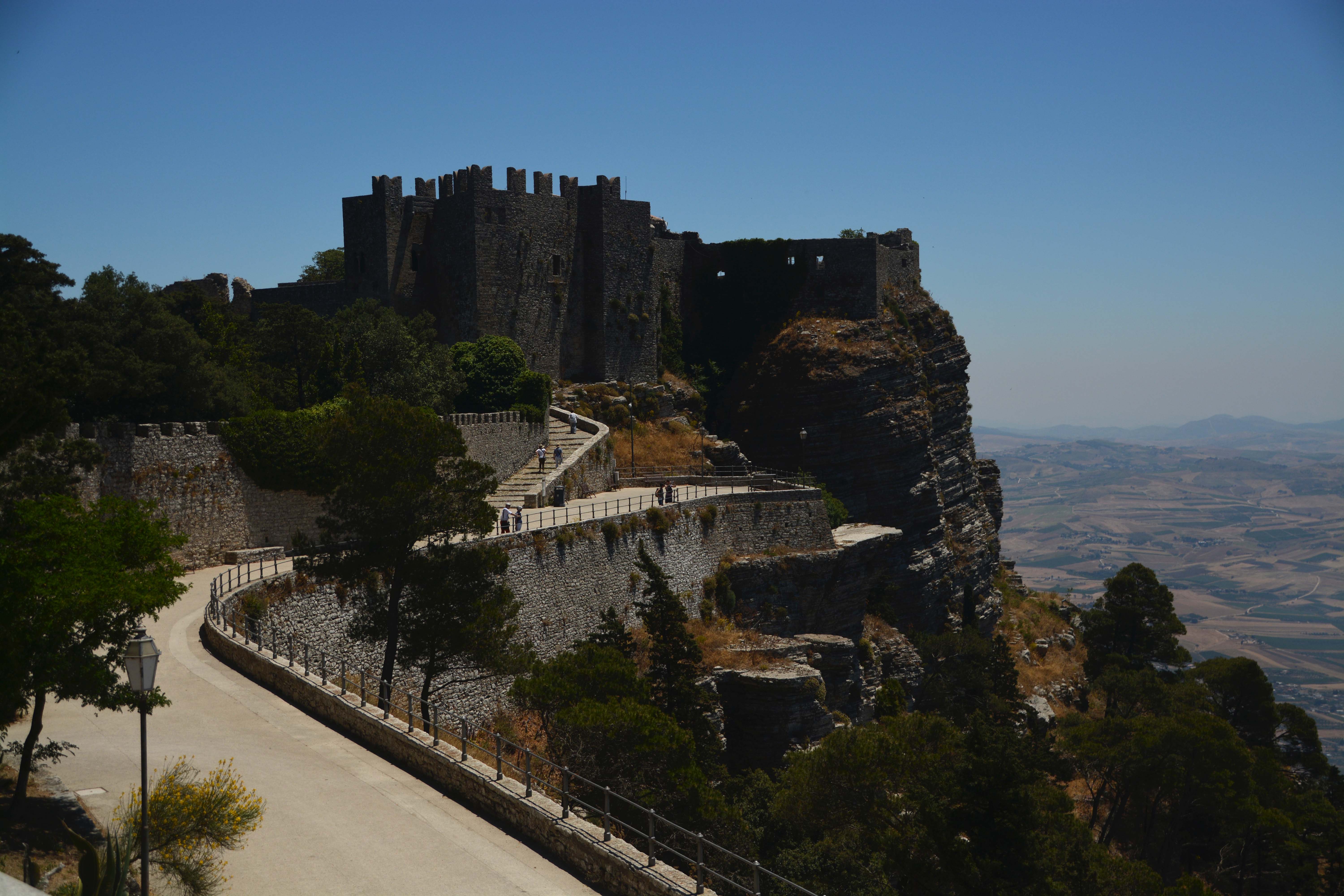 Sofort nach Valderice beginnt eine kurvenreiche Fahrt durch zahllose Olivenhaine, über Sant‘ Andrea, Bonagia und Valderice. Klaus beobachtet ein größeres Feuer, das der Wind genau in unsere Fahrtrichtung bläst. Fiete schraubt sich davon unbeeindruckt Kurve für Kurve auf der Serpentinenstraße ‚Strada del Vino‘ hoch auf den 750 Meter hoch liegenden ‚Monte Erice‘, wo mittelalterliches Erbe in der gleichnamigen Stadt auf uns wartet. Oh, Gott, bitte jetzt kein Bus auf der Gegenseite, denke ich und drücke fest beide Daumen. Begleitet werden wir mit spektakulären Ausblicken auf die Hafenstadt Trapani und einem grandiosen Panorama auf die Küste. Fantastisch!