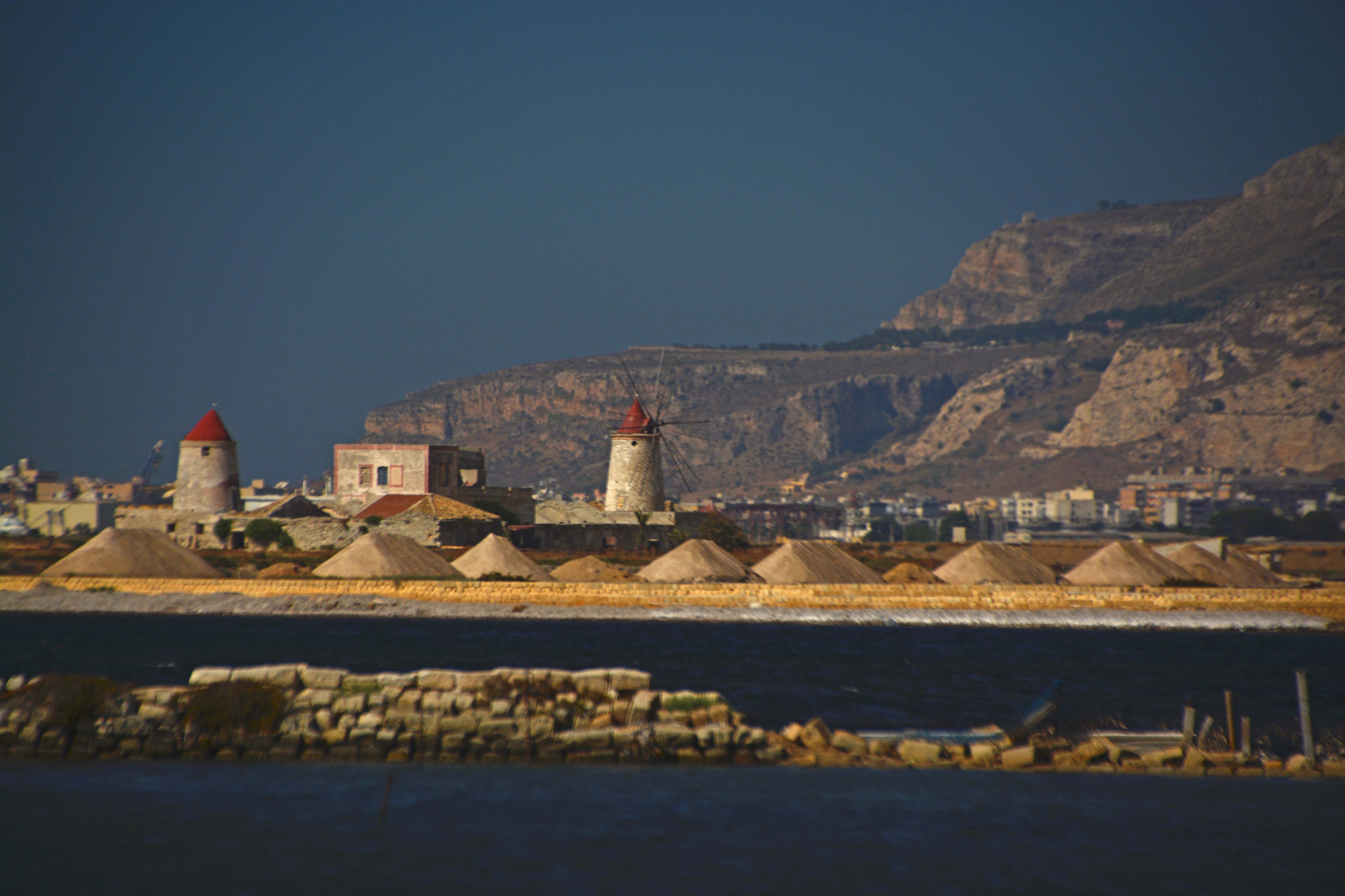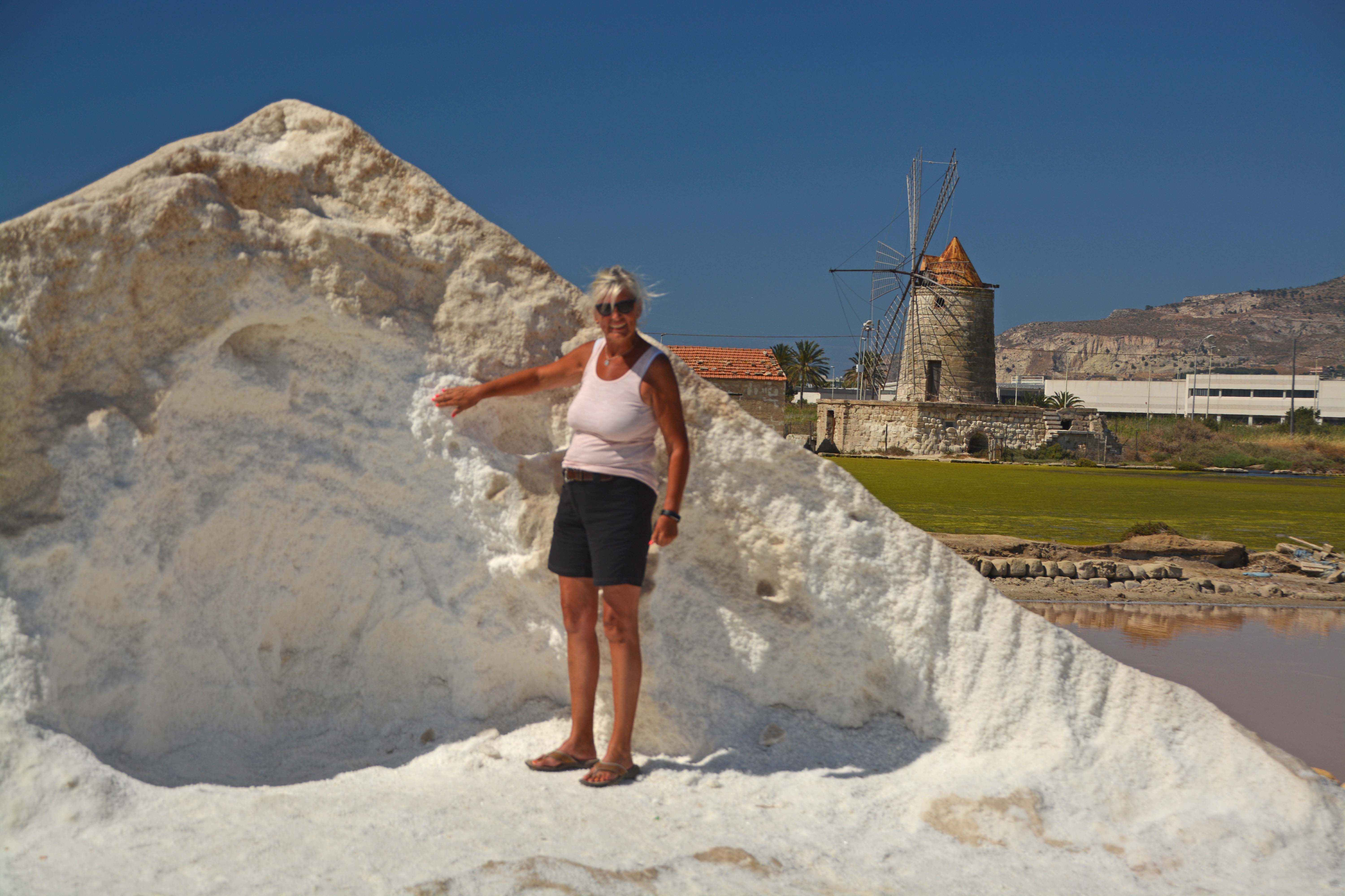 Wir erlösen Fiete von seinem Knallsonnenplatz und runter geht’s Richtung Hafenstadt Trapani. Ein kleines Stück fahren wir durch die verkehrsreiche Stadt, finden schnell die SS 115, auf der wir zur 22 Kilometer langen Küstenstraße SP 21, der ‚Via del Sale‘, mit ihren alten Windmühlen, einem Gitternetz von Salinen und seltenen Vögeln fahren. Das Gebiet der Salinen umfasst die Städte Trapani, Paceco und Marsala. Es ist heute als ‚Kulturland‘ anerkannt. Wir stoppen spontan an einer Mühle, die besichtigt werden kann. Klaus entdeckt einen großen schneeweißen Salzhügel. Pustekuchen, alles ist verlassen, die Türen geschlossen, keine Hinweisschilder. Ganz großes Besichtigungs-Kino! Klaus organisiert ein kleines Päckchen des weißen Goldes, dass hier schon seit 3000 Jahren gewonnen wird.