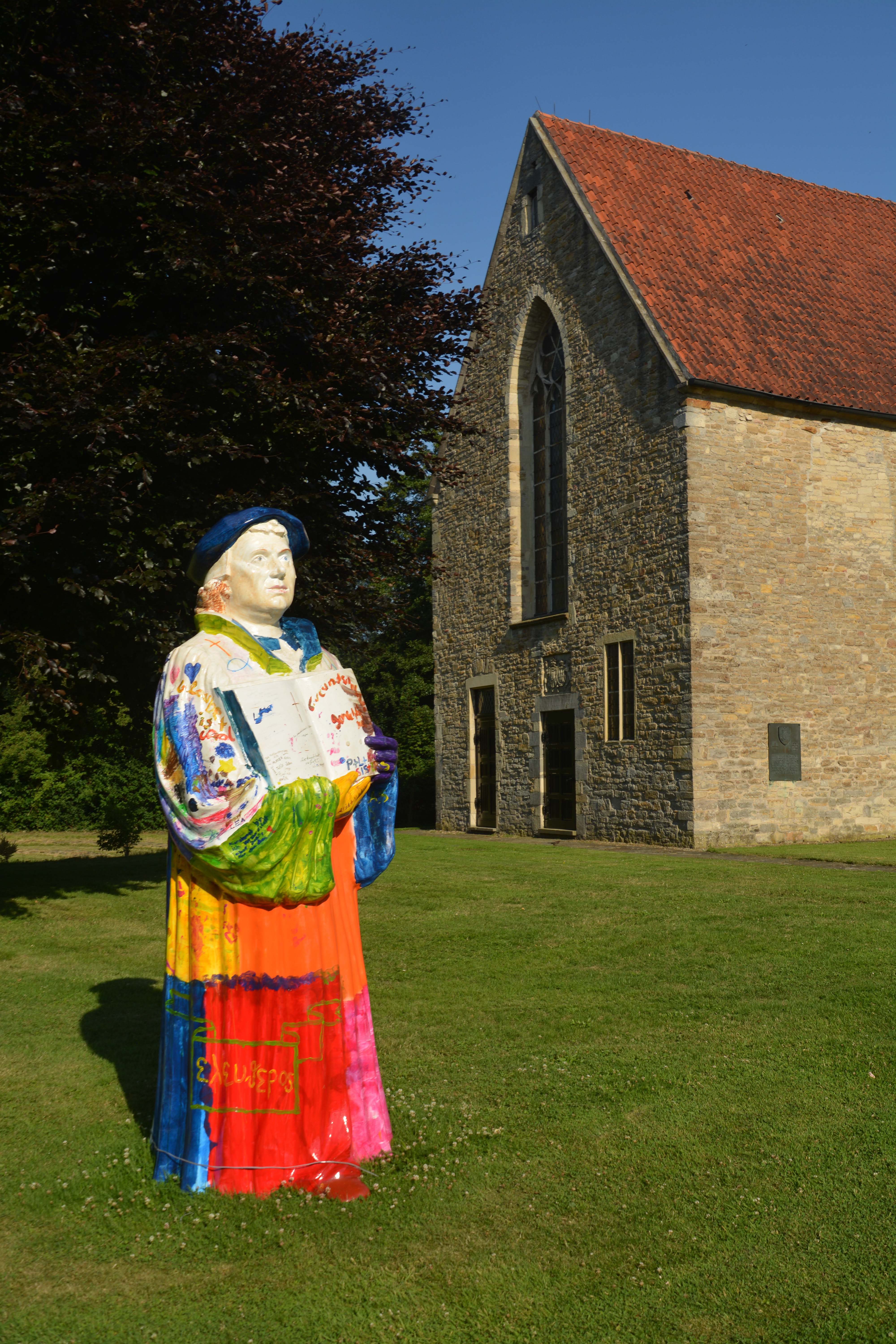 Wir kommen an der von Martin Luther bewachten Großen Kirche vorbei, am Alten Rathaus, einem Renaissancebau von 1561, an den Professorenhäusern am Markt, und der ‚steinernen Furt‘, einem Wasserspiel auf dem historischen Marktplatz, in das Steine mit 11 Jahreszahlen und Symbolen eingearbeitet sind. Hinter jedem dieser Steine verbergen sich historisch wichtige Ereignisse, die über einen QR-Code abgerufen werden können.