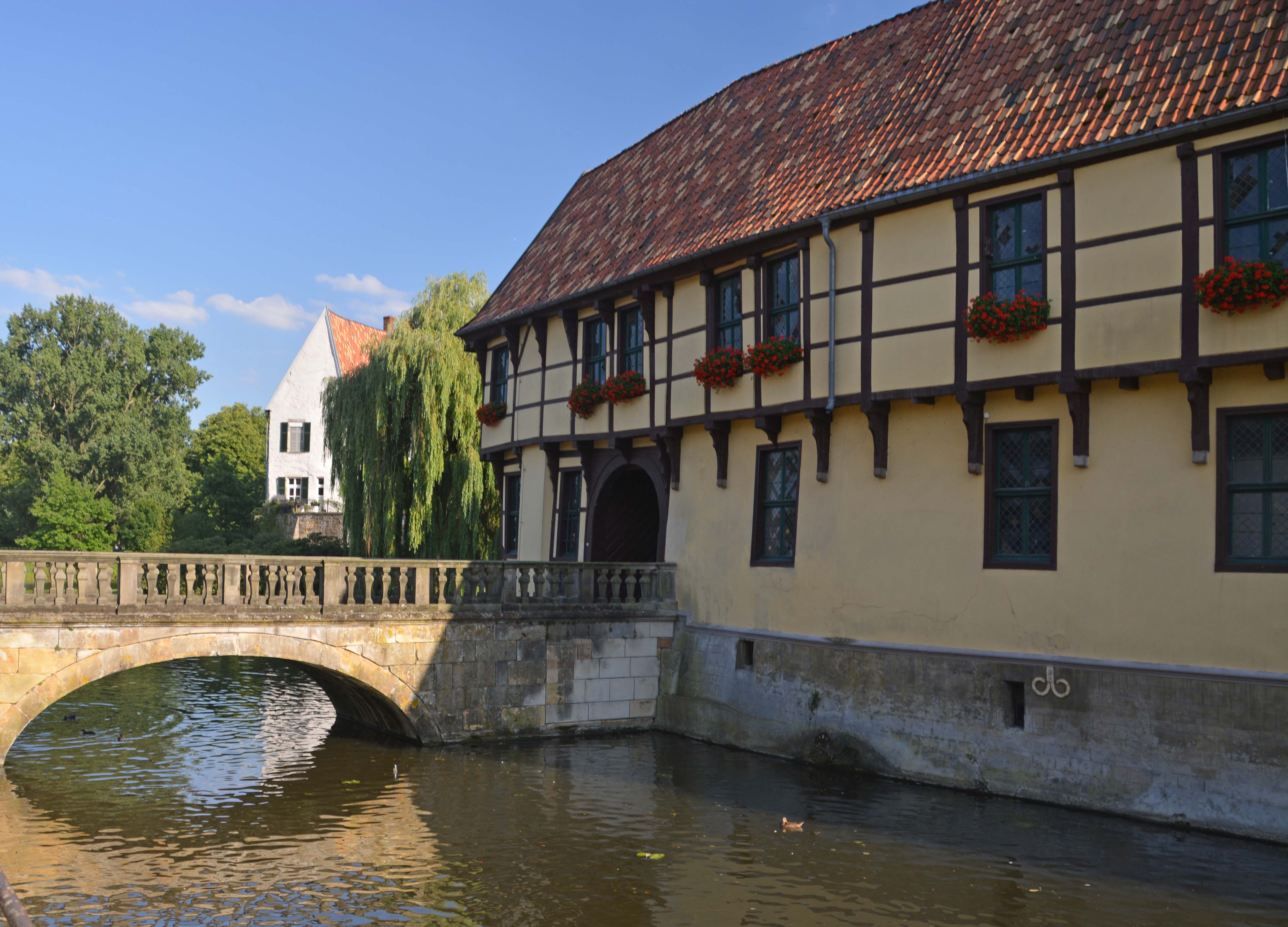 Wir erreichen das Wasserschloss von 1129, die älteste Wasserburganlage Westfalens, die auf zwei Inseln der Steinfurter Aa liegt. Einfach wunderschön!