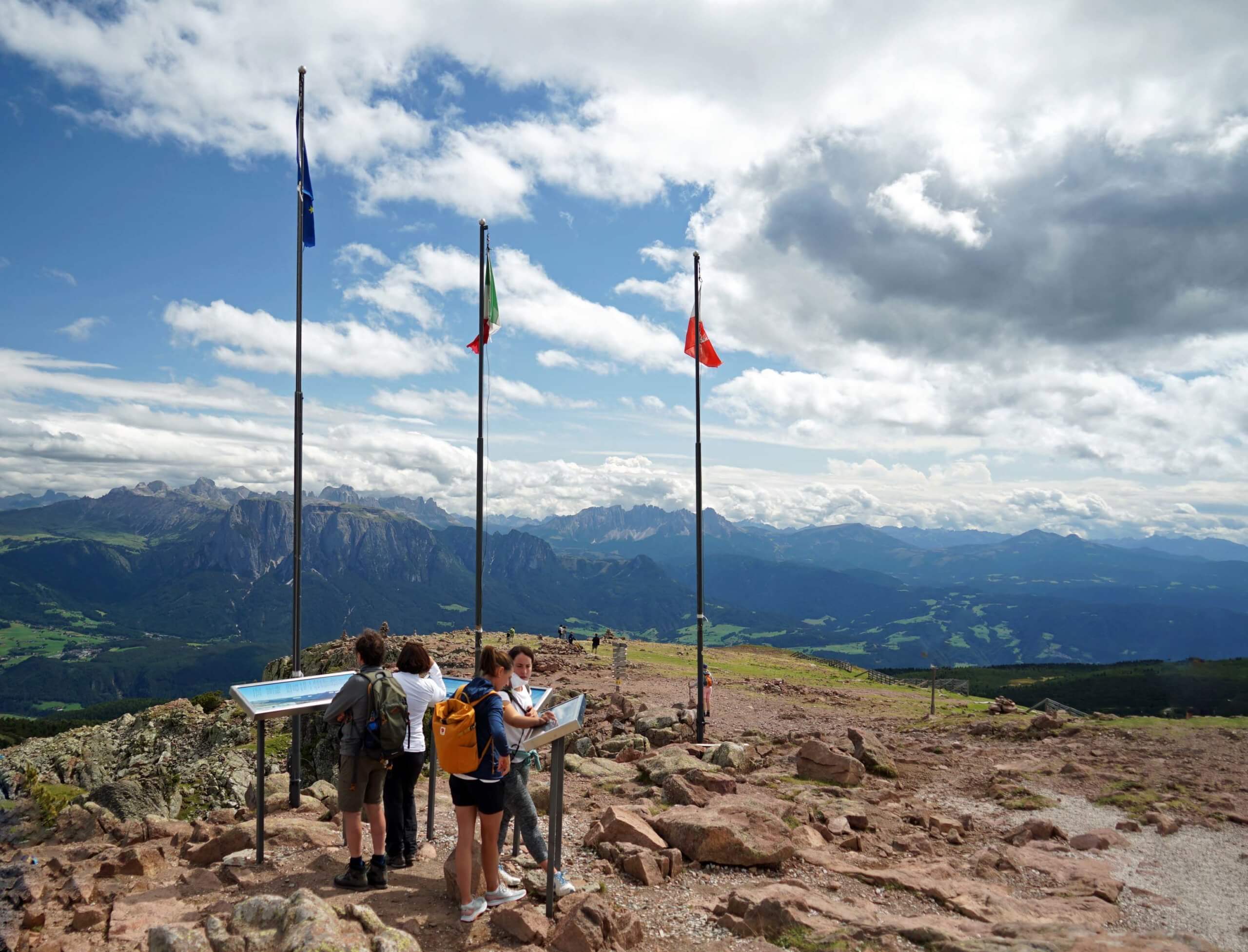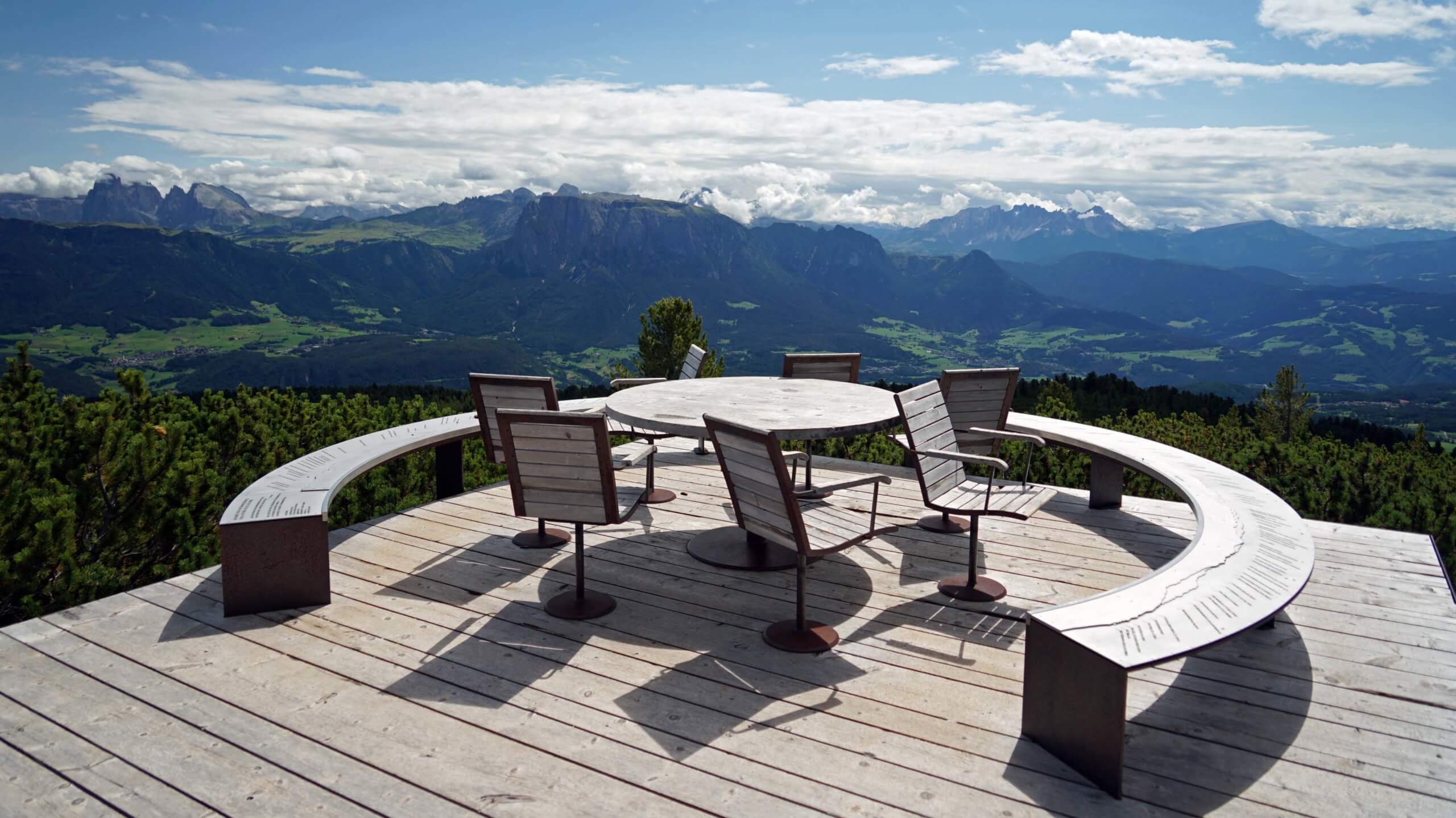 Das markante Rittner Horn mit seinen 2260 Metern ist der Sonnengipfel des Plateaus und Teil der Sarntaler Alpen. Kurze Orientierung an der Bergstation und los geht’s. Ich wähle den ‚Panoramarundweg‘, der mich zunächst abwärts bis zum Aussichtspunkt ‚Runder Tisch‘ führt. Der Weg erfüllt alle seine Versprechungen! Hier und schon vorher habe ich einen grandiosen Ausblick auf das UNESCO Weltnaturerbe der Dolomiten. Bei sehr klarem Wetter sind hier über vierzig 3000er Alpengipfel zu sehen. Gut kann ich den Schlern, den Peitlerkofel und den Rosengarten erkennen. Auch ein Blick in die restlichen Sarntaler Alpen ist möglich. Ich verweile eine Zeitlang, genieße die Ruhe, die Weite und das hammermäßige Bergpanorama.