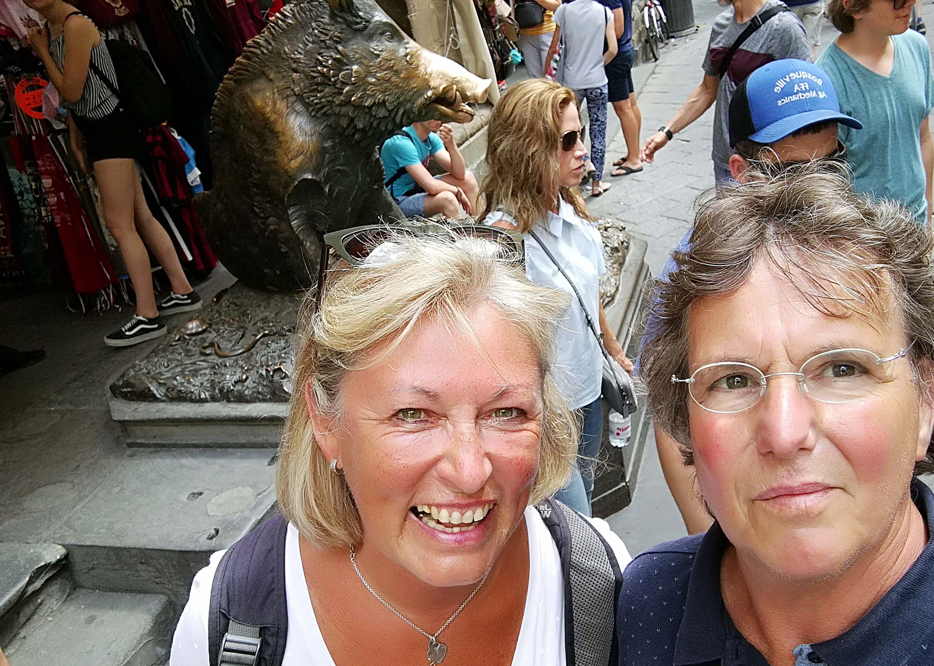 Wir starten kurz nach Elf mit den Rädern ins historische Zentrum von Florenz, der Kultur-Hauptstadt der Toskana. Das Wetter berappelt sich, will heißen, es scheint ab und zu die Sonne. Heute feiern wir den ganzen Tag unseren achten Jahrestag!