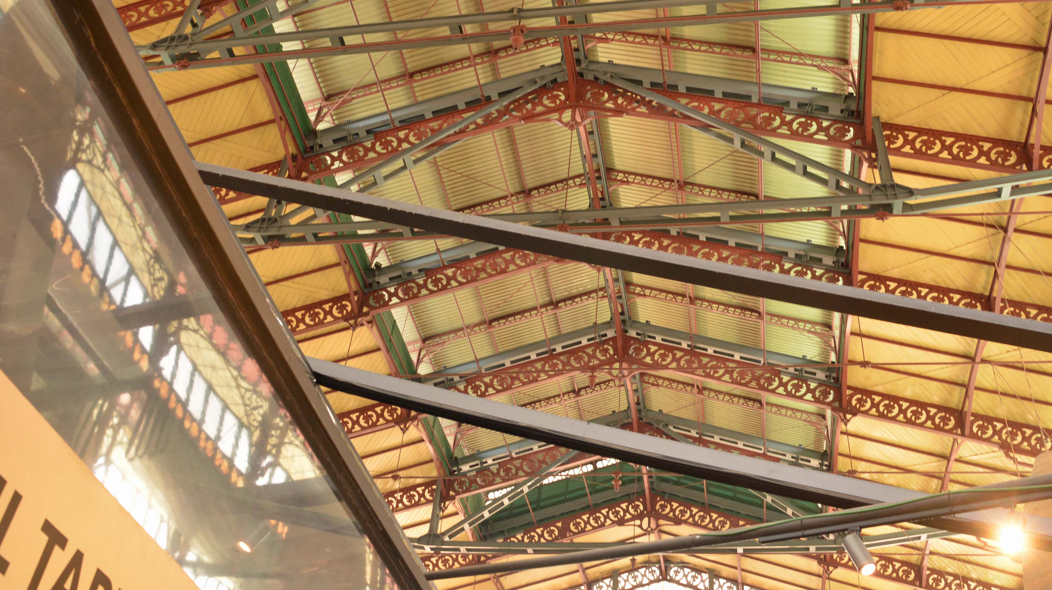 Die schmiedeeiserne Dachkonstruktion der Halle von 1874 ist sehenswert. Hier suchen wir zielstrebig den ‚Genuss-Tempel‘ im 1. Stock auf, schlabbern Prosecco und atmen erstmal durch.