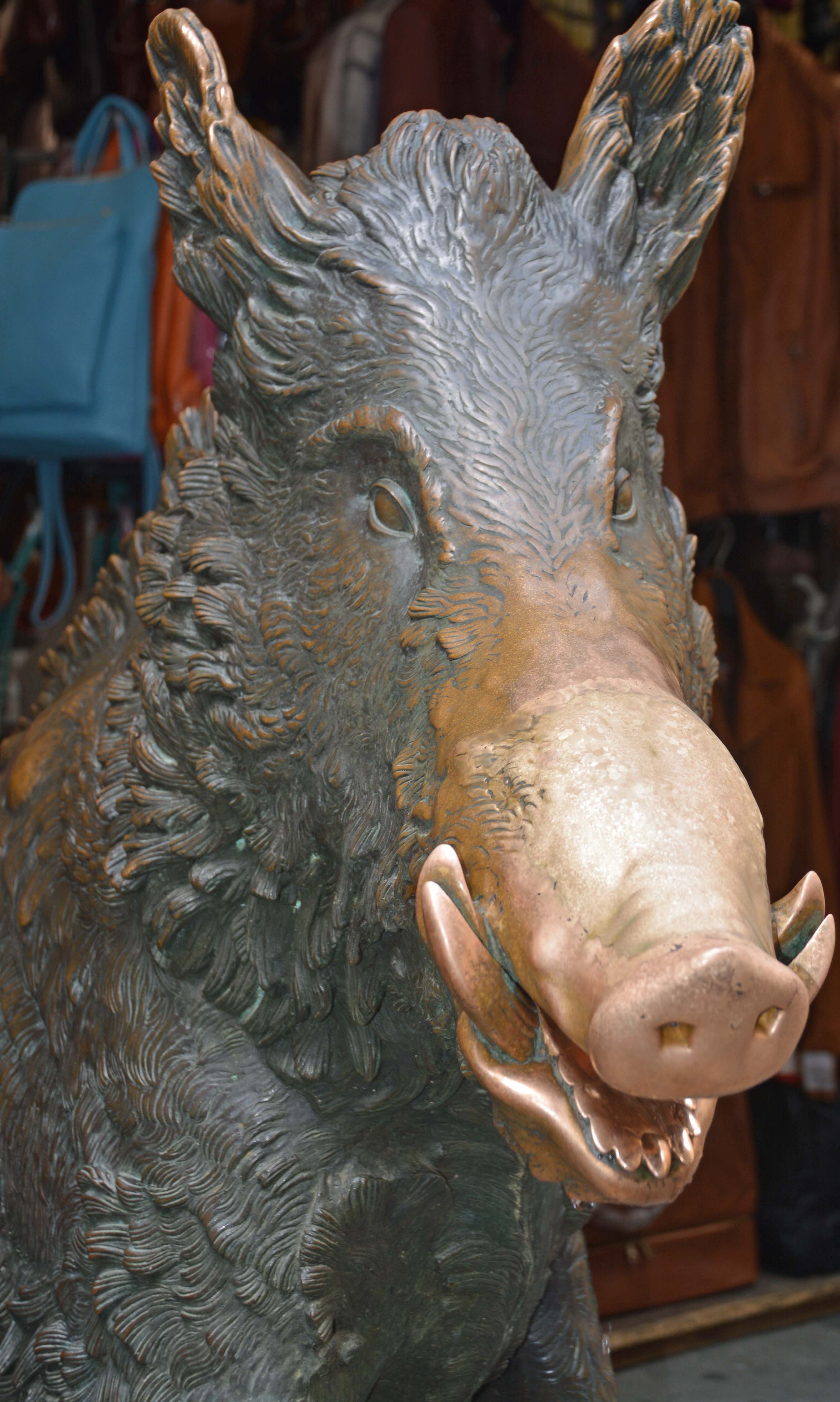 Wir erreichen auf der weiteren ‚Flucht‘ den ‚Mercato Nuovo‘, der sich in einer Loggia mit 20 Säulen und 12 Gewölben befindet. Uns interessiert aber nur ‚Porcellino‘, ein bronzenes Wildschwein aus dem 17. JH. Es soll Glück bringen, wenn man seine Nase rubbelt. Das ist der Grund für seine blitzeblanke Nase.