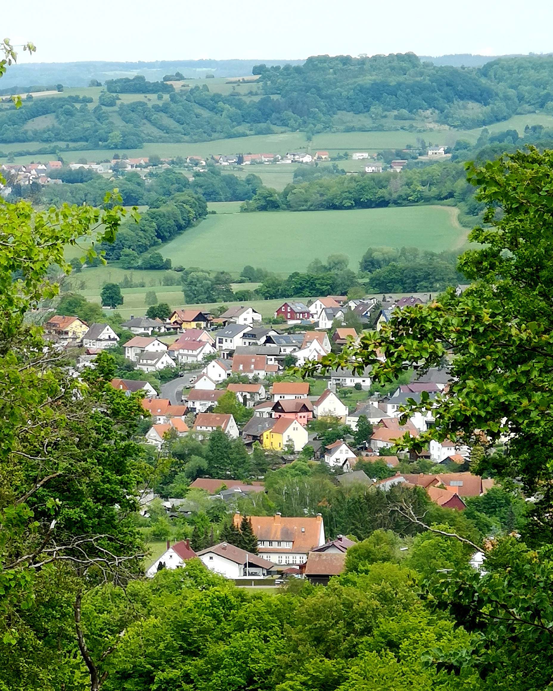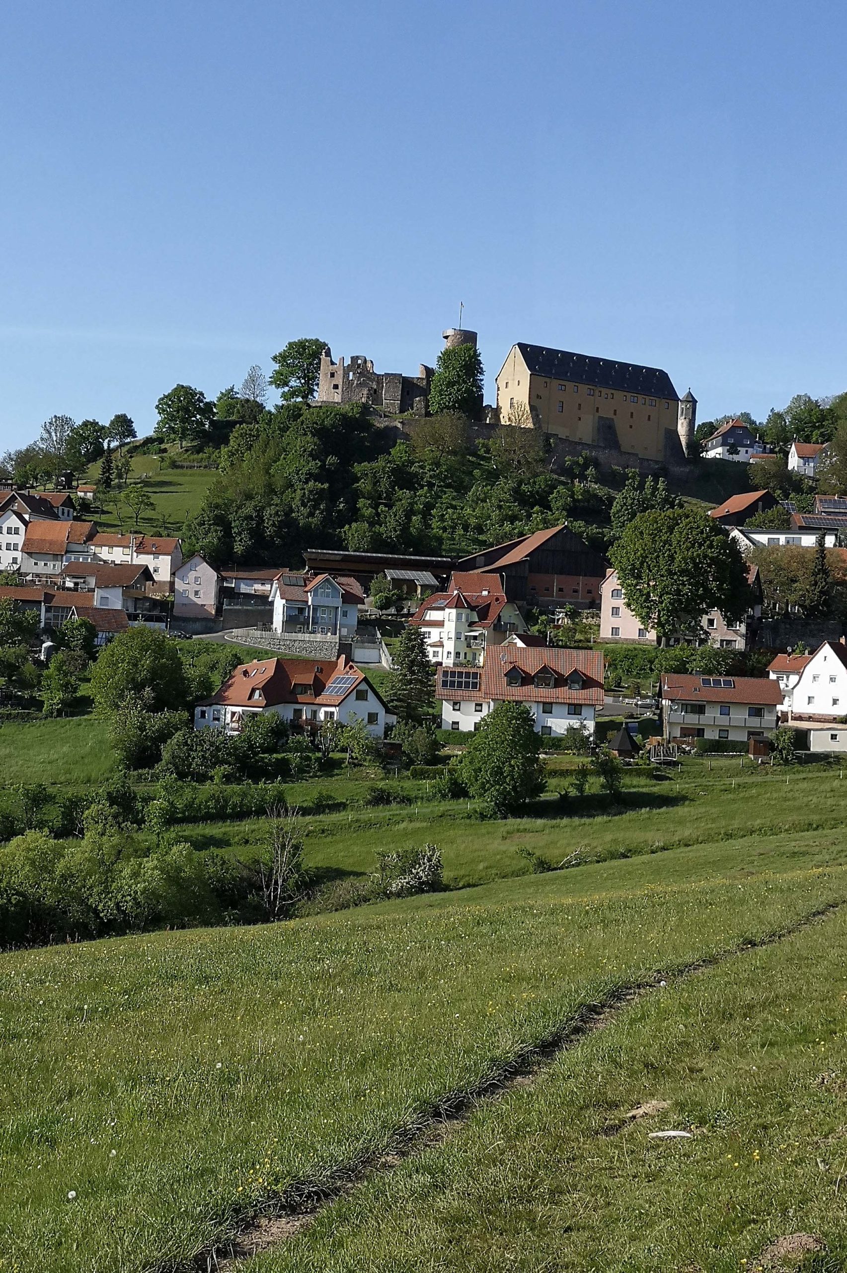 Jetzt zeigt Thomas mir ein weiteres Highlight aus der Gegend, die Burg Schwarzenfels. Es ist eigentlich keine Burg sondern eine Ruine auf einer 427 m hohen Anhöhe. Die romantische Lage bietet eine hervorragende Fernsicht in den nördlichen Spessart und die nahe Rhön. Leider können wir die nur eingeschränkt genießen, denn der Turm ist wegen Corona gesperrt. Erbaut wurde die Burg im 13.Jahrhundert von den Grafen zu Hanau. Ihren Namen verdankt sie dem schwarzen Basalt des Hopfenberges. Wir durchstöbern intensiv die Ruinenteile und ich freue mich total, dass ich mal wieder meiner Leidenschaft frönen kann, Neues zu entdecken. Corona macht es mir da nicht leicht.