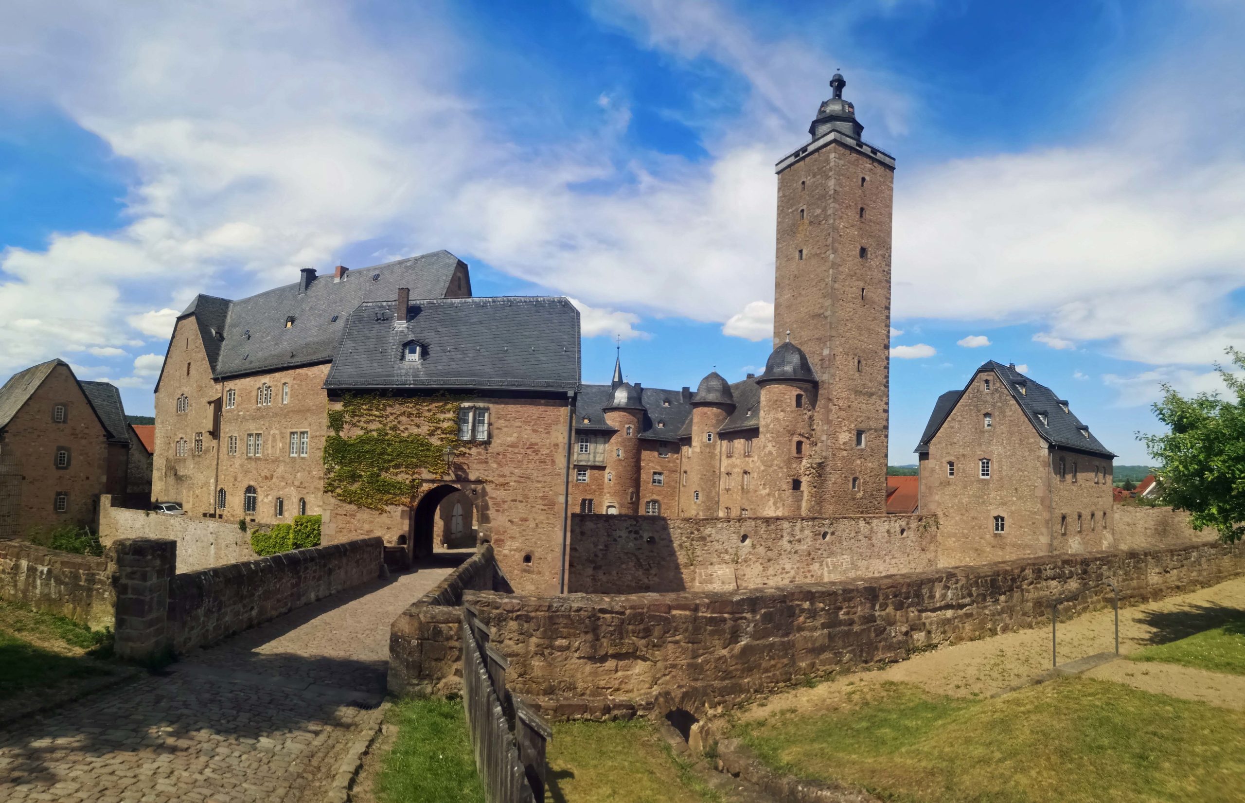 Ein Juwel ist das Renaissanceschloss Steinau, ehemals Nebenresidenz der Grafen von Hanau. Über der Burg thront ein mächtiger Bergfried aus dem 13. Jahrhundert. Auch hier wieder genießen wir wunderbare Blicke auf die umliegenden Dörfer.