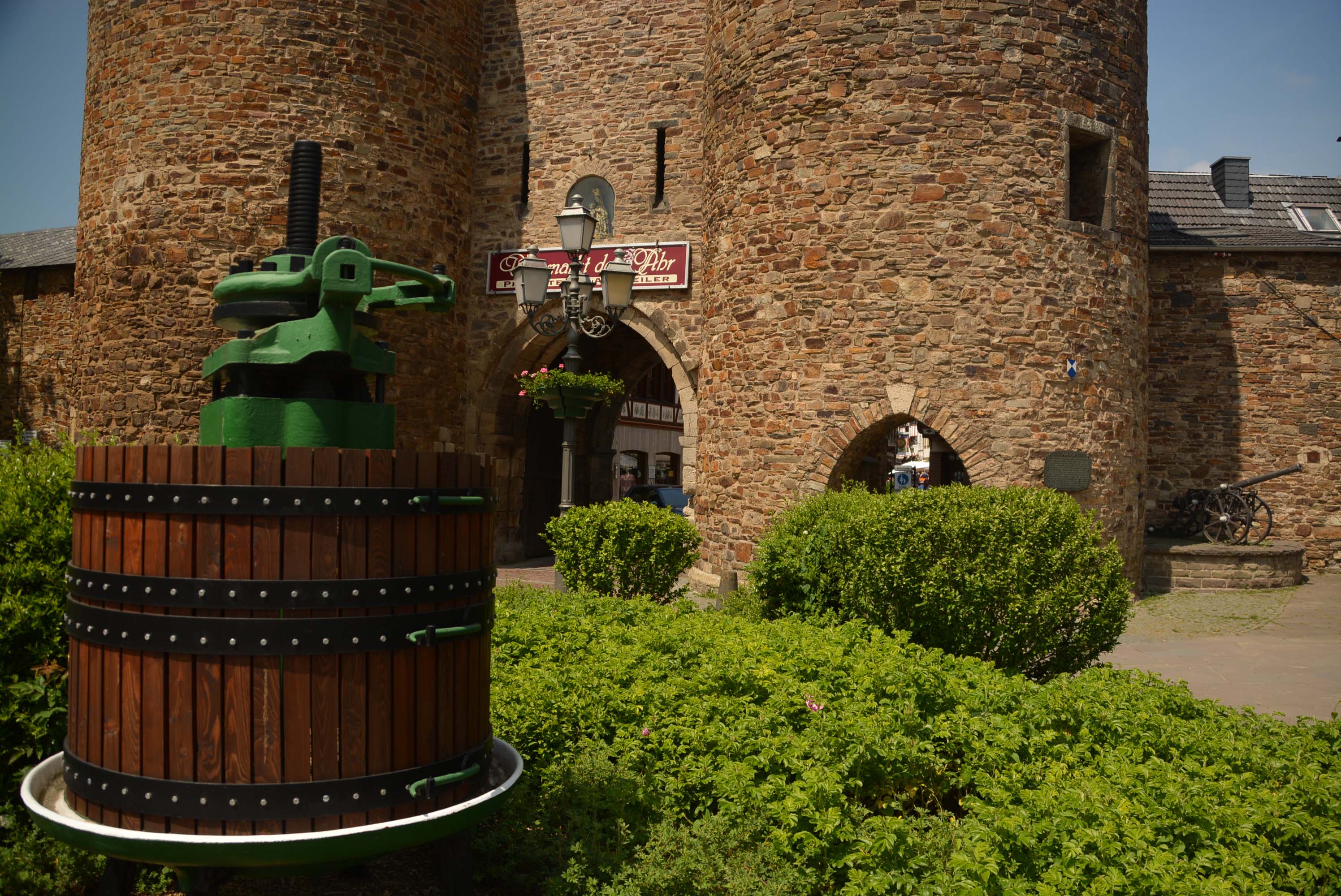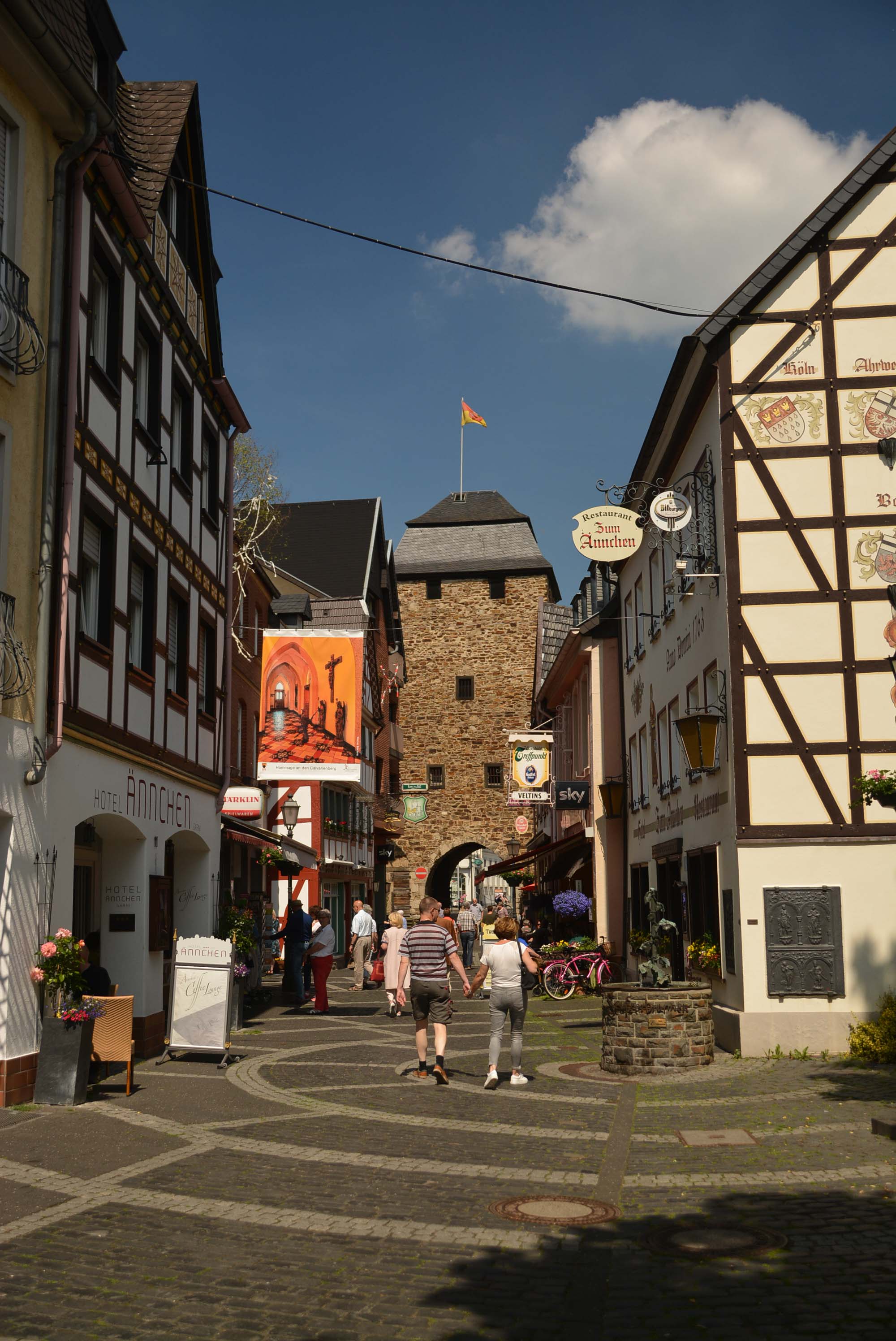 Kurz vor dem mittelalterlichen Stadttor ‚Oberes Tor‘ prangt das Kloster Calvarienberg von 1630 in exponierter Lage, heute Schule und Kindergarten. Wir parken die Räder in Ahrweiler an der alten Stadtmauer aus dem 13. Jahrhundert und bummeln durch die Gassen mit ihren reich verzierten Fachwerkhäusern.